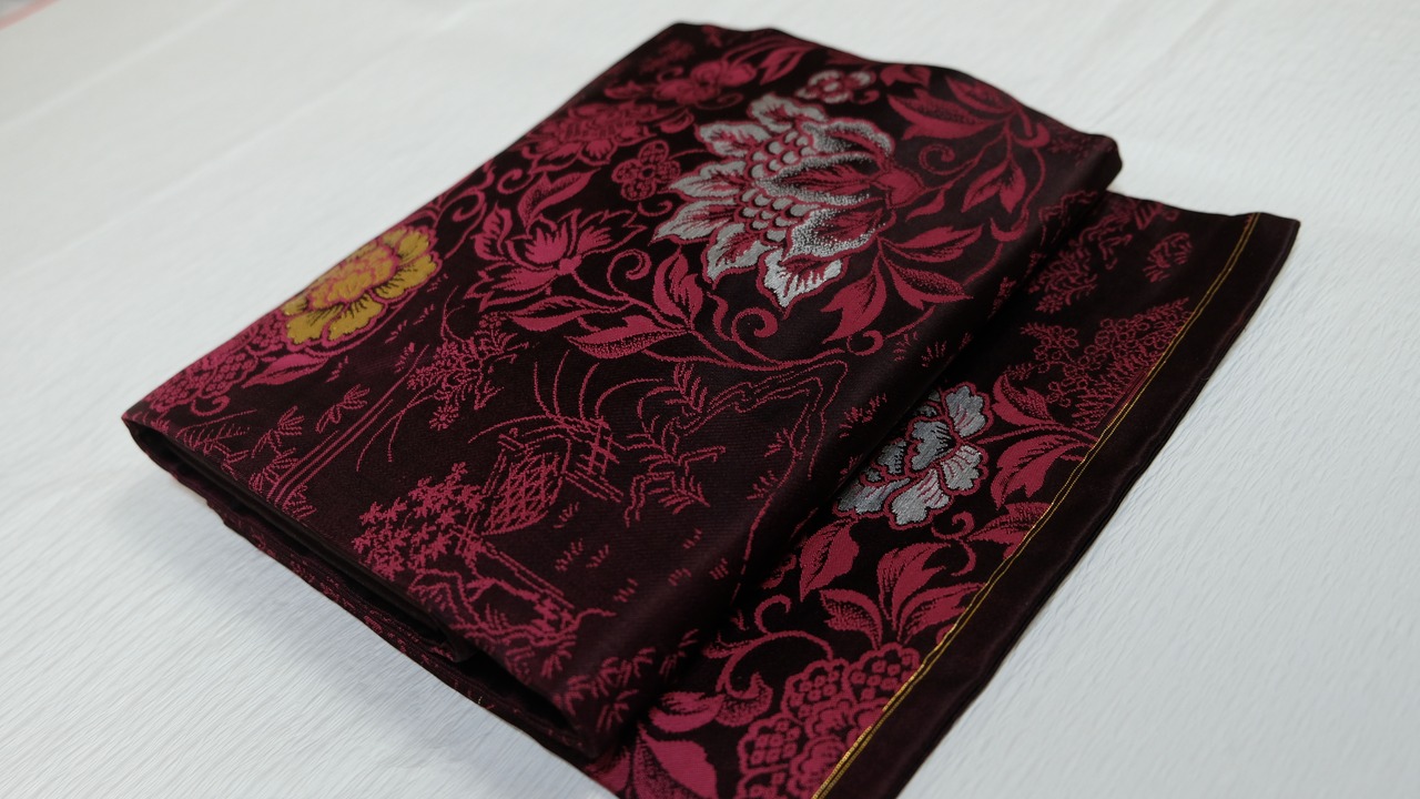 深みのある綺麗なワインレッドの地色に、金糸や銀糸で華やかな牡丹の花が描かれた名古屋帯。