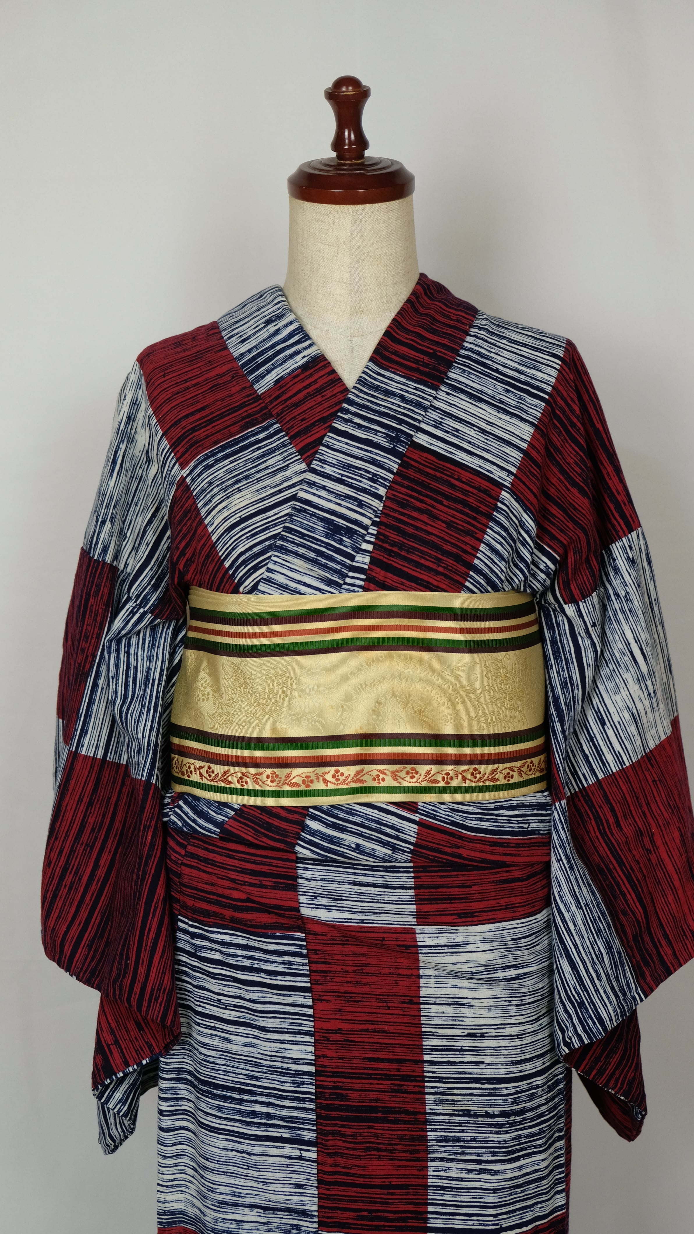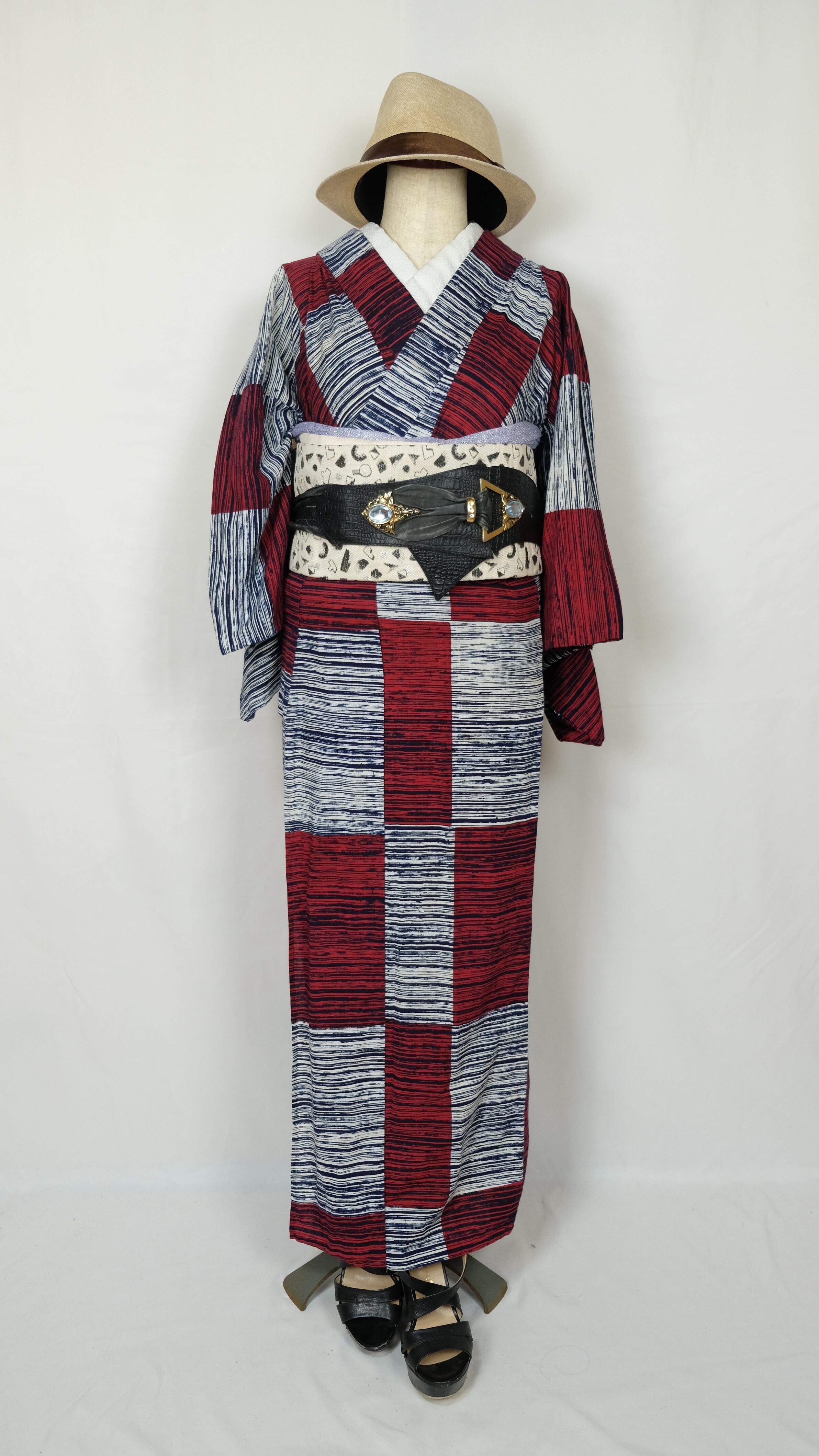 赤×白の市松模様に紺の横線|モダンで粋な印象の浴衣 – コーデの幅が広がるNEOキモノスタイルに