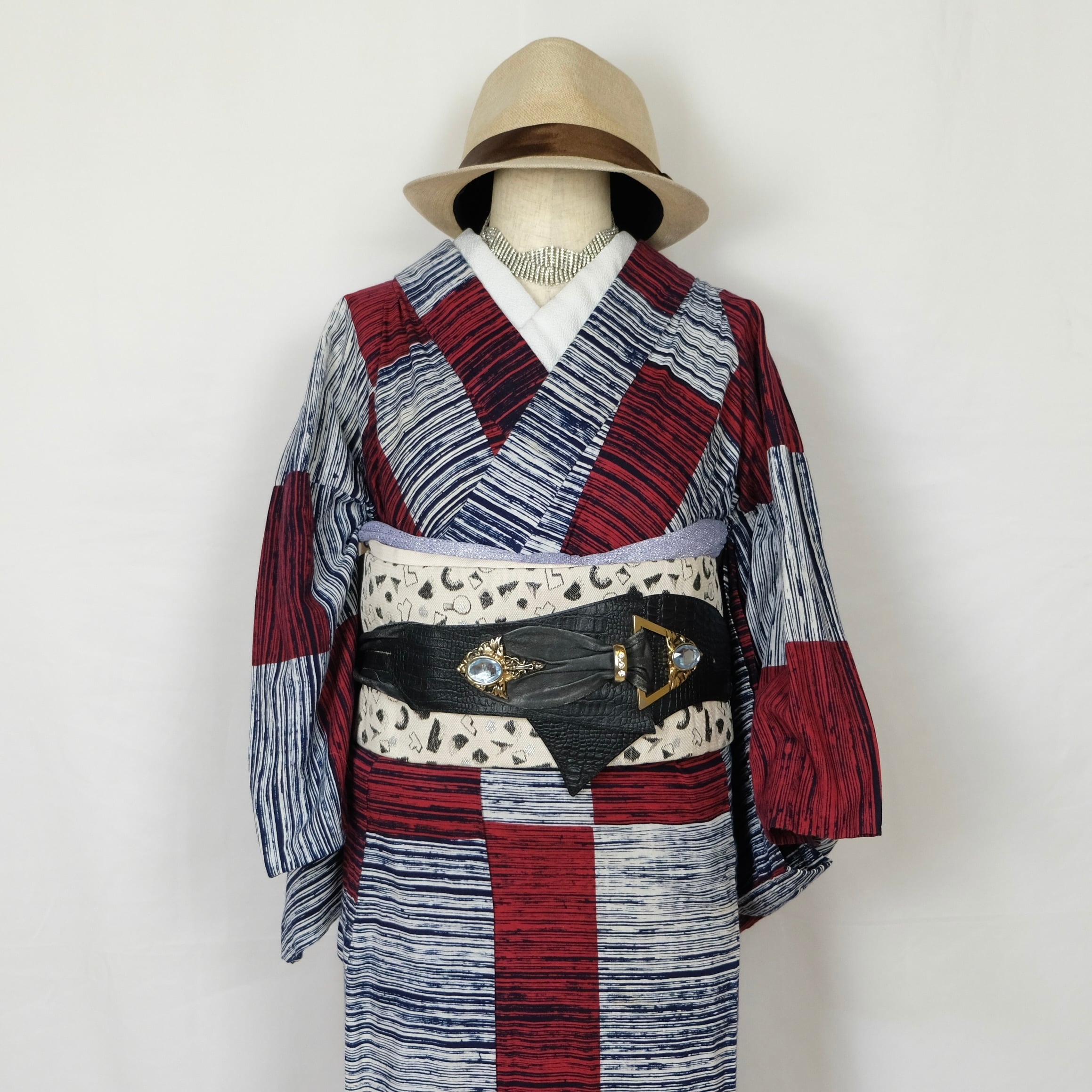 コーディネート例としては、白地に細かな柄の名古屋帯とアンティークのベルトを合わせて、シャープで個性的なNEOキモノStyleに。あるいは、クリーム地に緑と赤の縞模様の半幅帯を合わせて、落ち着いた印象の浴衣らしいコーディネートも◎。どちらもこの浴衣ならではの自由なアレンジが楽しめます。参考にしてみてくださいね。