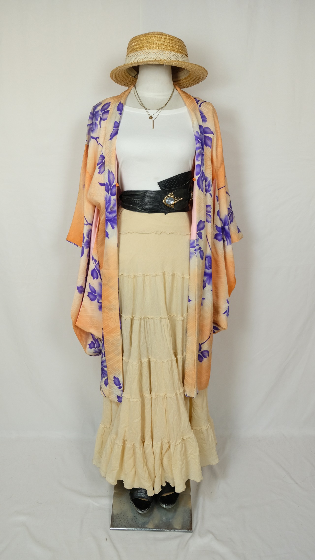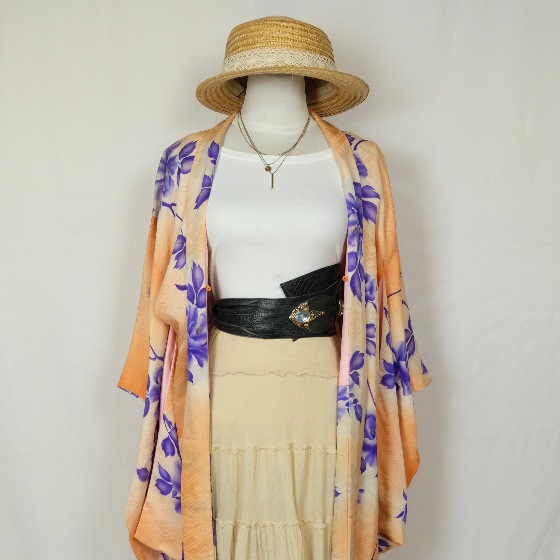 綺麗なオレンジのグラデーション生地に、大きく紫の椿柄が描かれた豪華なアンティークの長羽織です。柔らかく軽やかな質感が特徴の、アンティークならではの正絹の触り心地がとても気持ち良いです。地模様に紗綾形が織られています。