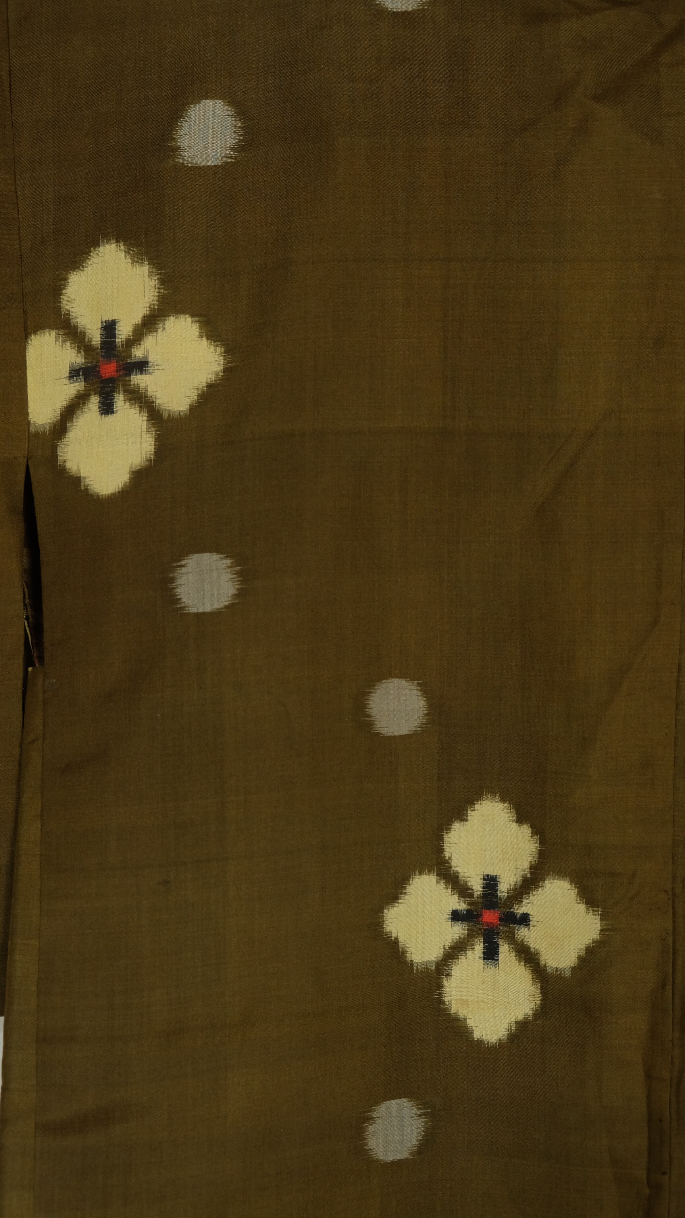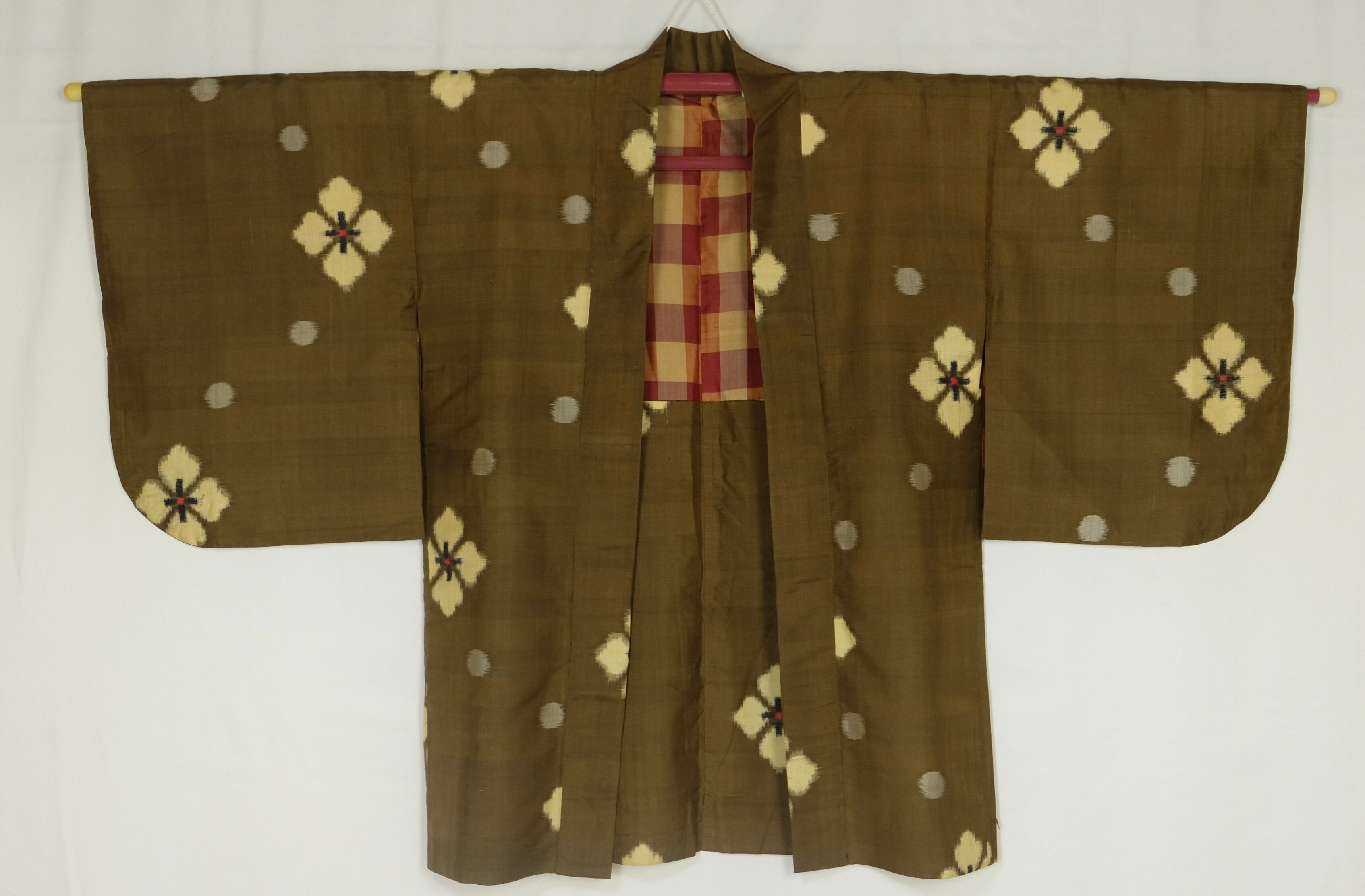 深みのあるカーキ色をベースに、白抜きで花菱紋様が全体にデザインされた、アンティーク銘仙の羽織です。