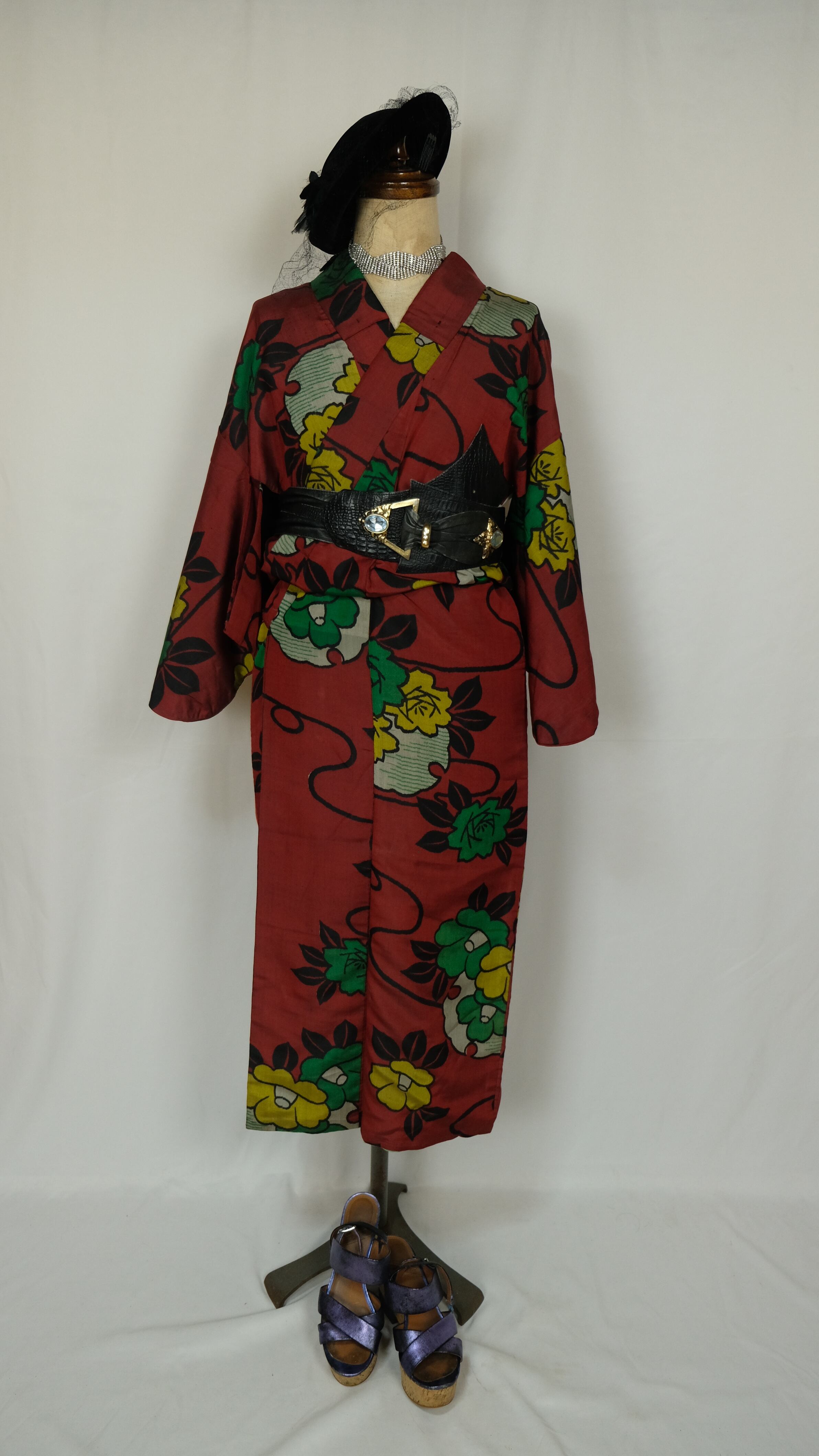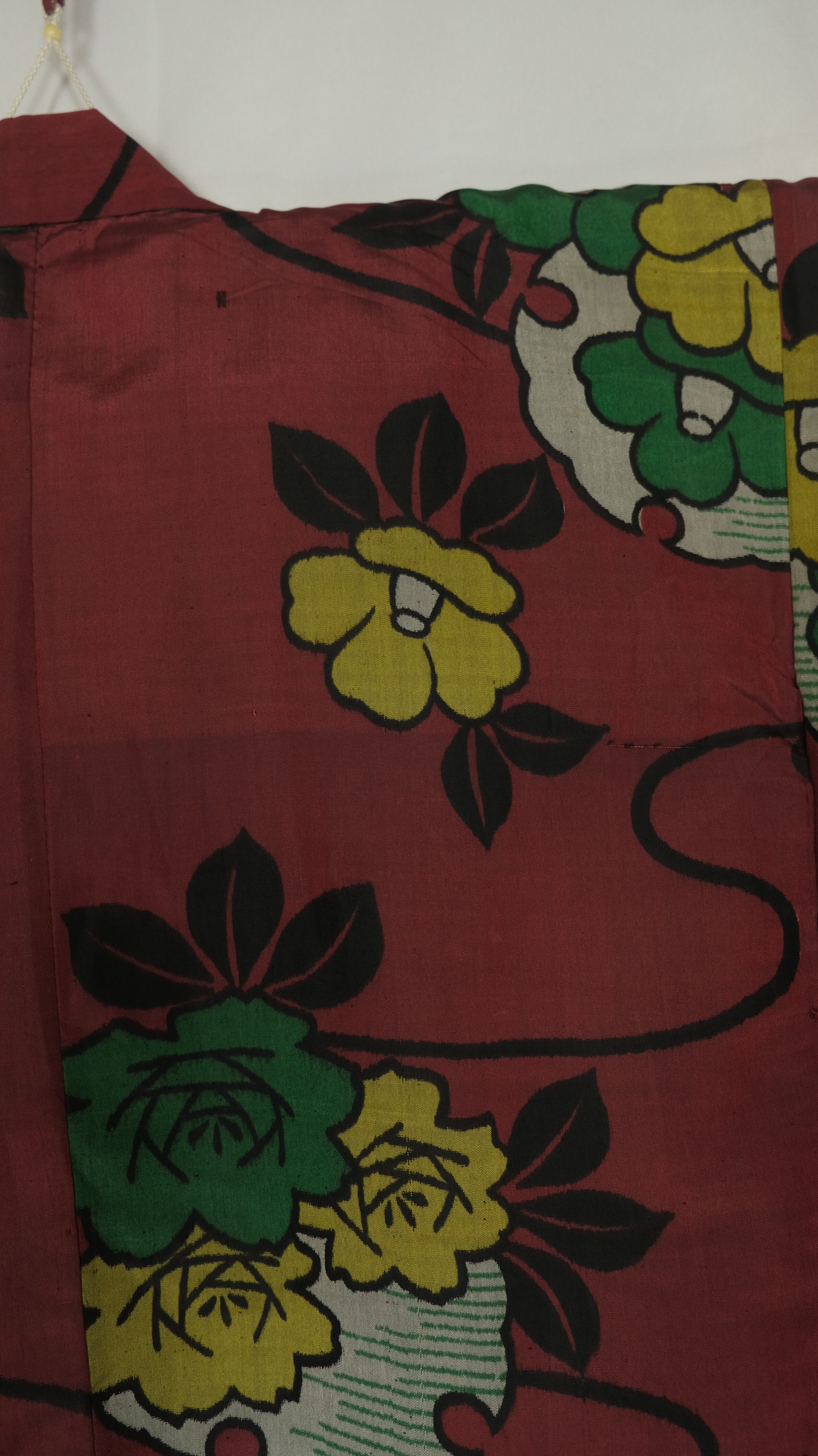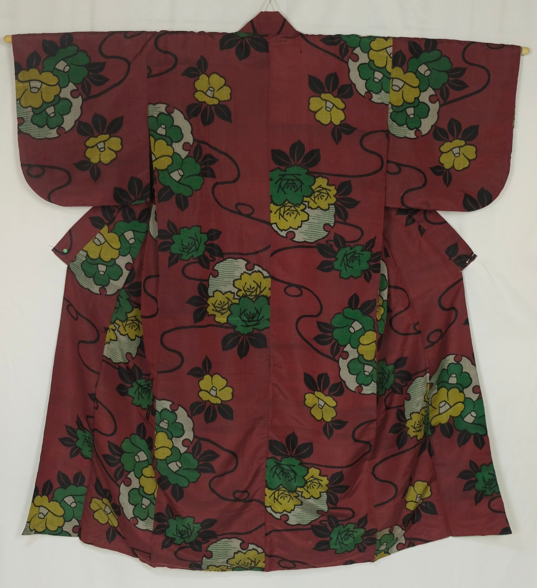 深い赤をベースに、落ち着いた黄色と深緑の椿が浮かぶように描かれたアンティークの銘仙着物です。