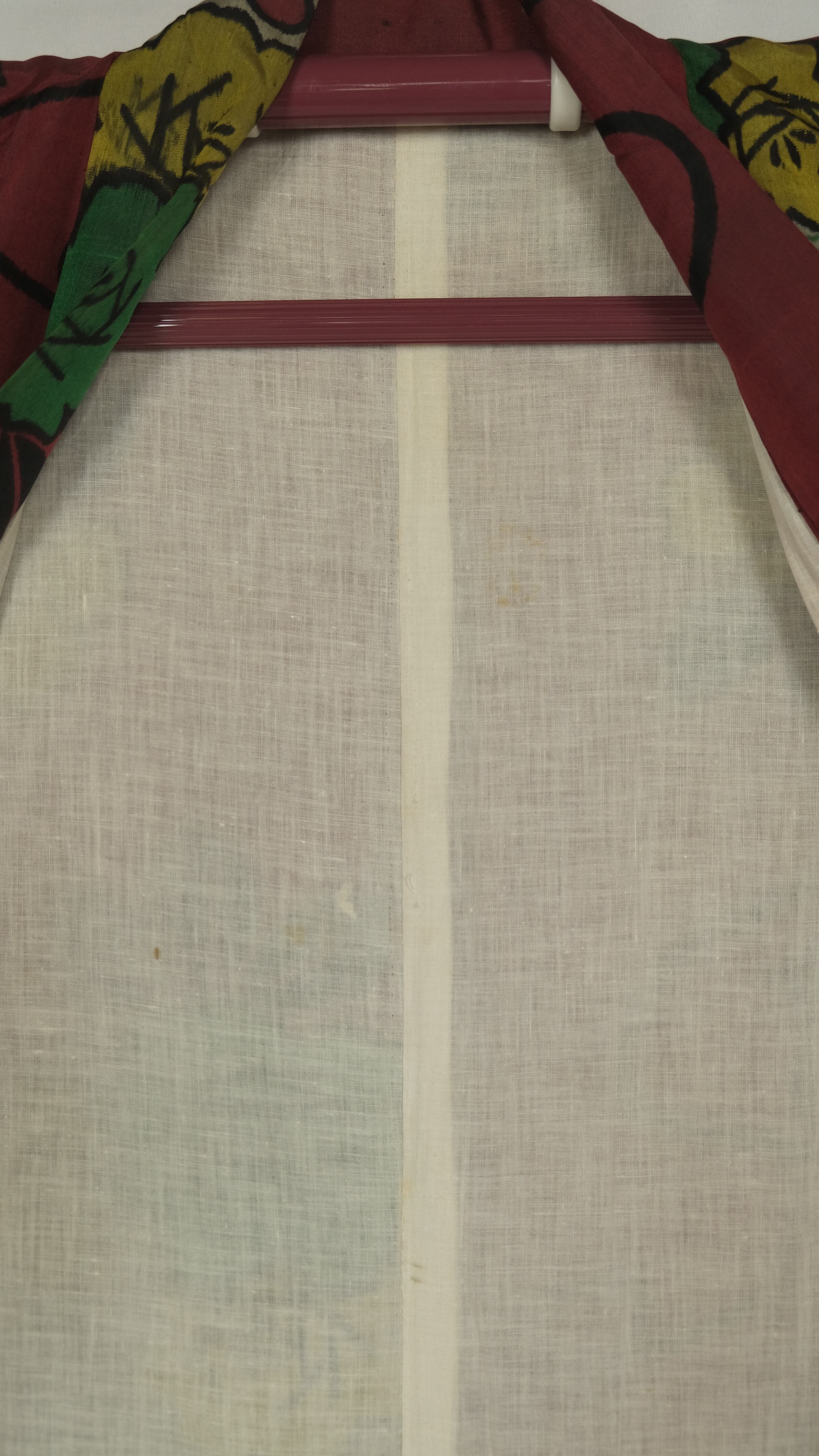 目立つ大きなシミなどは見受けられませんが、生地全体に経年によるやわらかい使用感と、ごく小さなダメージがあります。着用には問題のない程度と判断していますが、古い着物に慣れている方へおすすめします。