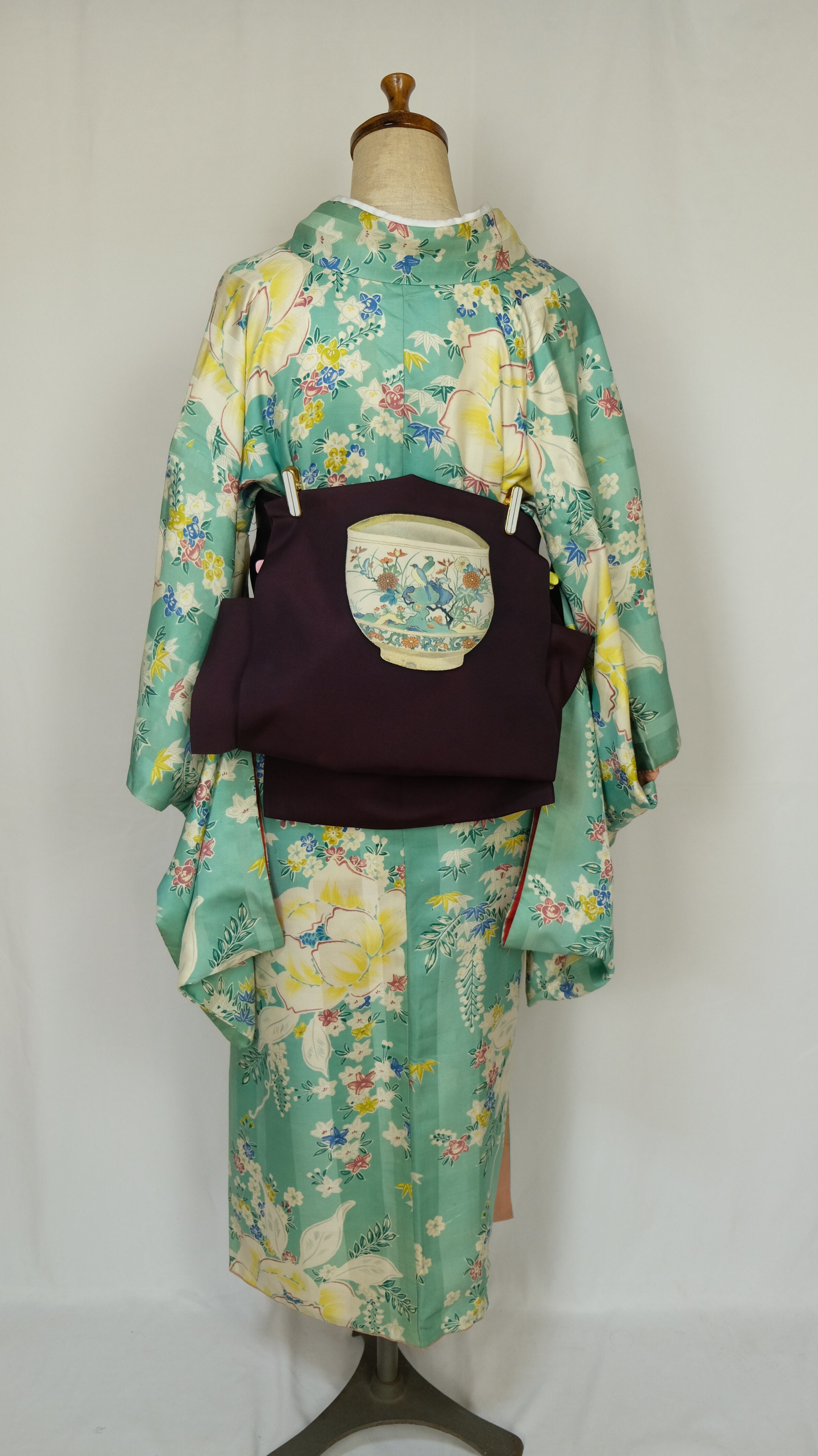 華やかな柄の着物に合わせれば、全体のトーンを整えながらもどこか落ち着いた着姿に。
