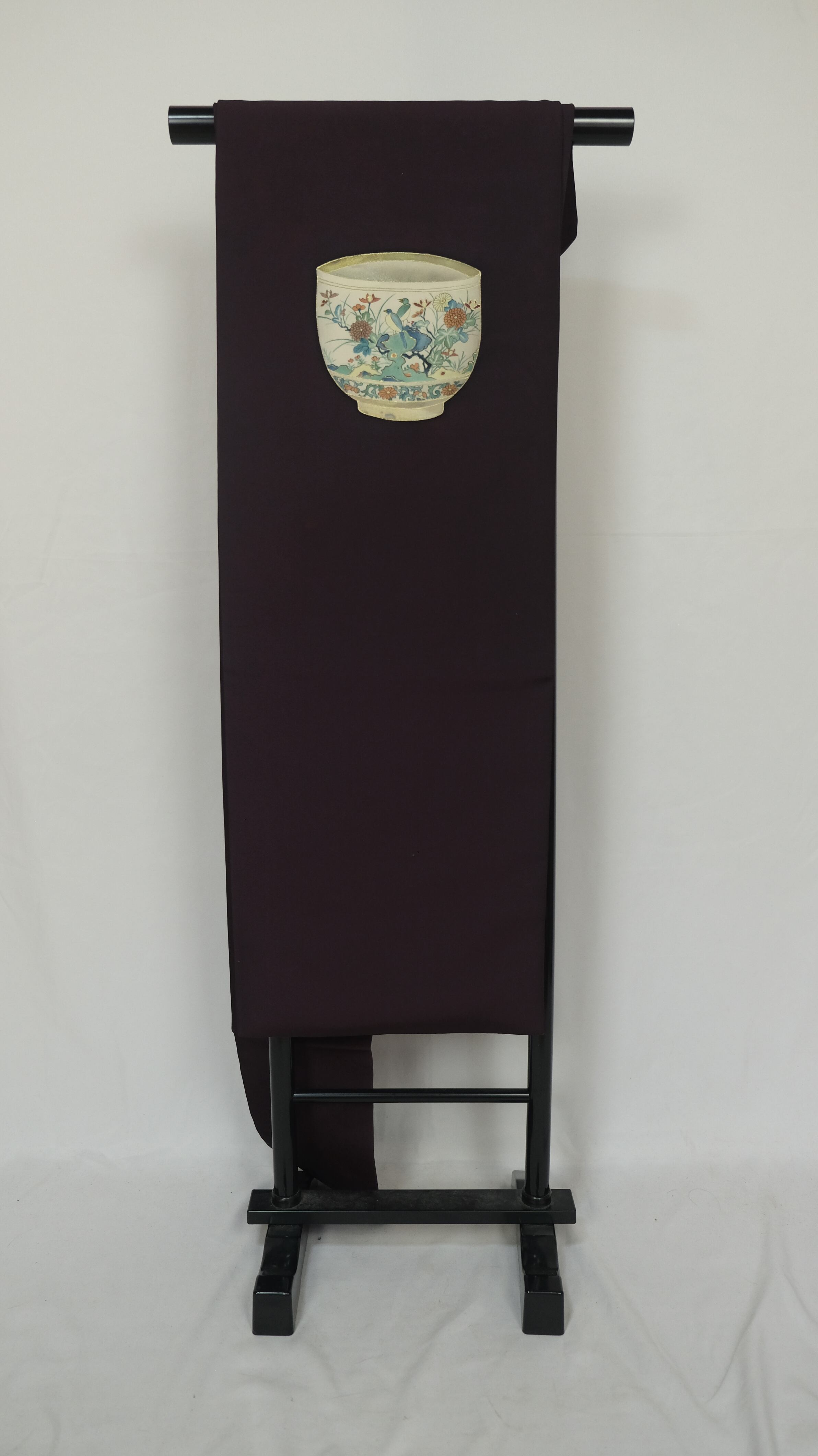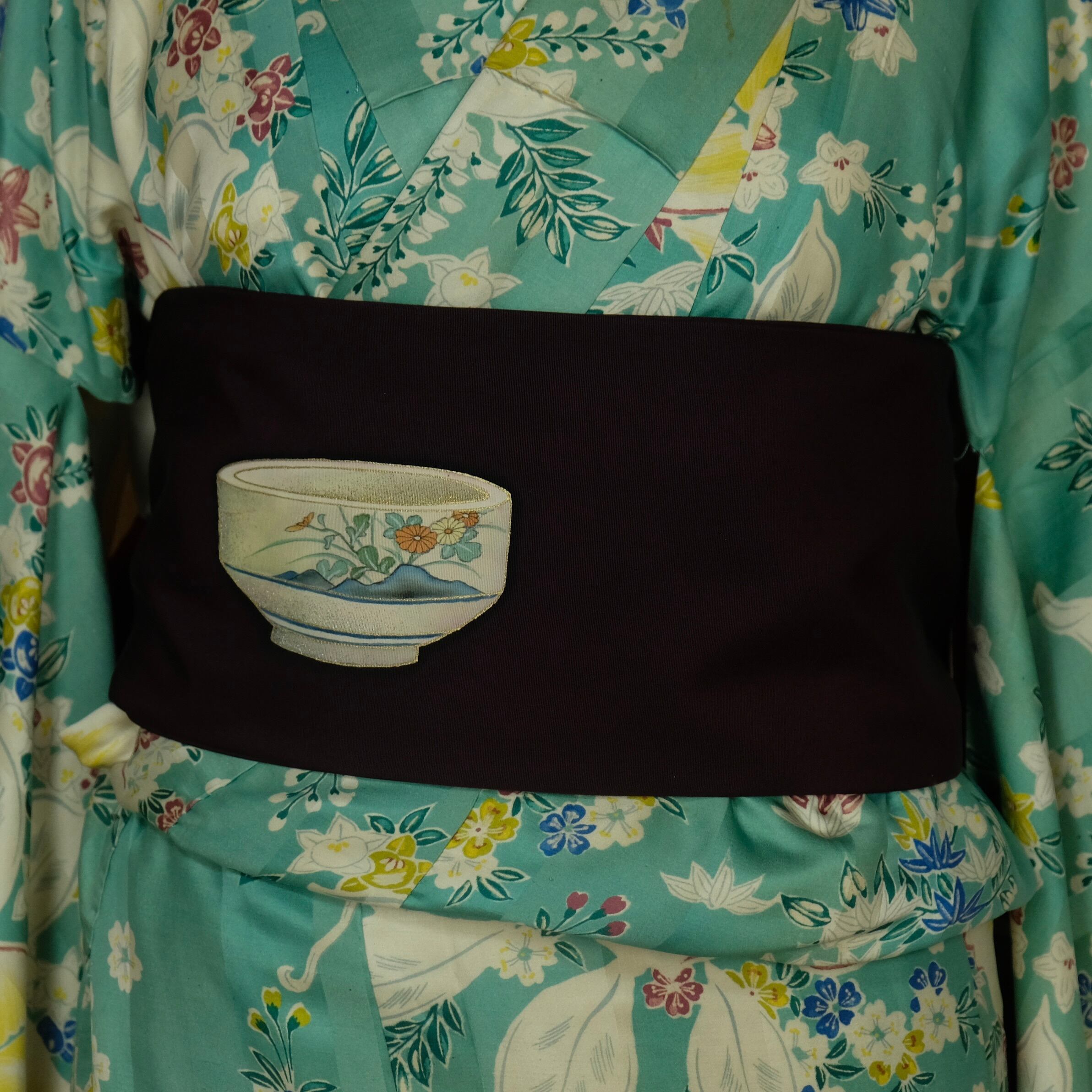 手描きの茶碗がそっと寄り添う 深紫の名古屋帯 | ワンポイント帯
