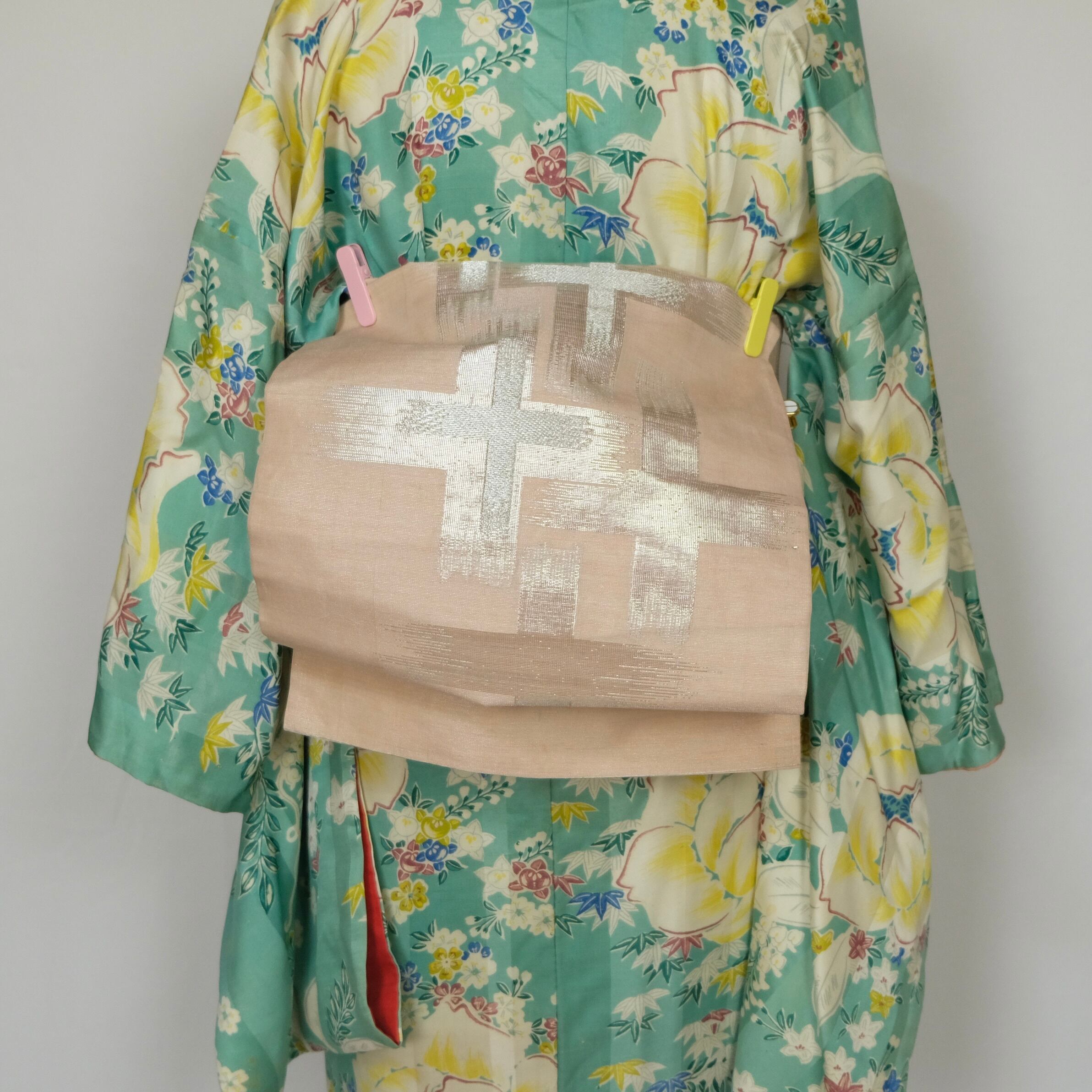 淡いピンク色の地に、銀糸でクロスが重なり合ったような柄が織りで表現された名古屋帯です。