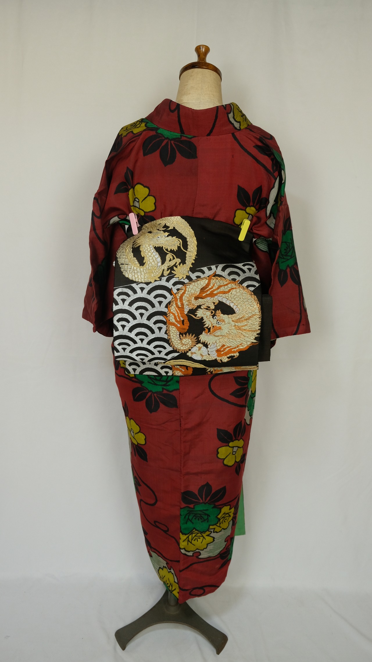 *着物も合わせて出品中です|商品名:深い赤に椿が映える、シックな華やかさのアンティーク小さめ銘仙着物