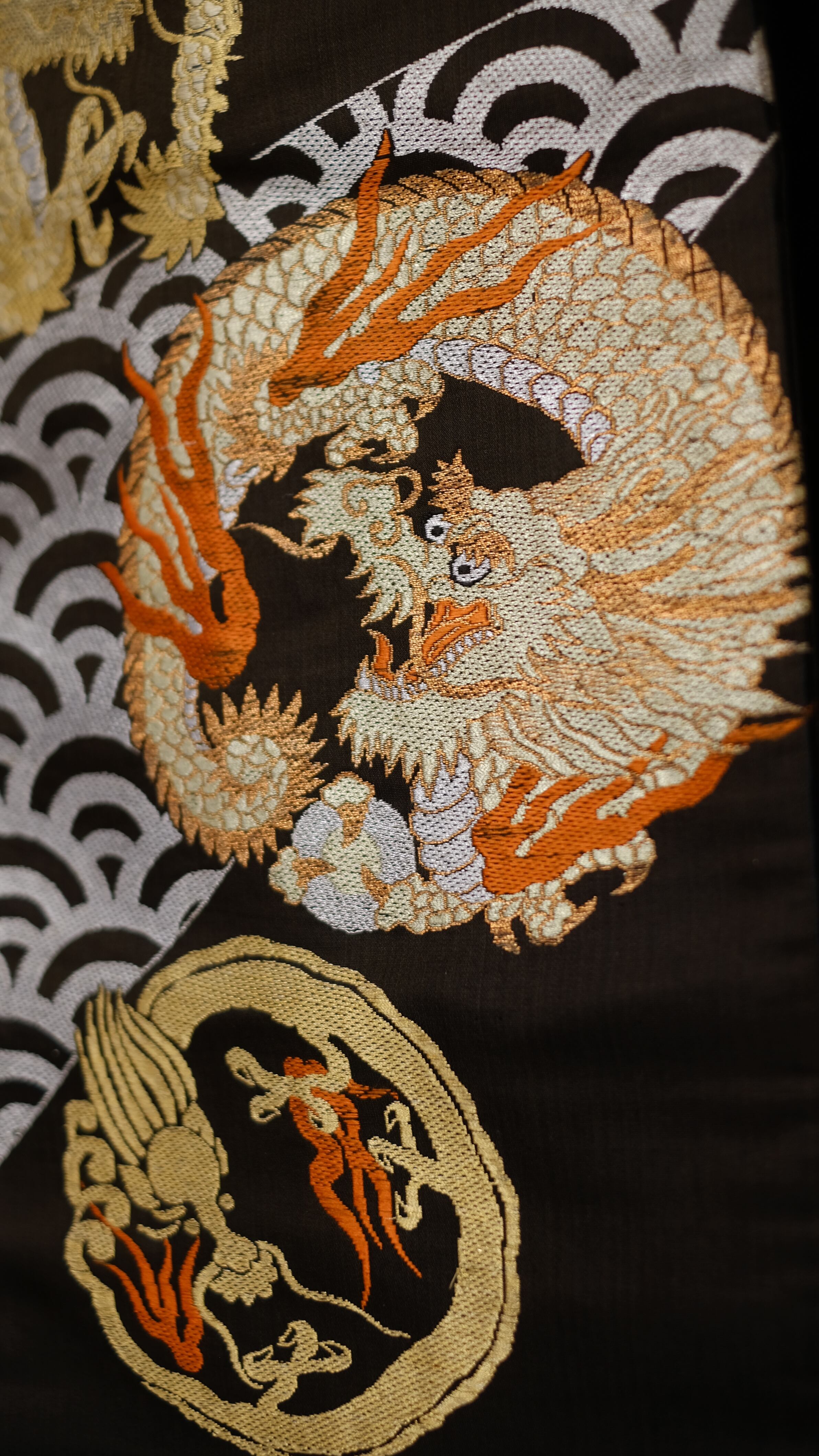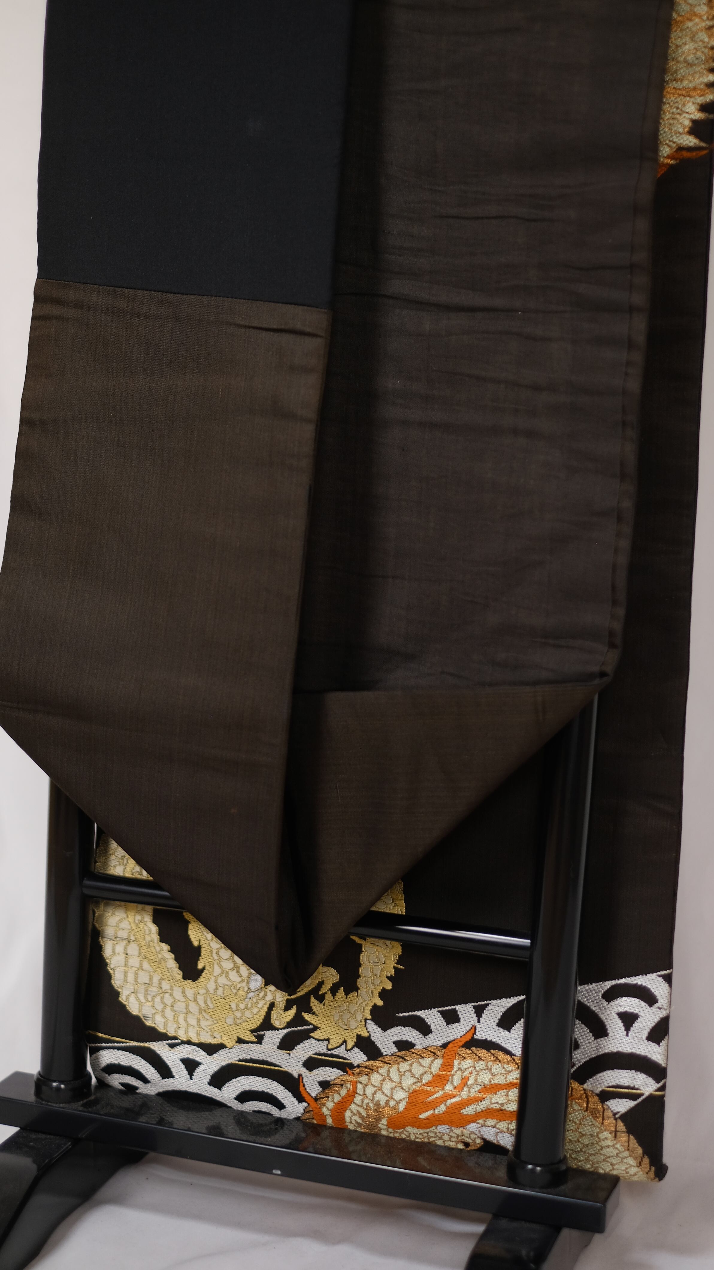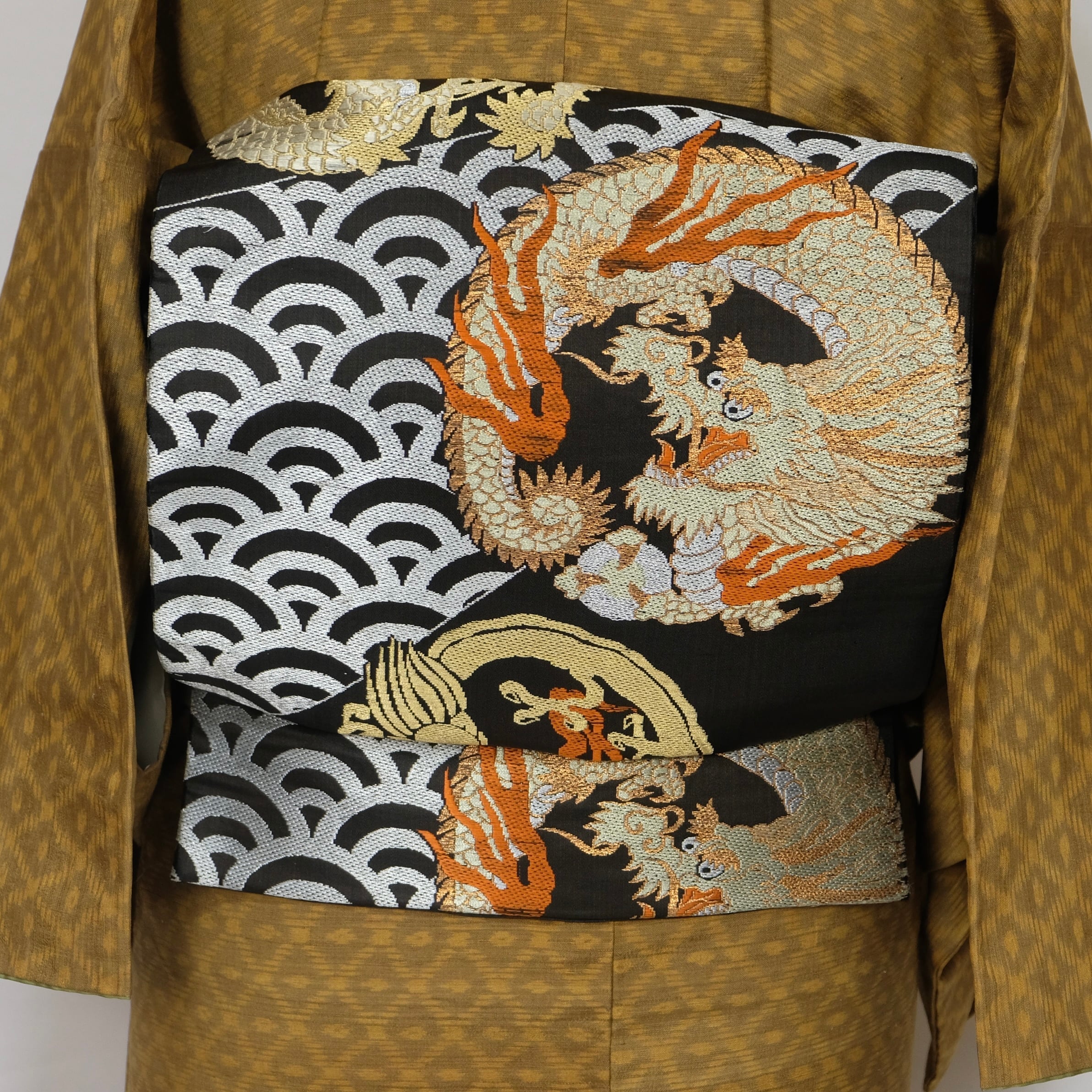 黒地に金銀糸で龍が織り出された、力強く幻想的な印象のアンティーク名古屋帯です。
