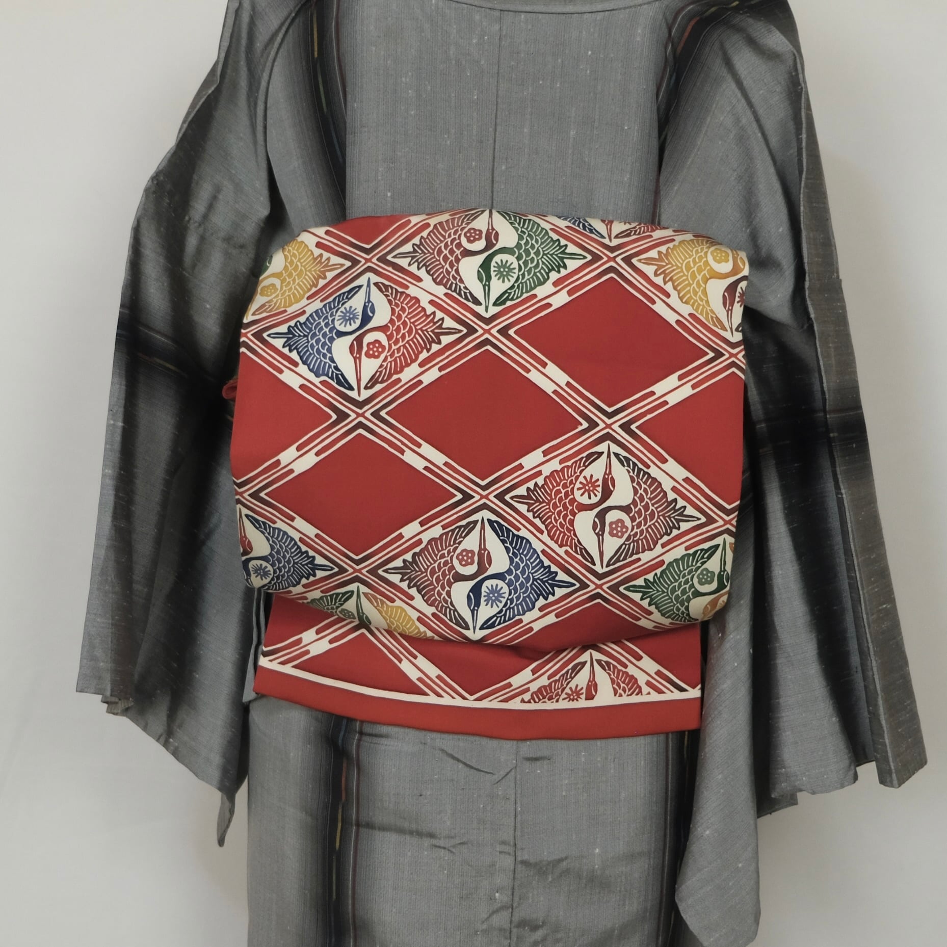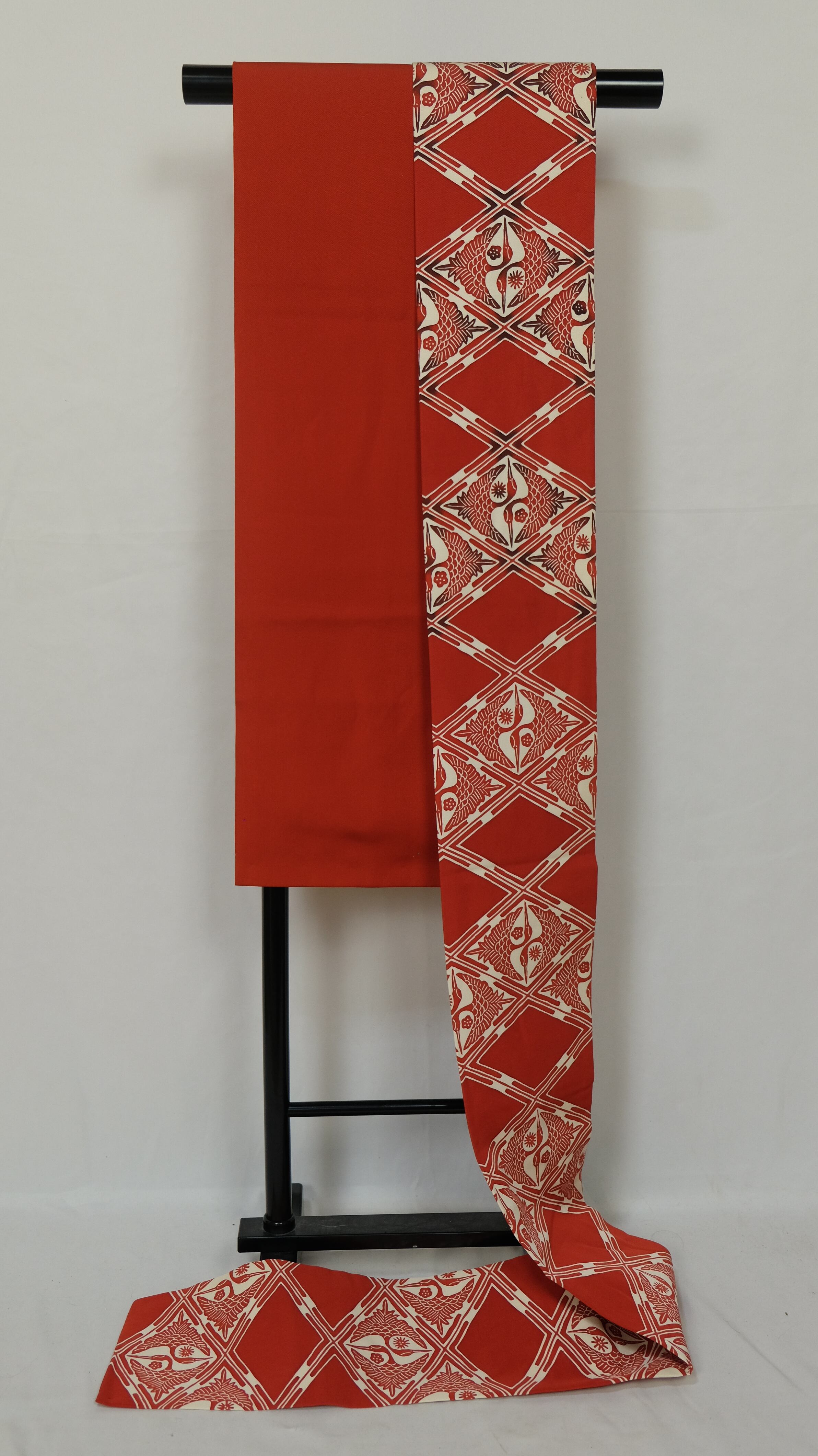 鮮やかな赤地に白抜きで菱紋様が並び、その中には向かい合わせの鶴が織り込まれた名古屋帯です。