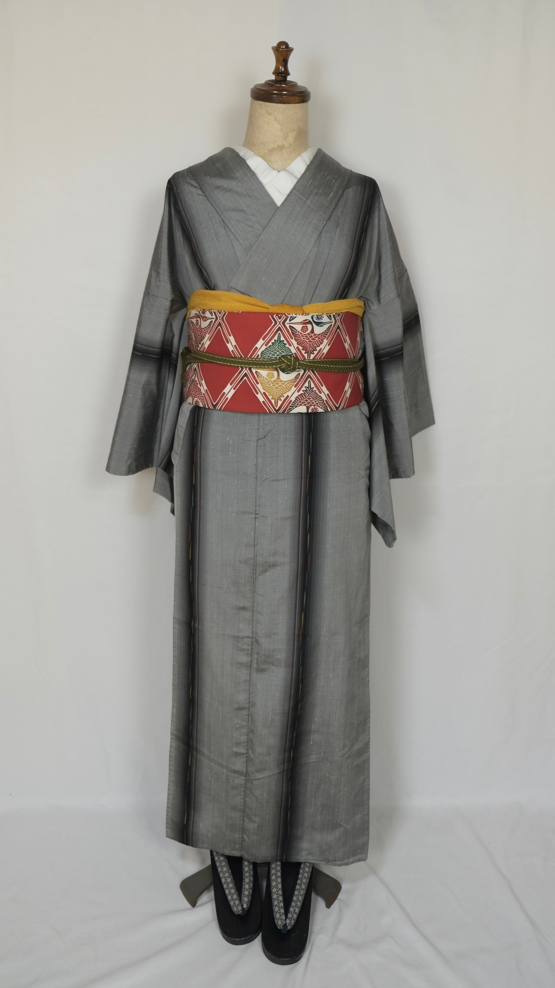 *着物は出品中です。商品名:グレー縞×五彩ライン|シンプル紬単衣着物 – 帯で遊べるNEOベーシック