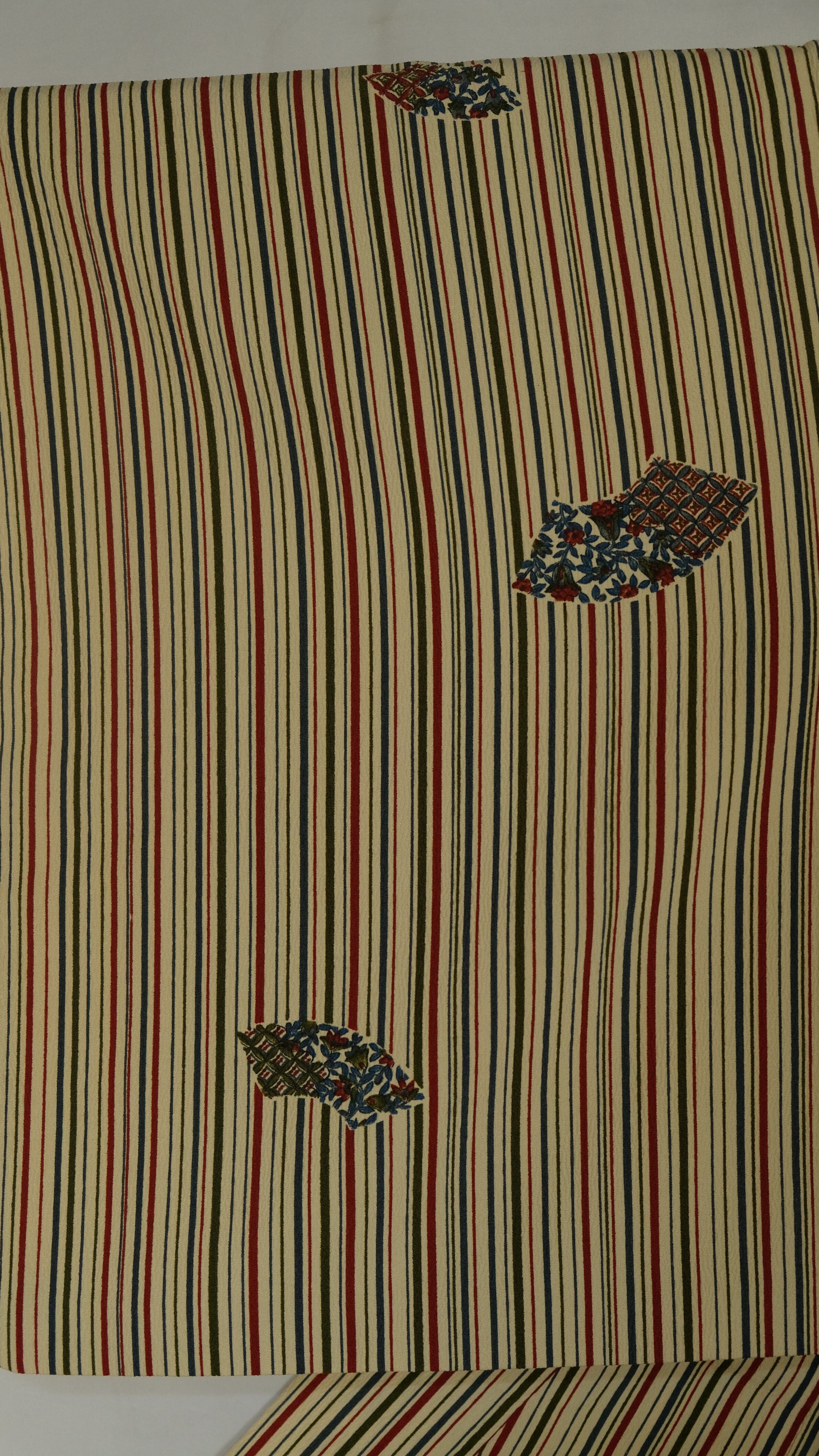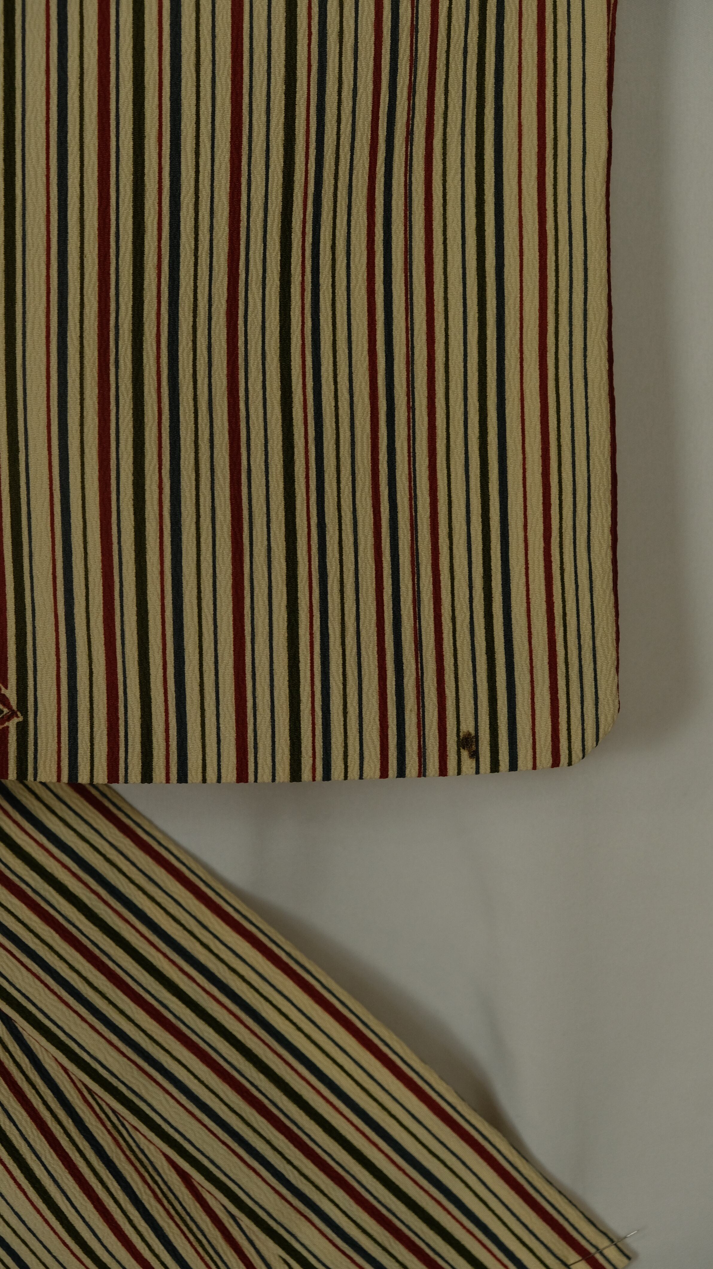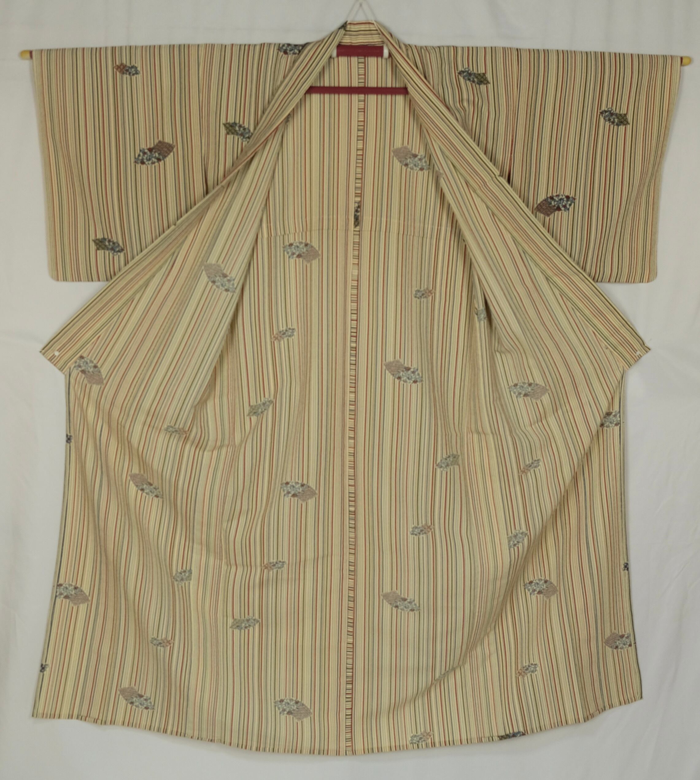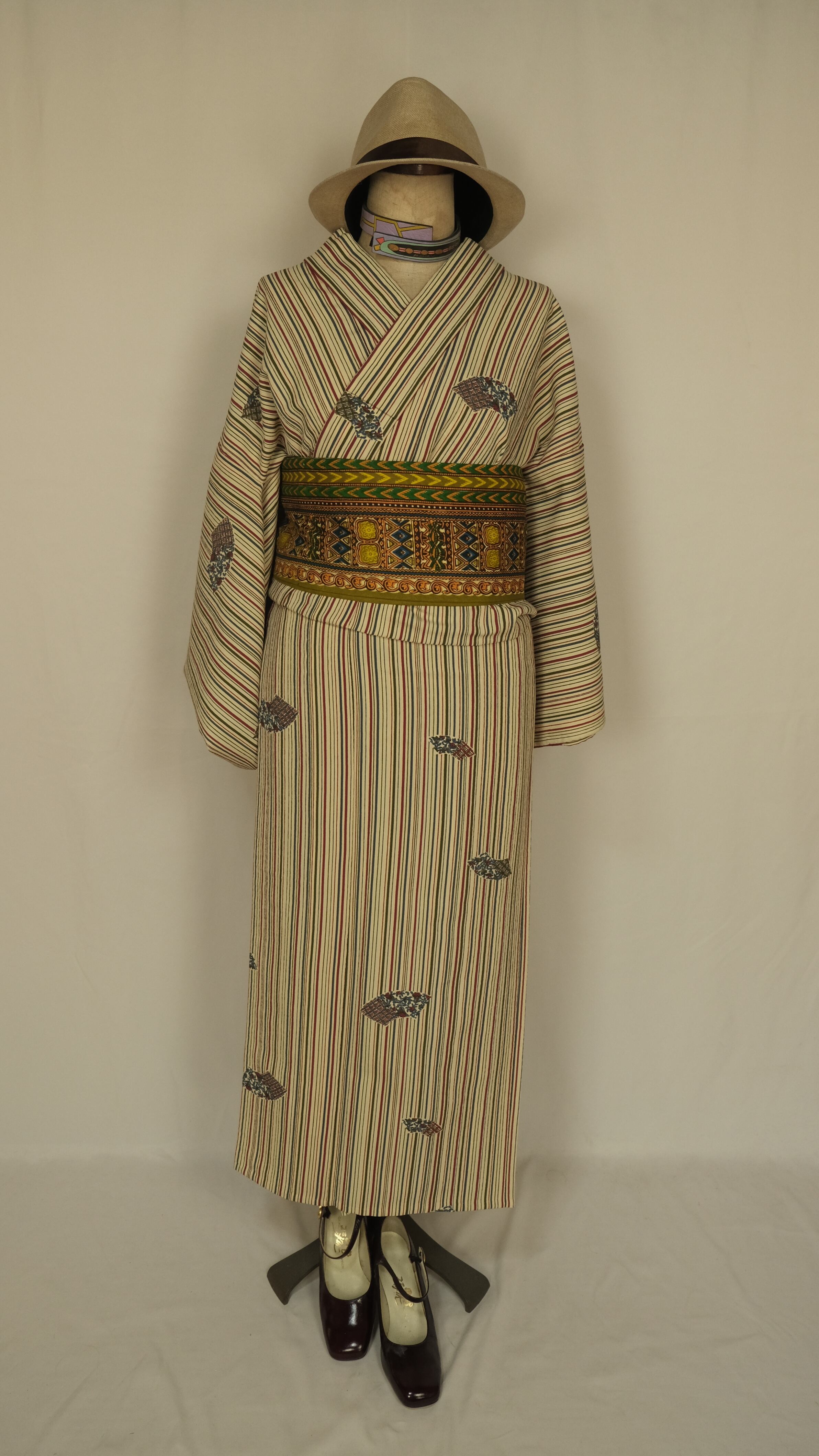 きなり色の地に、赤・青・緑の縞模様が織り出された単衣着物。