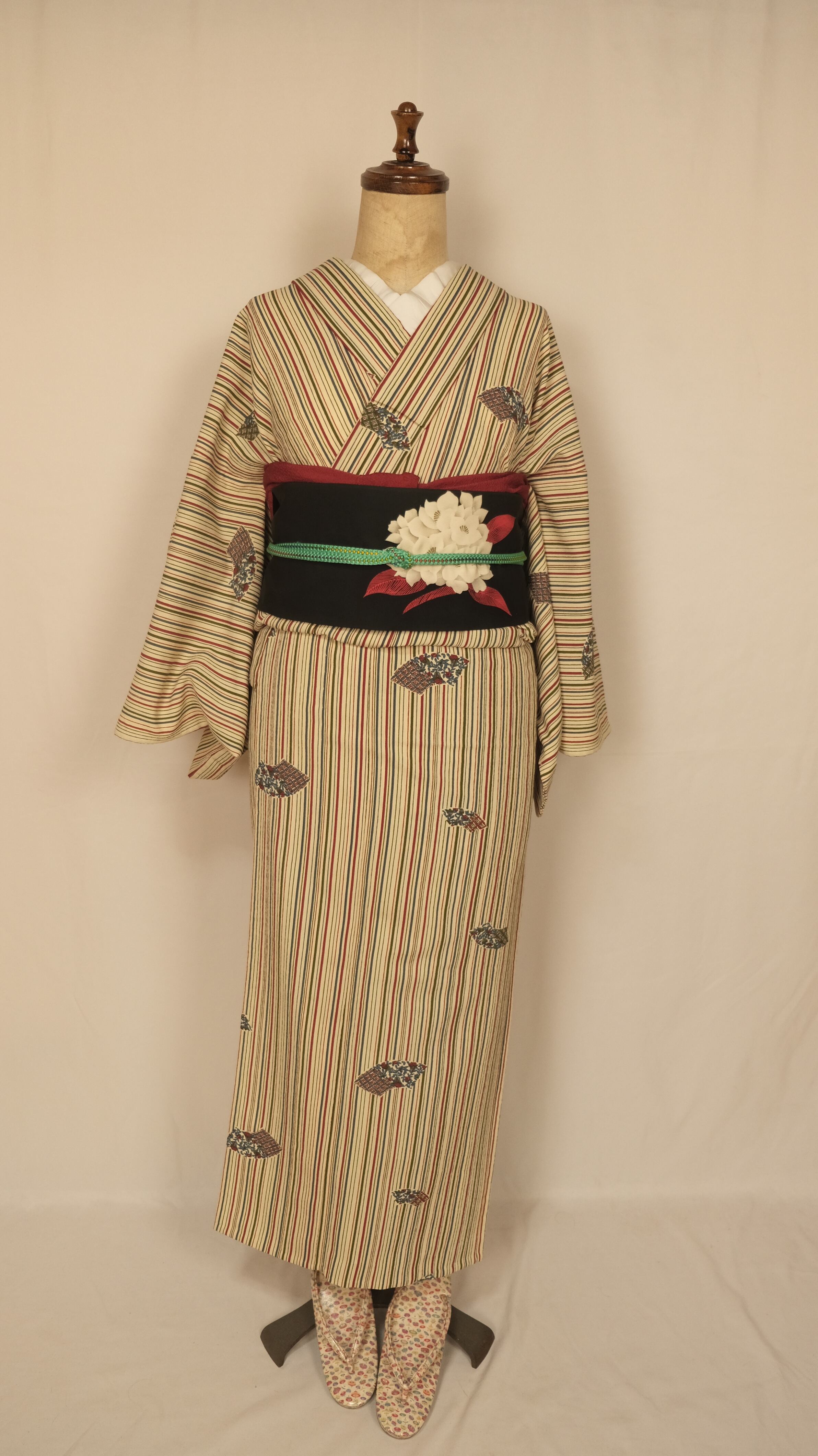 *着物は出品中です。商品名:生成地×縞に扇子文様|帯映えする単衣着物 – カジュアルな遊び心を添えて