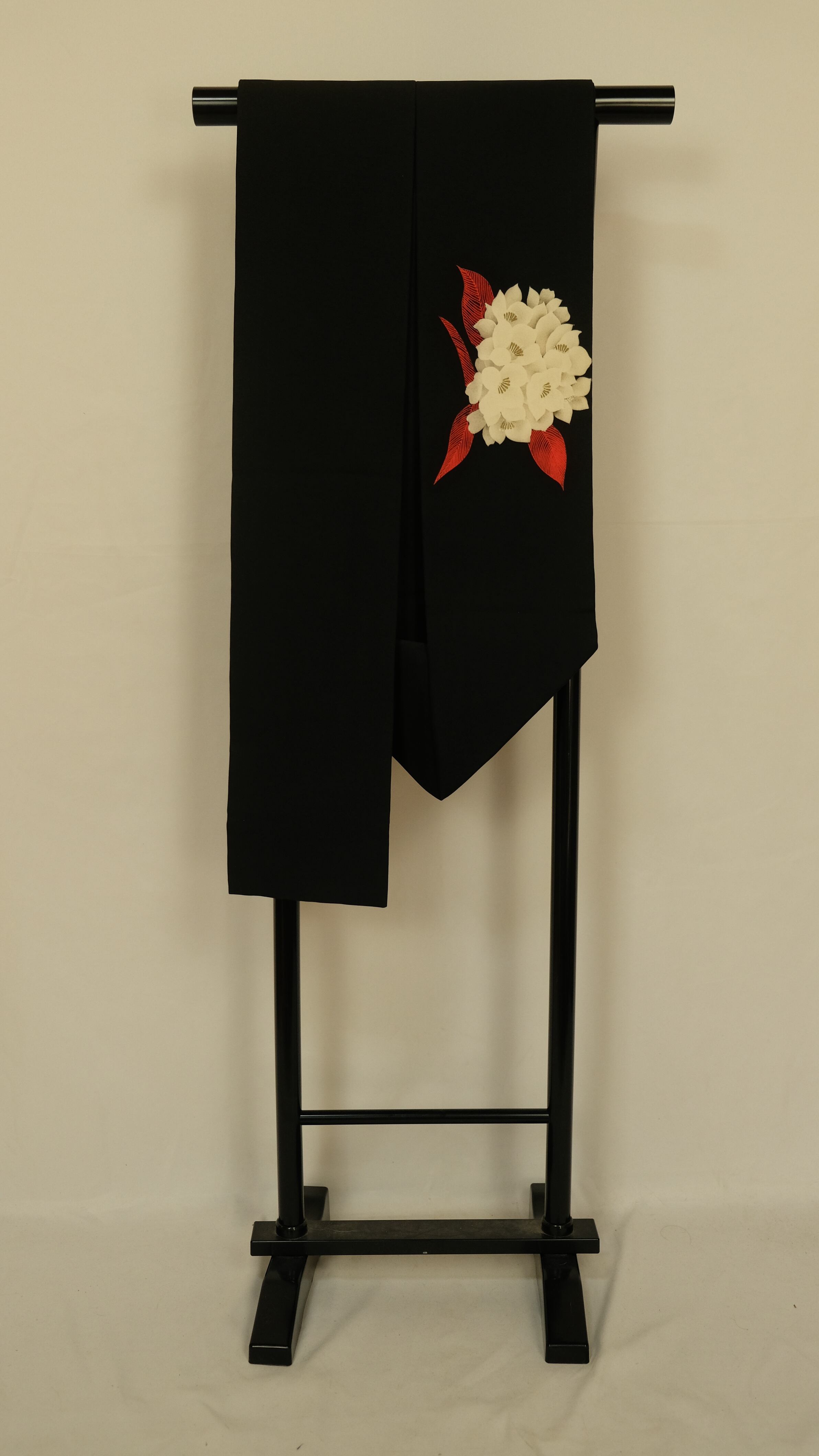 シックな黒地が着物全体を引き締めつつも、大胆な色彩の紫陽花が目を惹くデザインで、