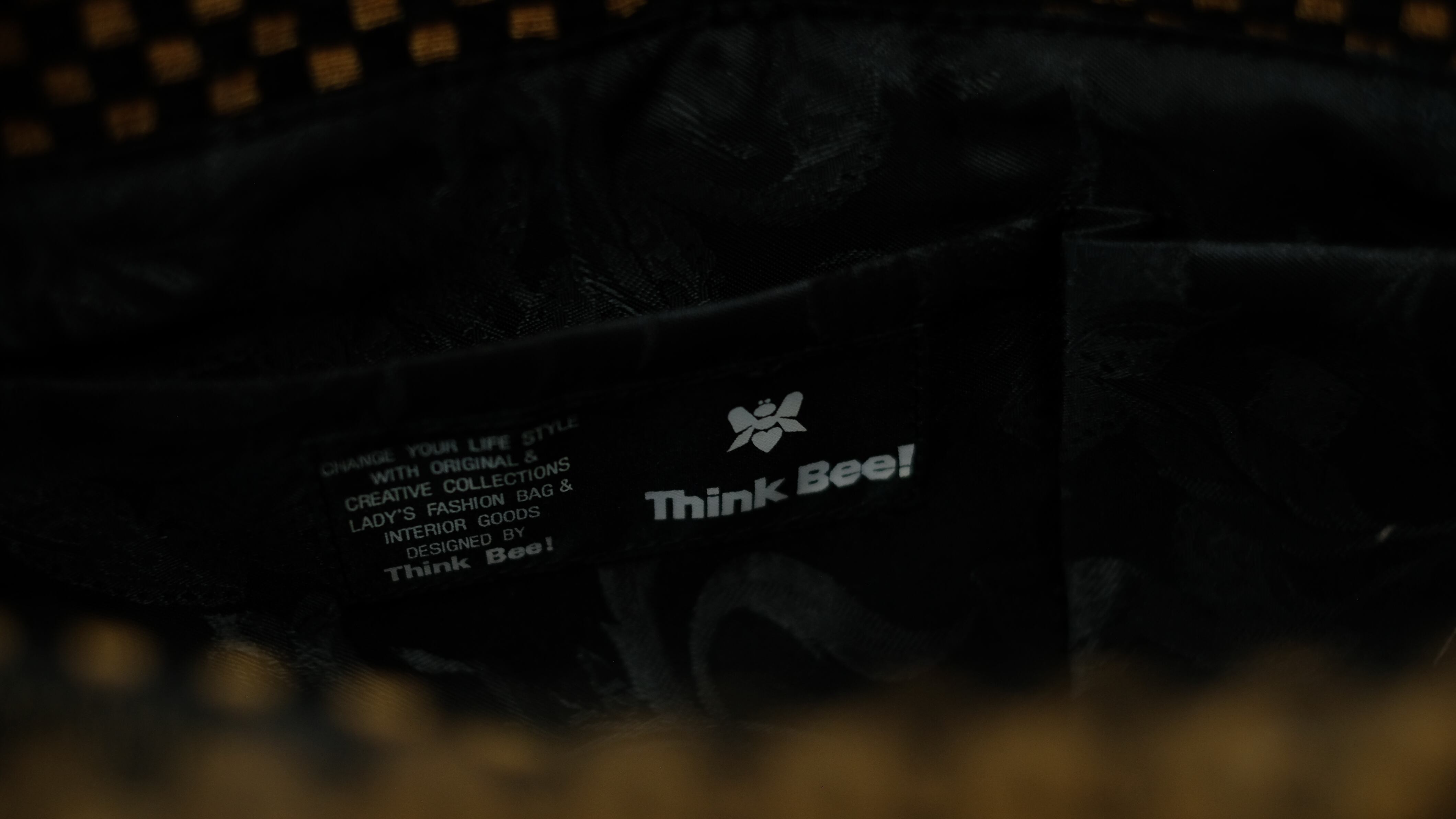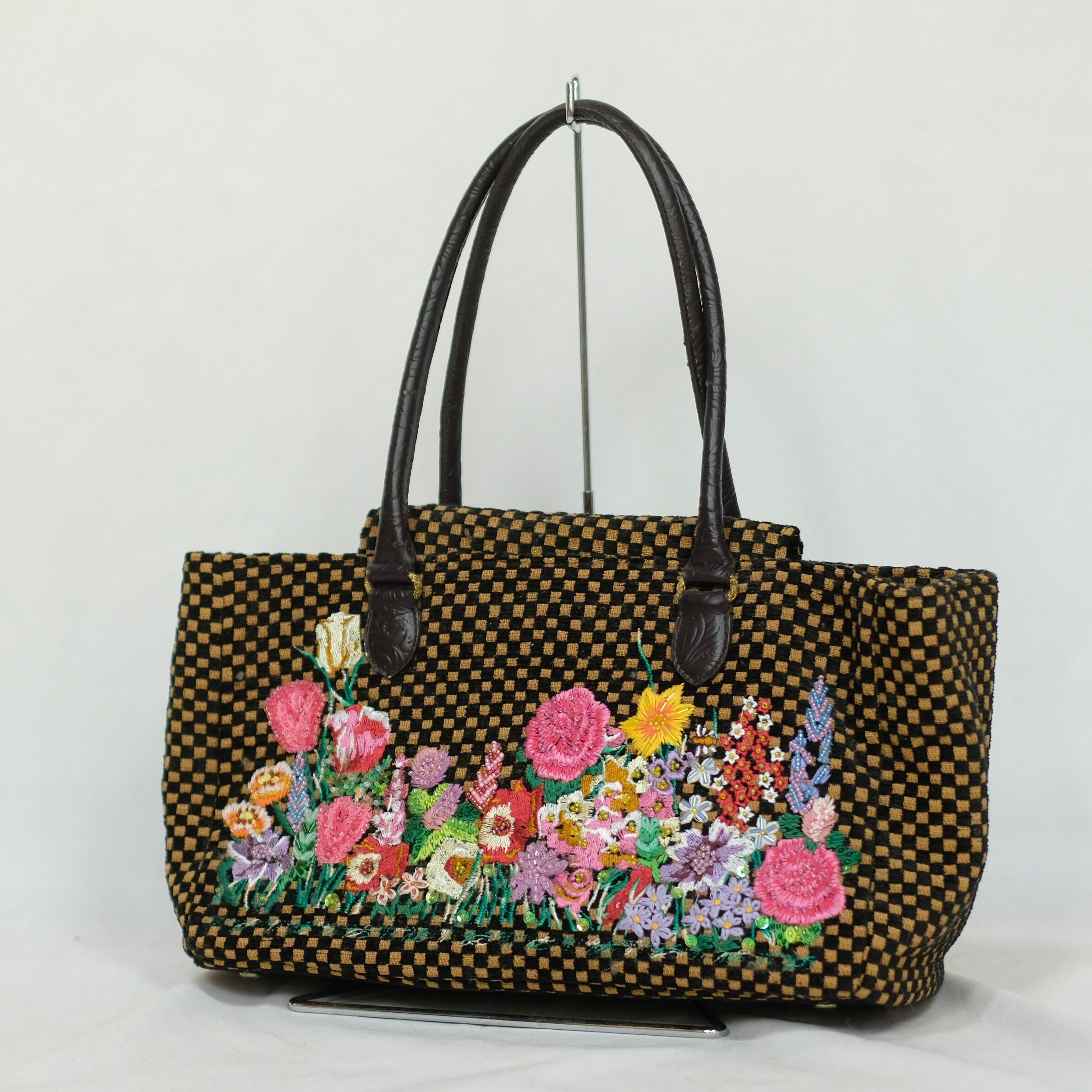 黒と茶色の小さな市松模様をベースに、片面いっぱいに花畑を思わせる華やかな刺繍が施された Think Bee!(シンクビー) のハンドバッグ。刺繍の一部にはビーズやスパンコールがあしらわれ、光を受けてきらりと輝く豪華な印象です。
