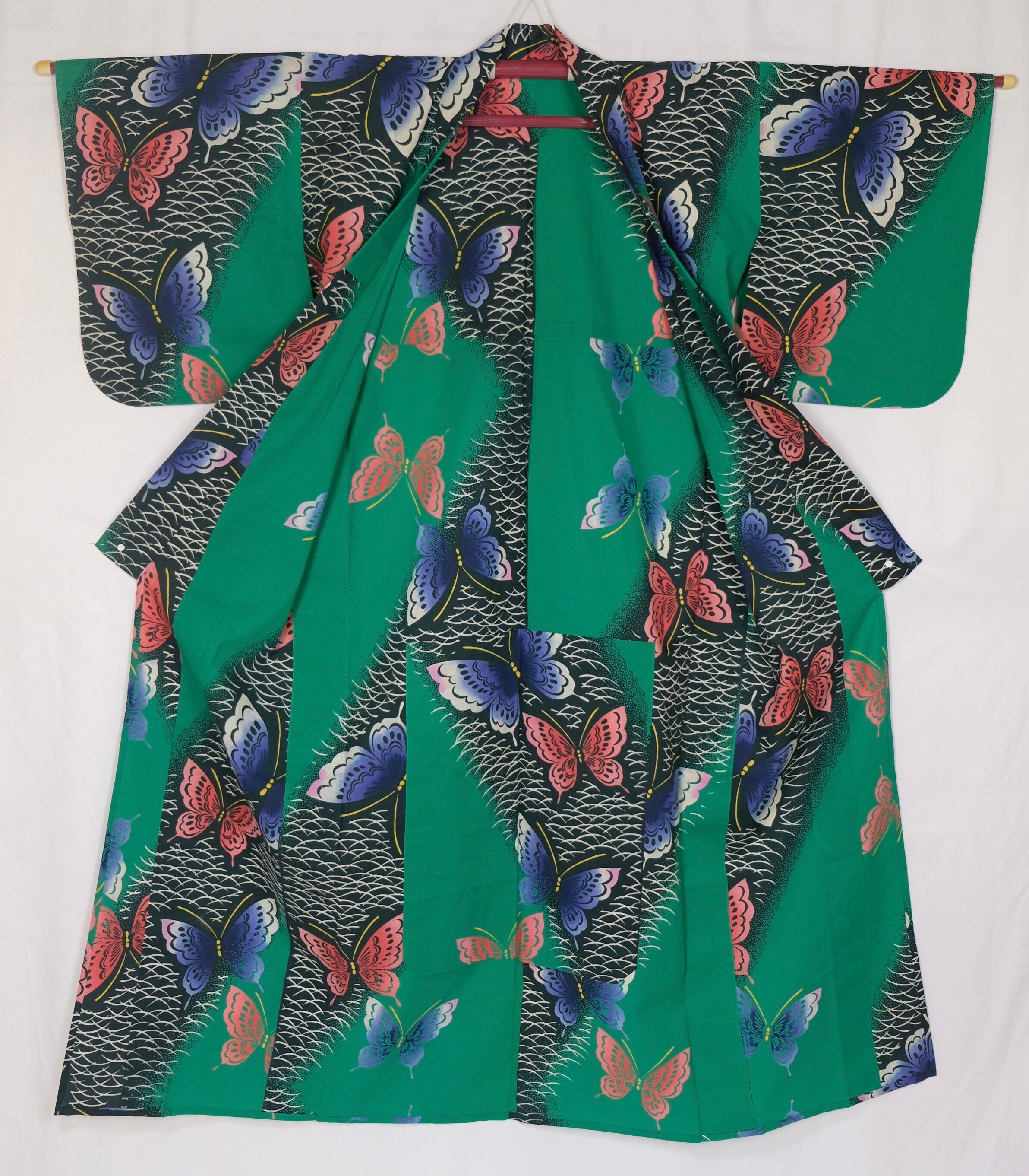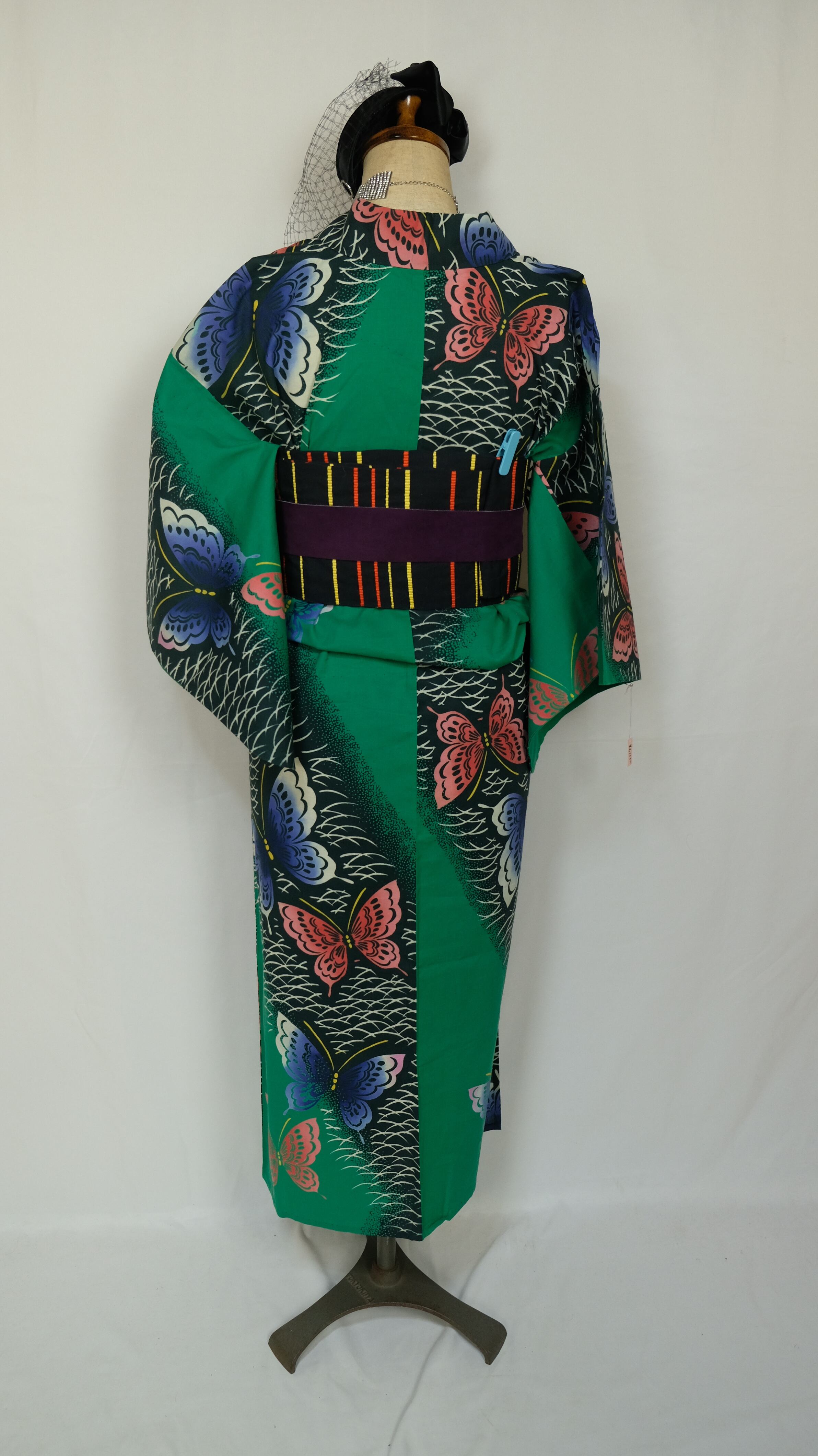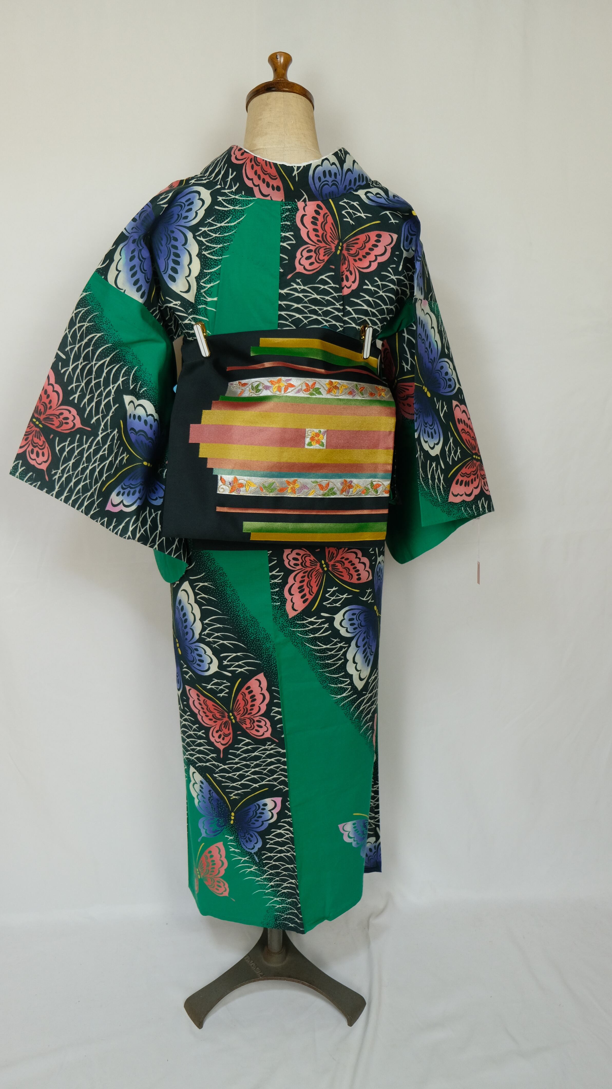深緑をベースに、大きな蝶が青とピンクのグラデーションで大胆に描かれた浴衣です。存在感のあるデザインで、華やかさと個性をしっかり楽しめる一枚。注染染めと思われます。