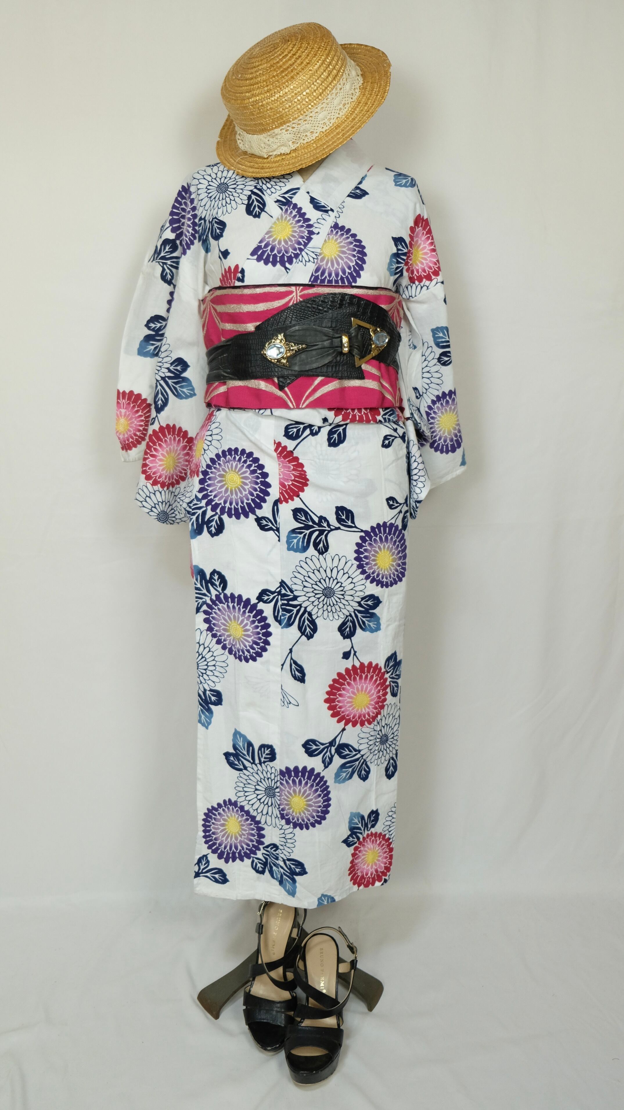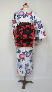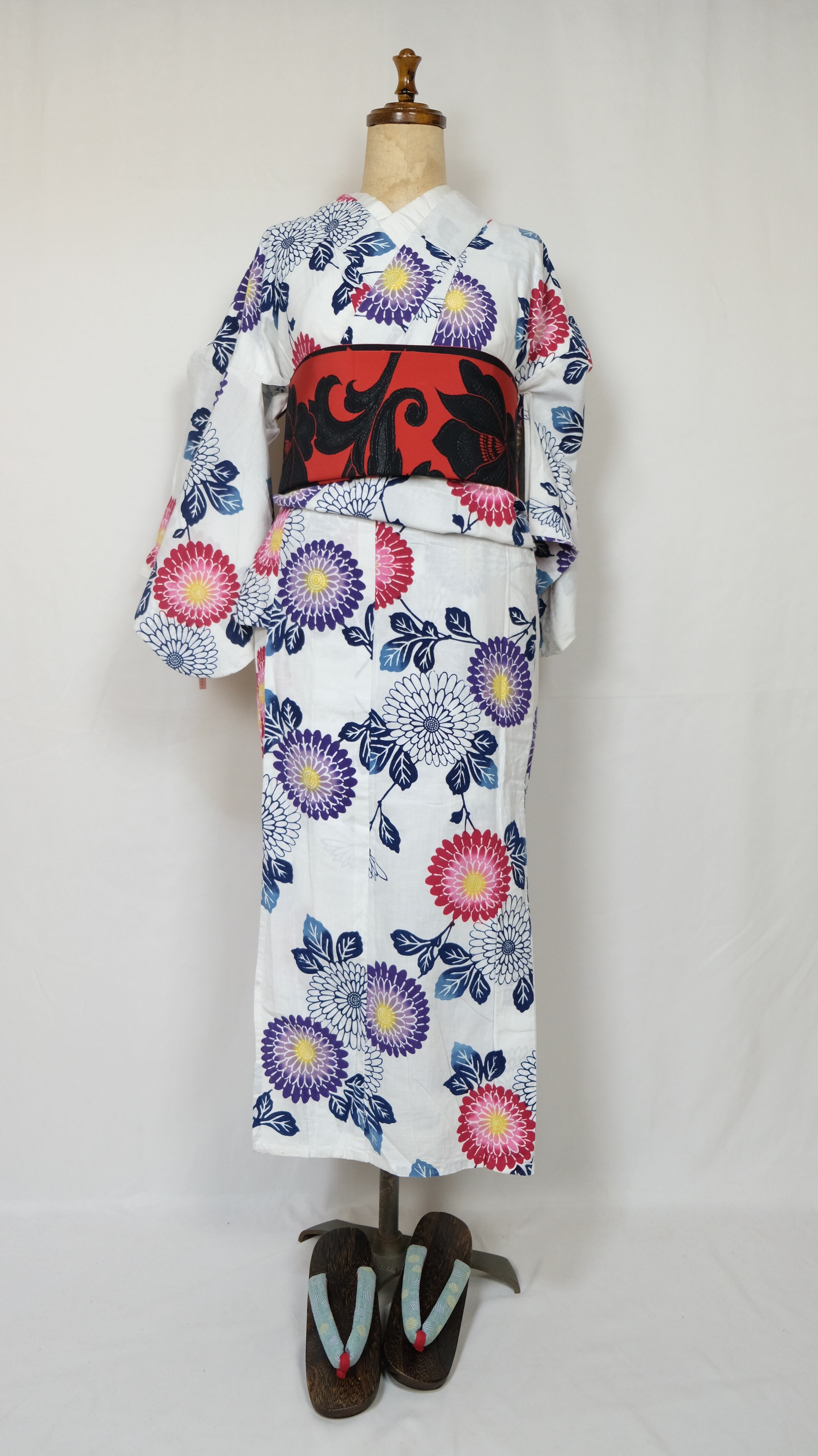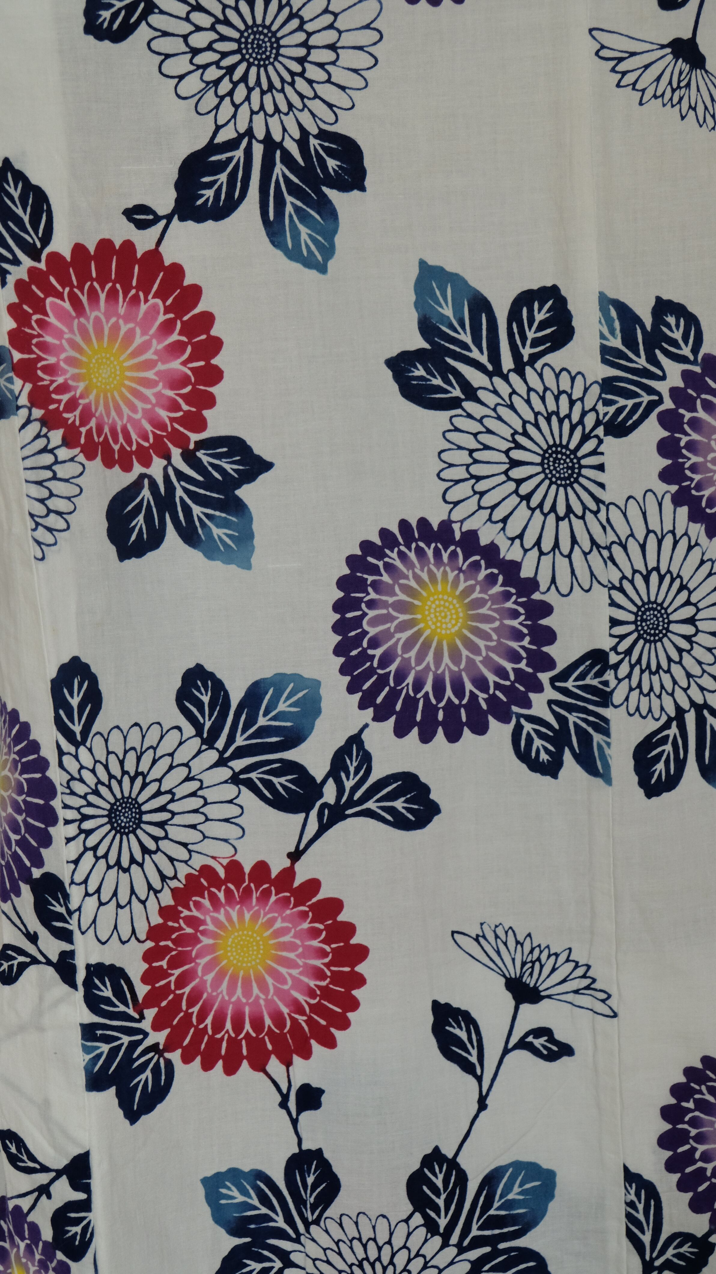 白地に藍色を基調とし、赤と紫のグラデーションで菊の花が全体に染め抜かれた、昔ながらの注染浴衣です。赤の差し色が程よい華やかさを添え、落ち着きと可憐さを併せ持つ雰囲気に。