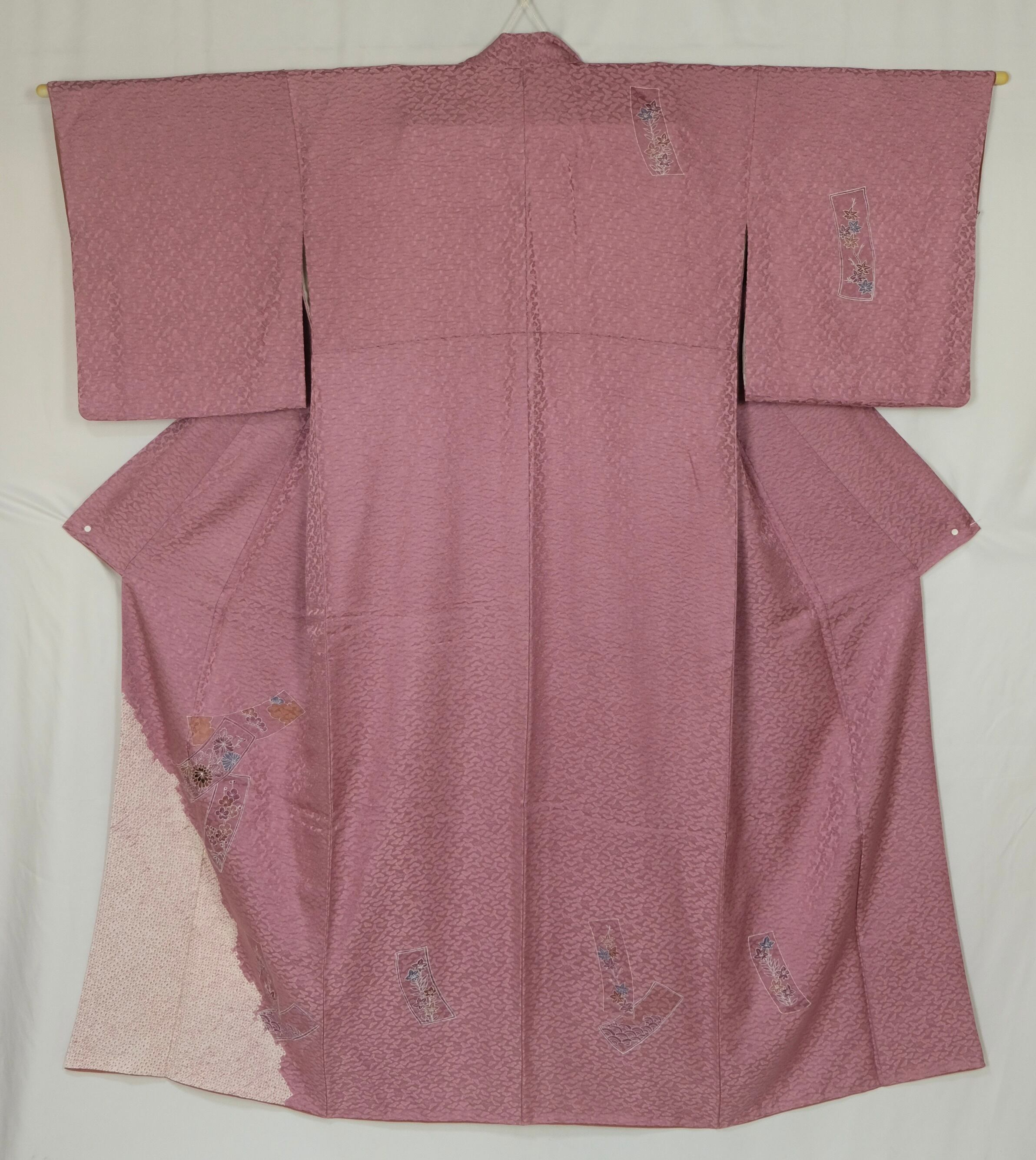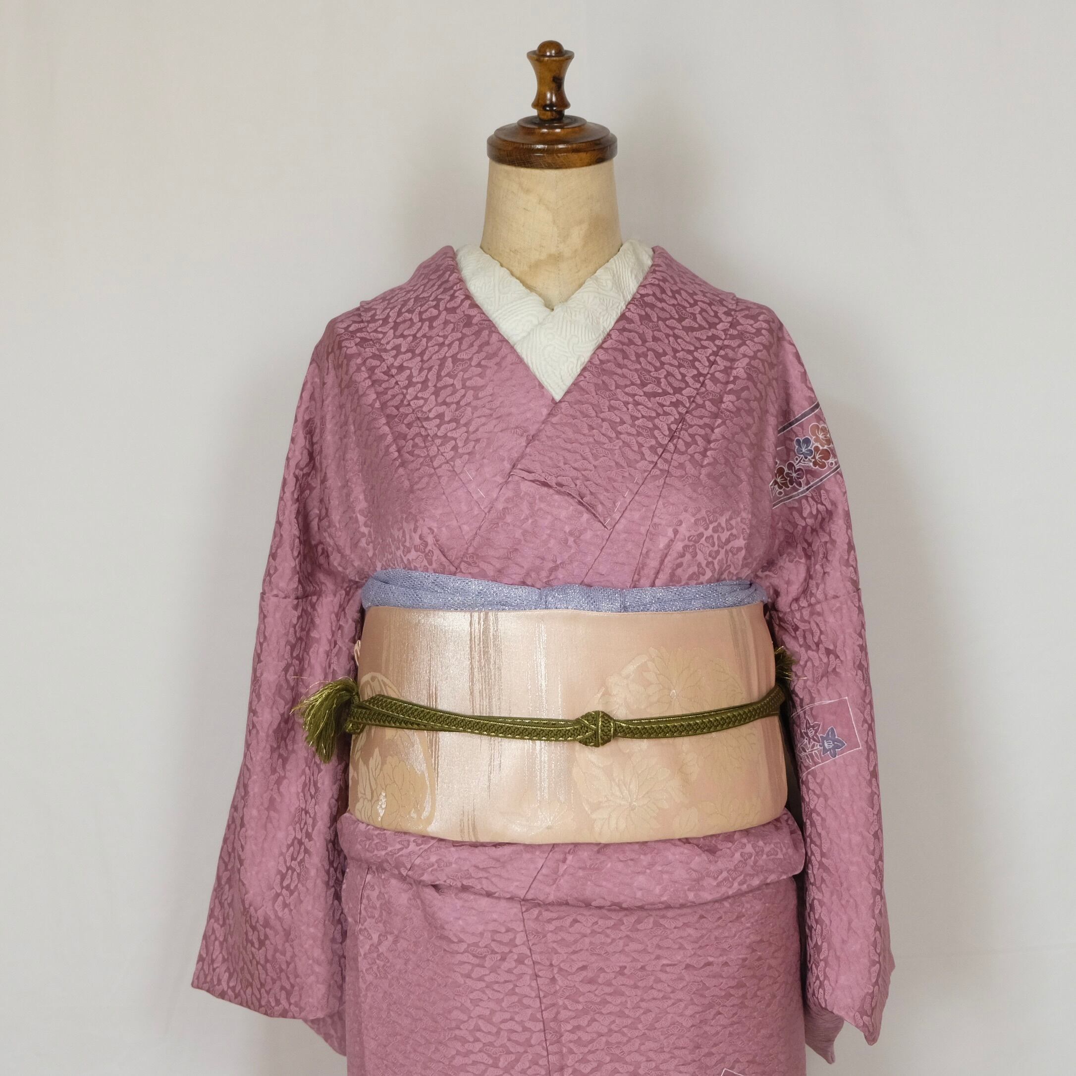 落ち着いたピンク地に、斜めに入った絞り模様と短冊文様があしらわれた付け下げです。