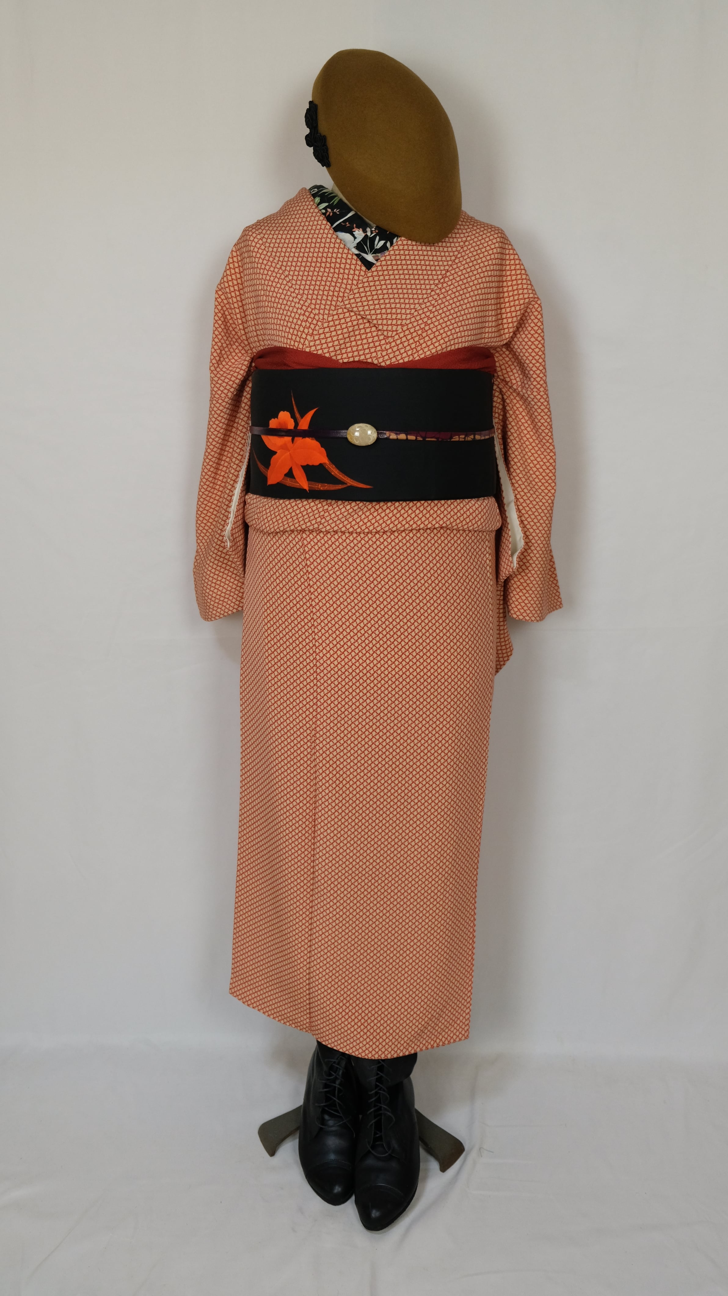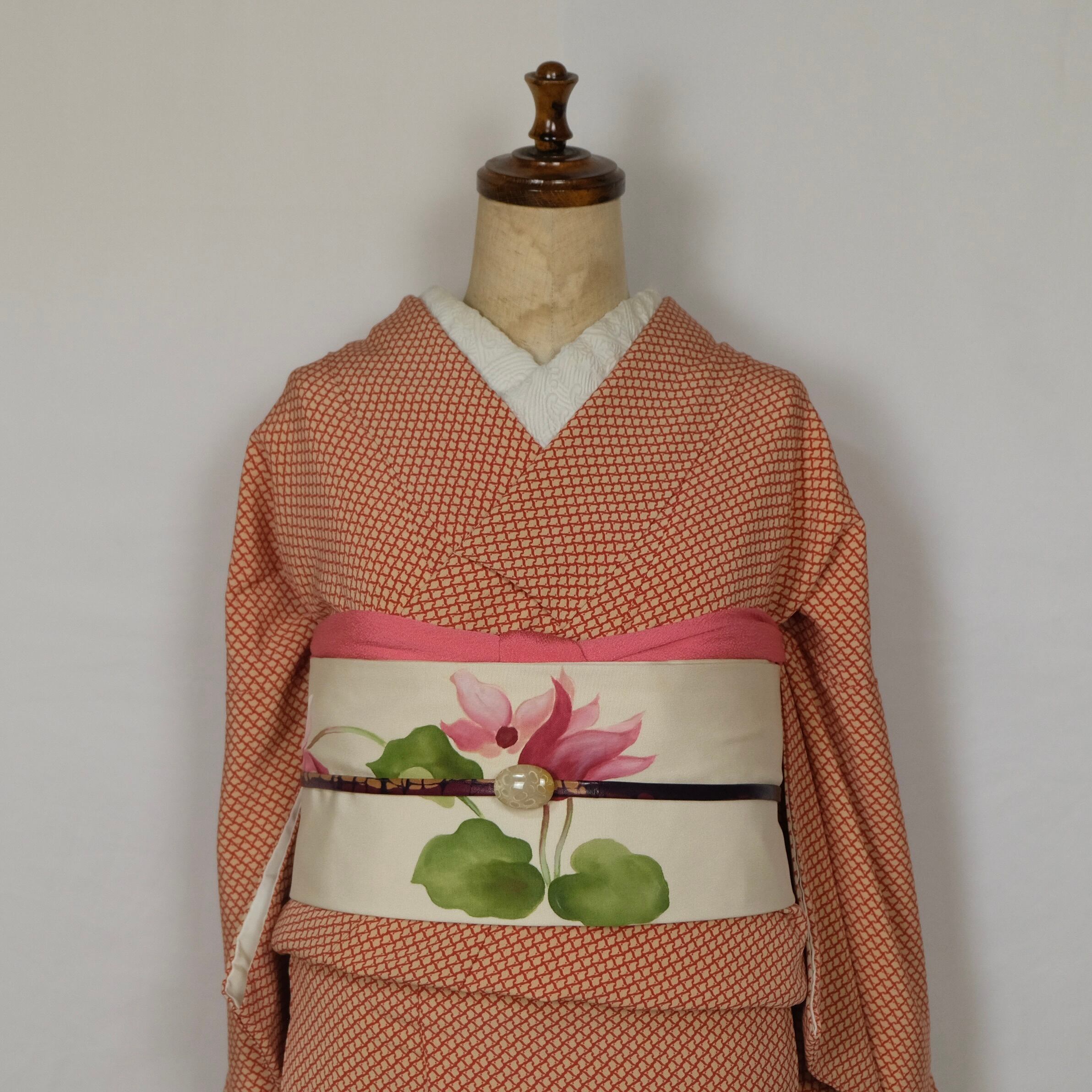 赤みのある地色に、白抜き(ややベージュ寄り)のとても細かな鳥模様がびっしりと敷き詰められた正絹の小紋です。近くで見ると小鳥の文様がはっきり確認できますが、遠目にはオレンジがかった無地やドットのようにも見える、目の楽しめる一枚です。