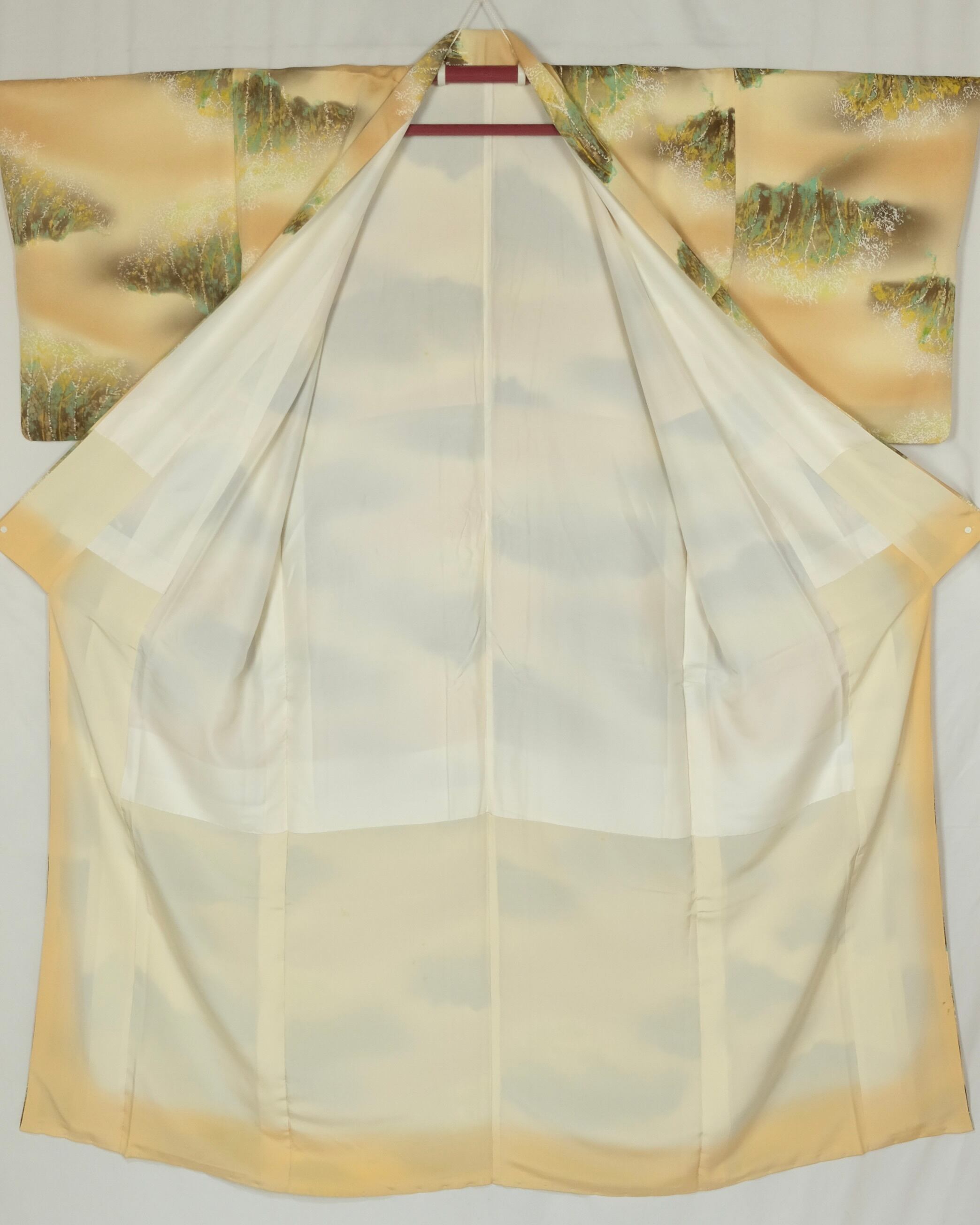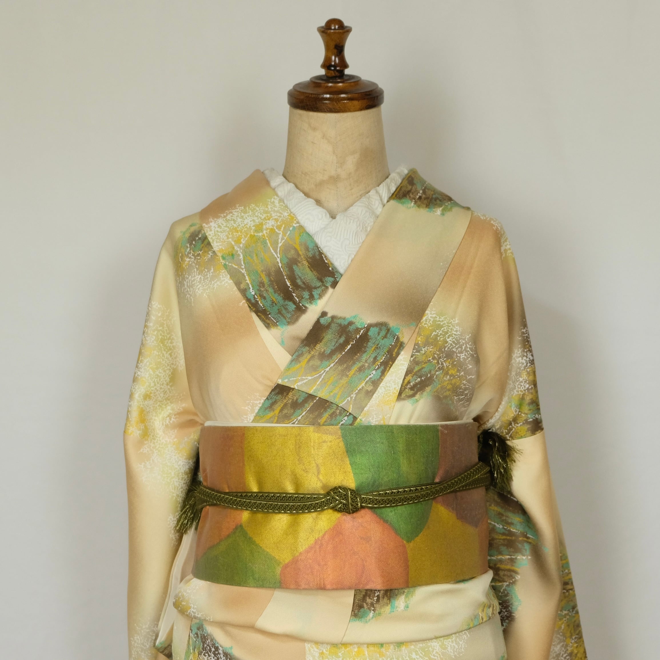 やわらかなクリーム色の地に、白・黄色・緑・茶色で描かれた森のようなデザインが全体に広がる正絹の小紋です。手描きによる繊細なタッチで、グラデーションのように色が移ろい、見る角度によっては雲や空のようにも感じられる幻想的な一枚。