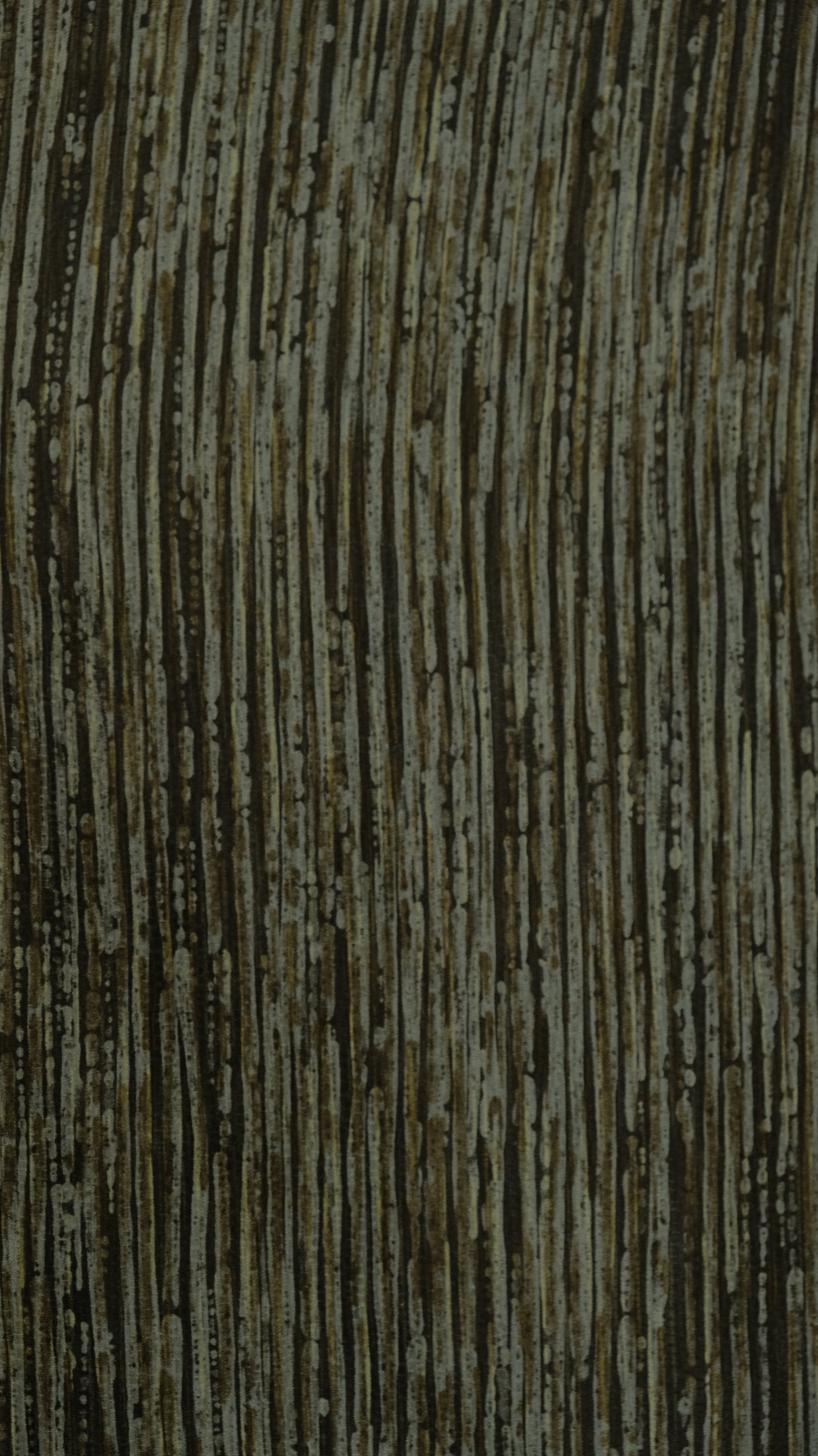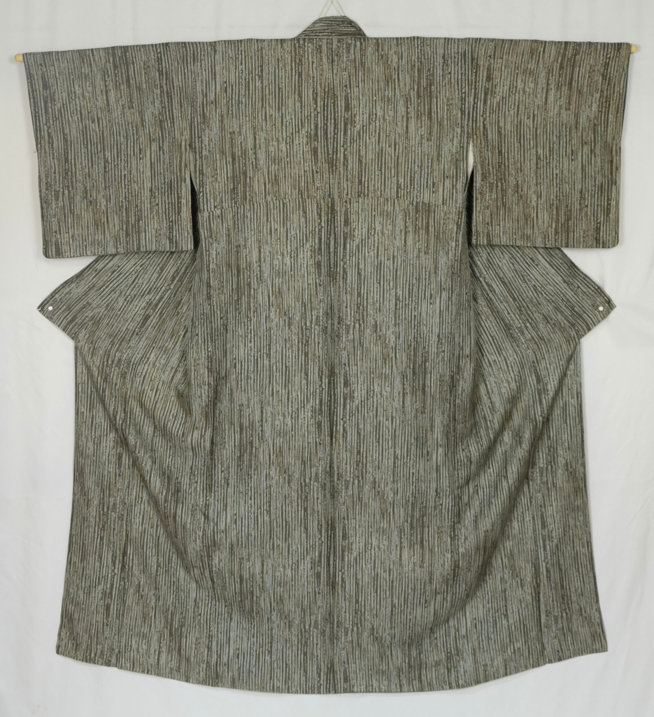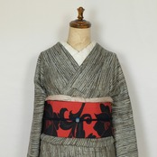 薄いグレーをベースに、濃淡さまざまなグレーや茶色が重なり合うストライプ調の小紋です。