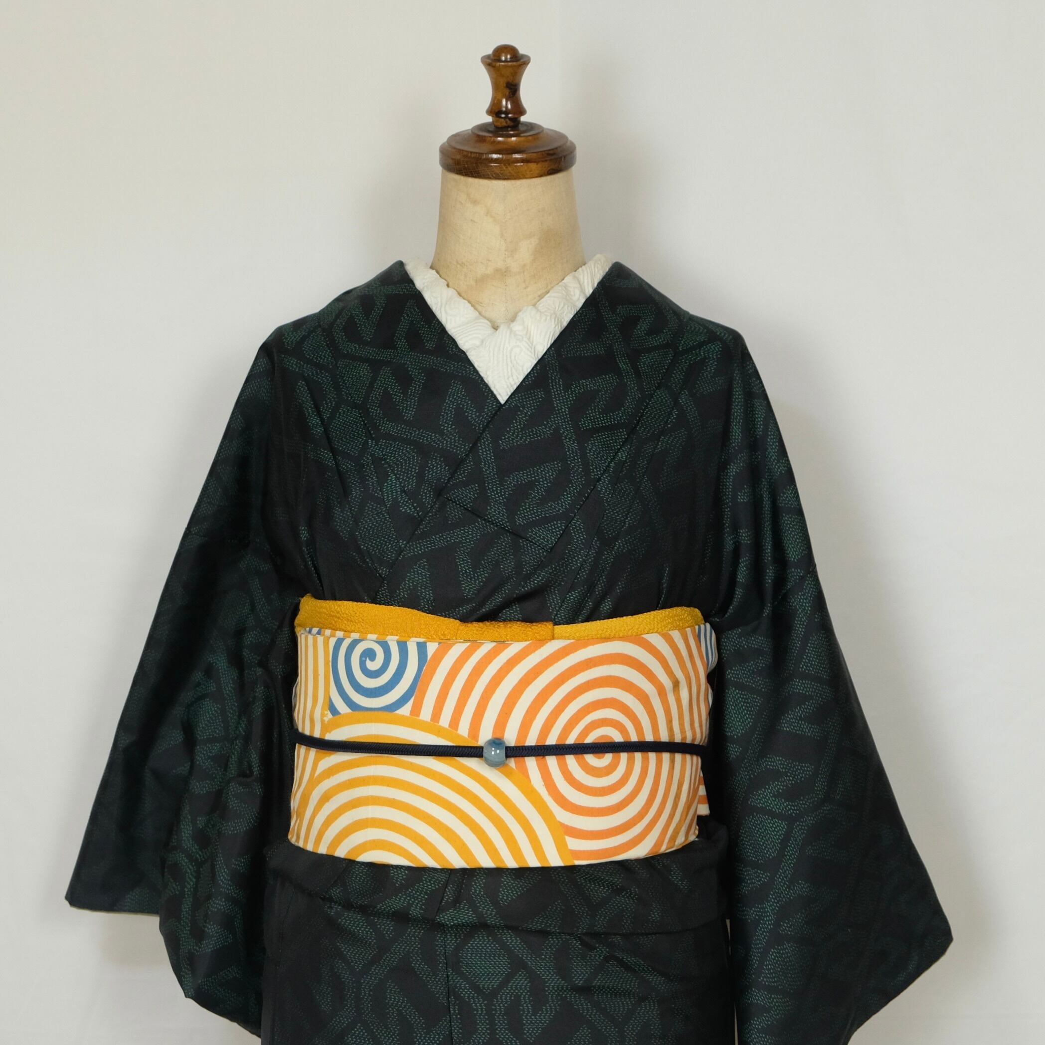 落ち着いた色味ながらも、あえてポップな帯を合わせても不思議とまとまる懐の深さ。