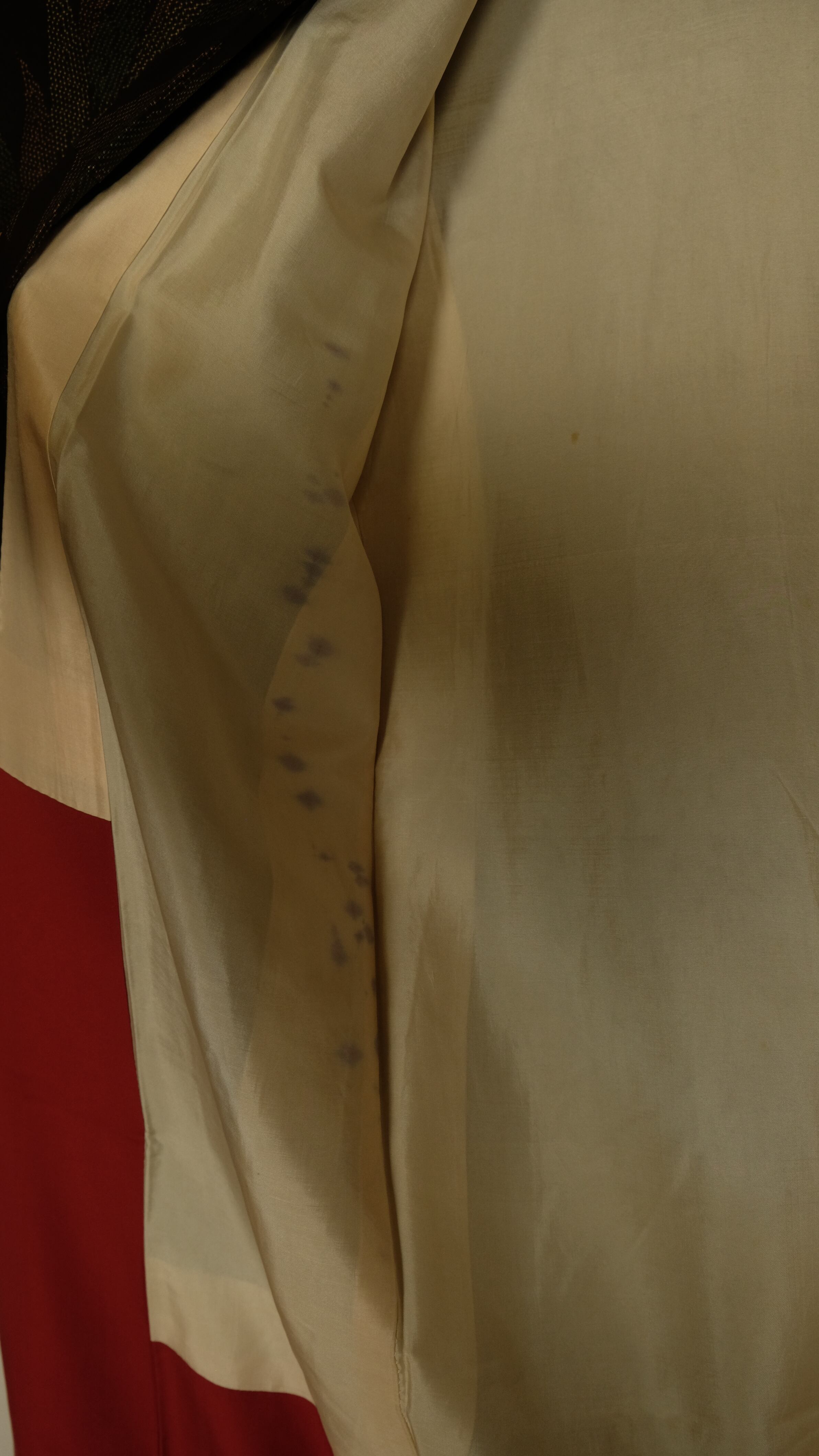 表地は全体的に綺麗な印象ですが、裏地にはちょこちょこ汚れシミがあり、くすみも感じます。また表の生地も保存状態の関係か、若干がさつきを感じます。