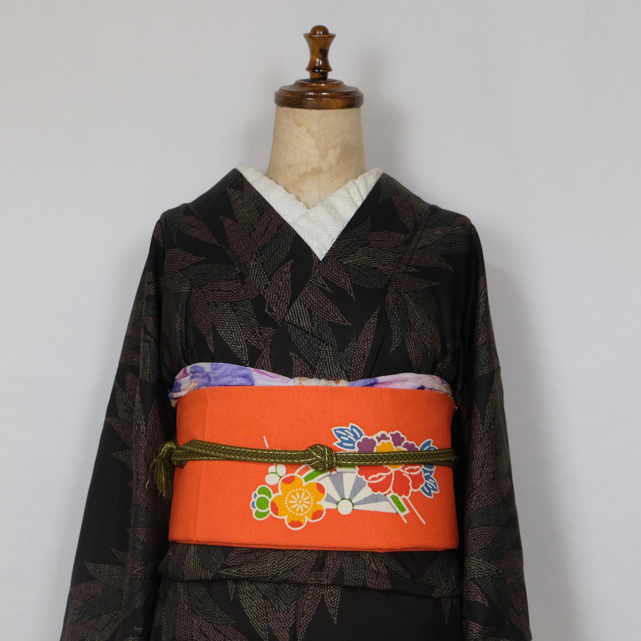 地色が焦茶色のため、ピンクや赤などの暖色系の帯とも相性が良く、