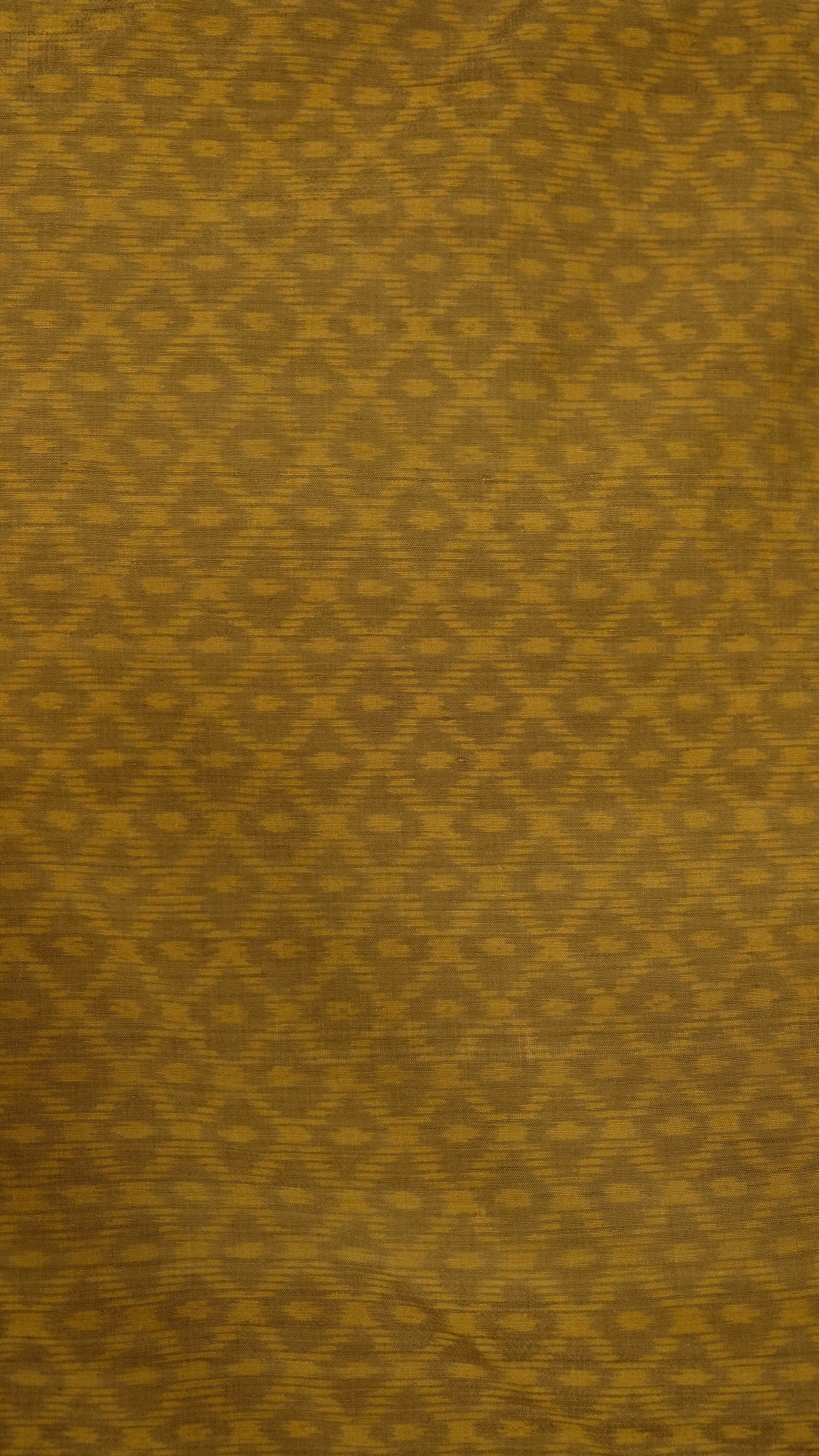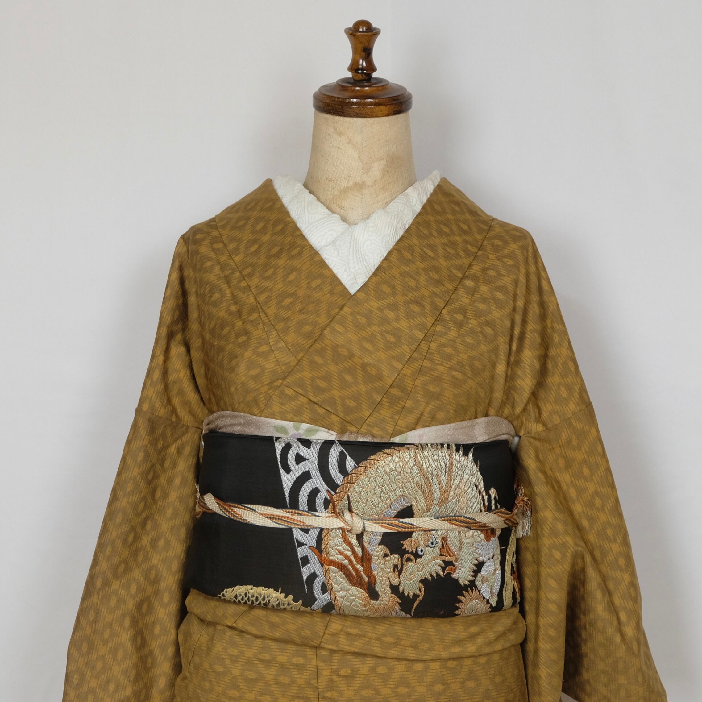 全体に細かな菱紋様が織り出された、辛子色の紬の着物です。