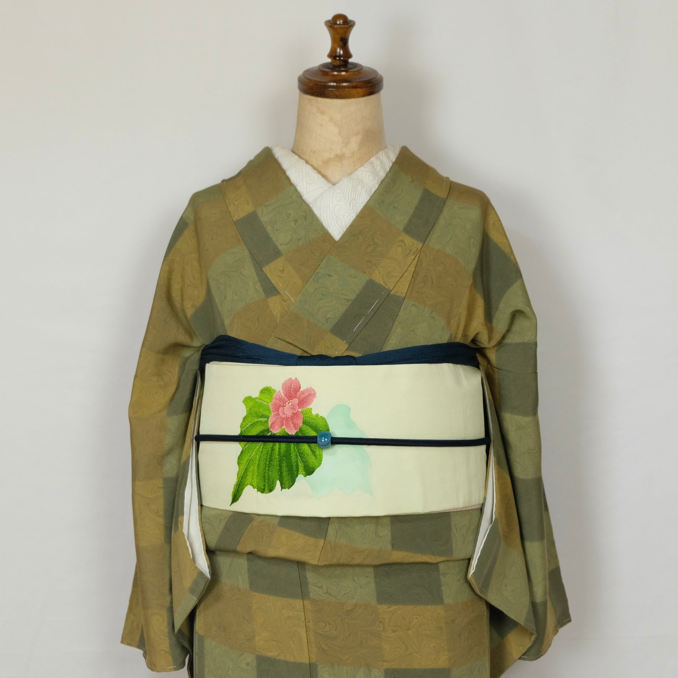 もうひとつは、ワンポイントの花柄帯を合わせて、少し明るくやわらかな印象に仕上げました。
