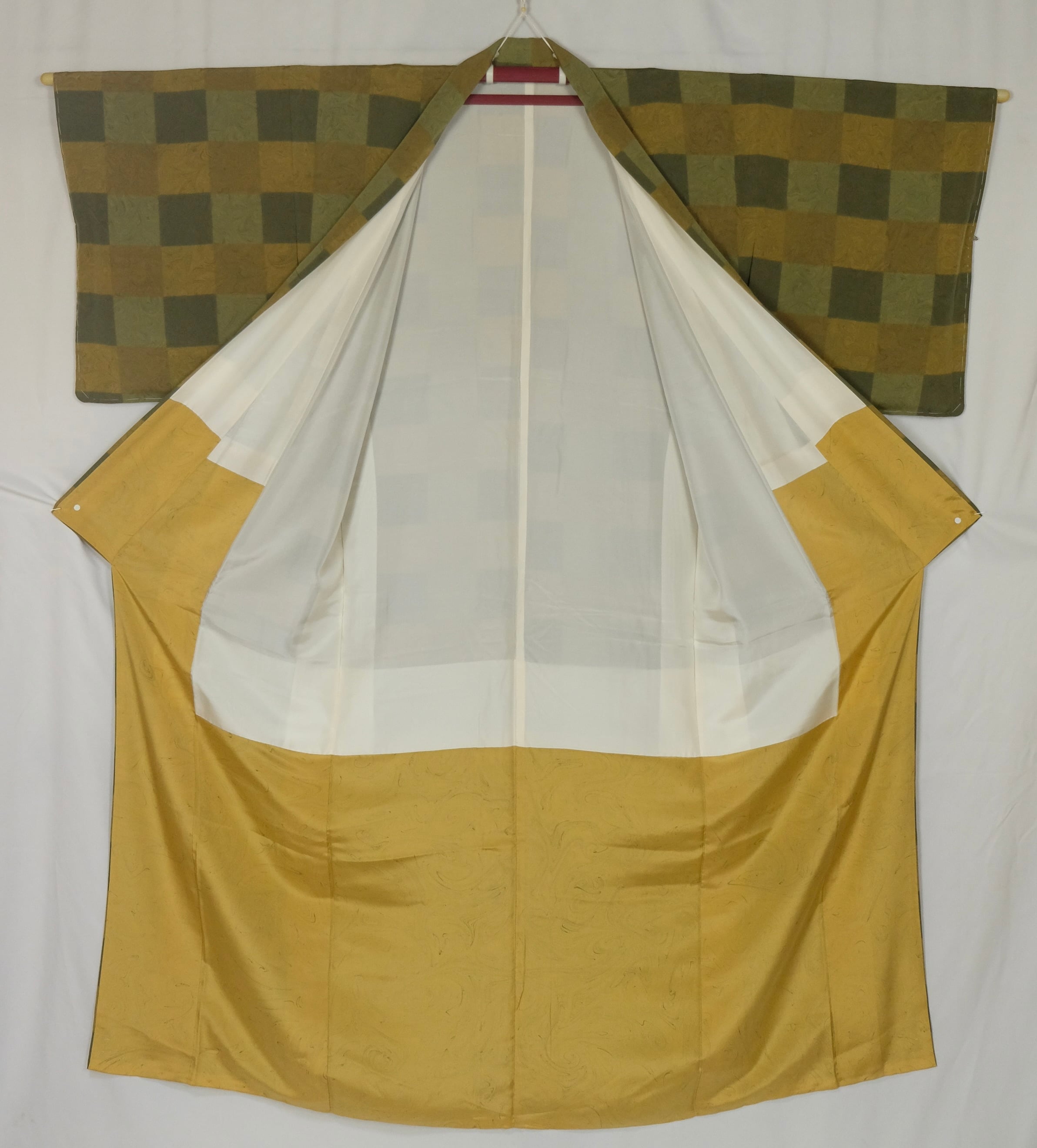 未使用品|抹茶色の市松×墨流し模様の正絹小紋 共八掛付き