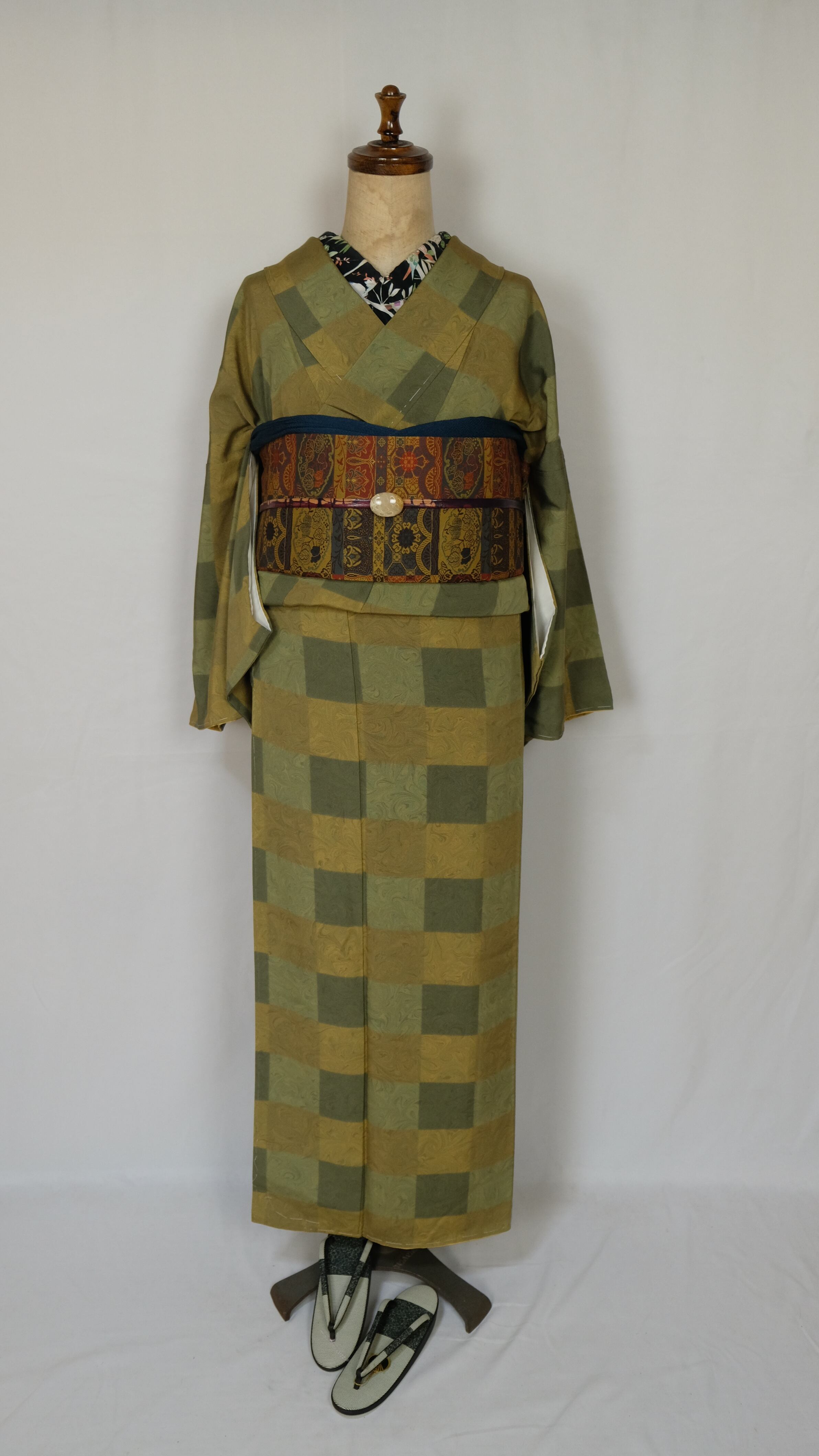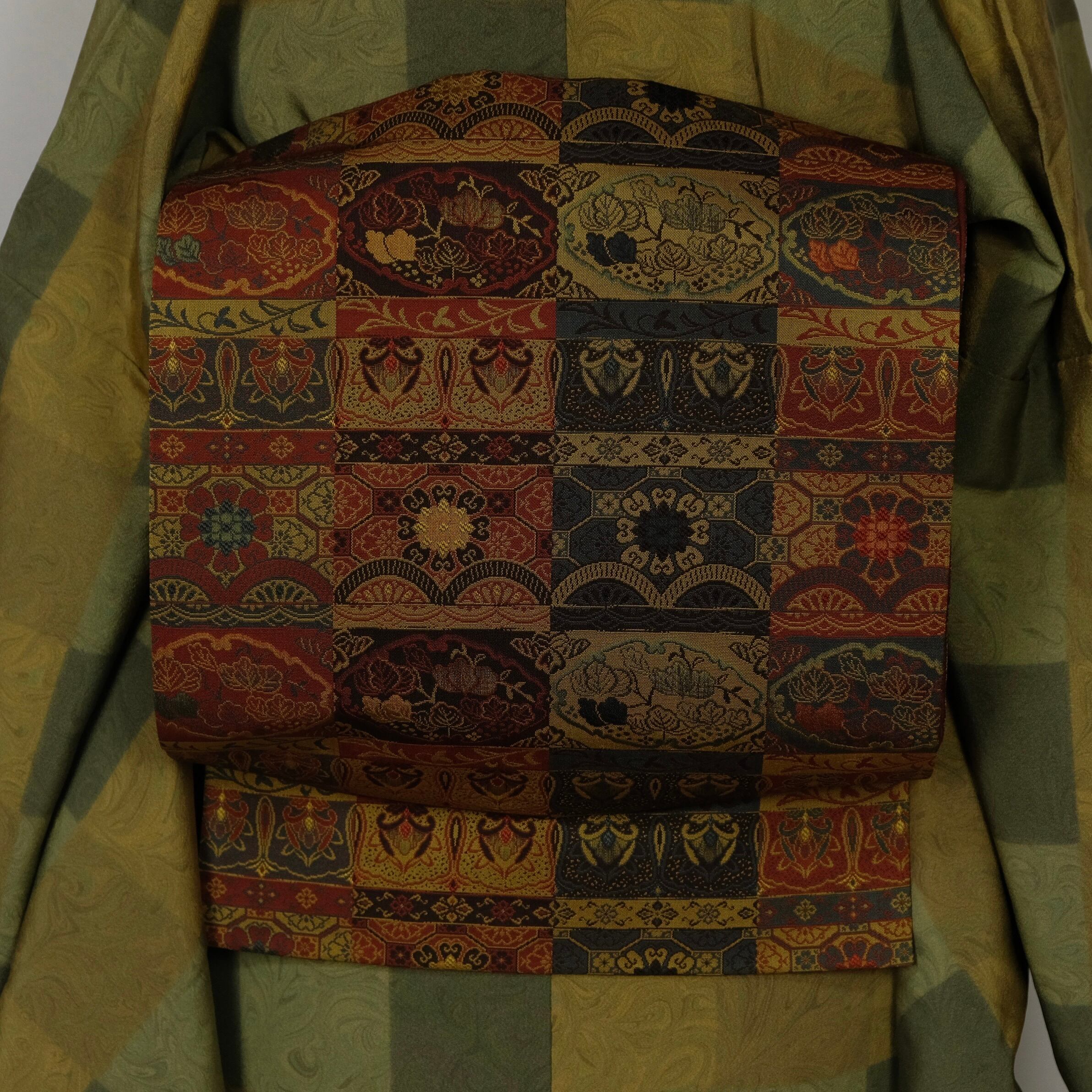 格子状に区切られた中に、菊や牡丹などの花模様、幾何学模様などが織り込まれた総柄の洒落袋帯。