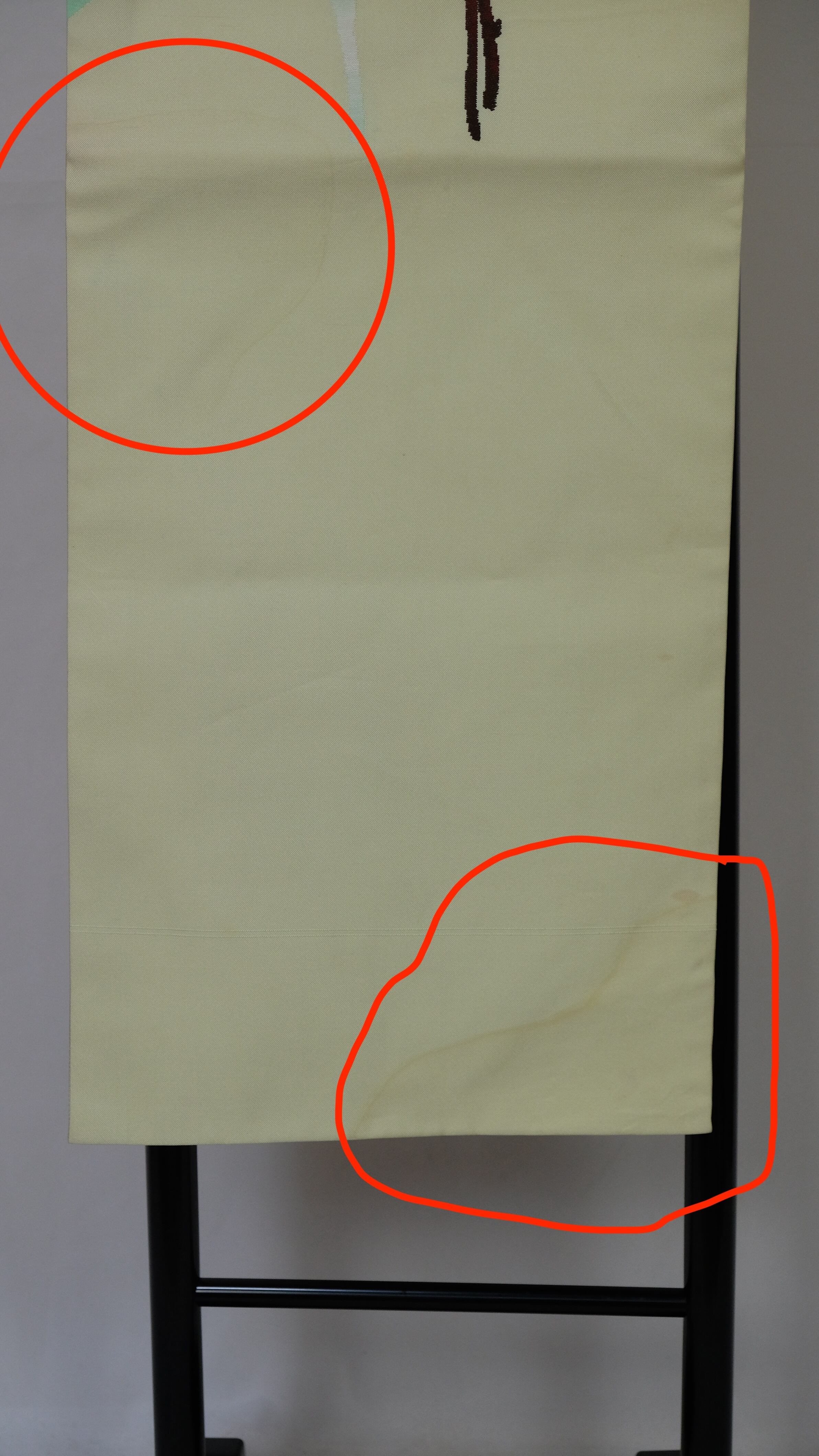 帯のたれ部分の右側に広範囲で薄い水シミの様なものがあります。があります。最後の写真でご確認ください。