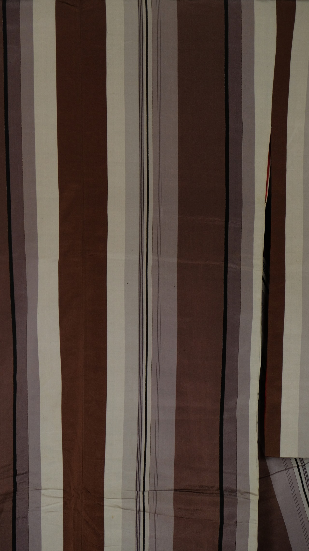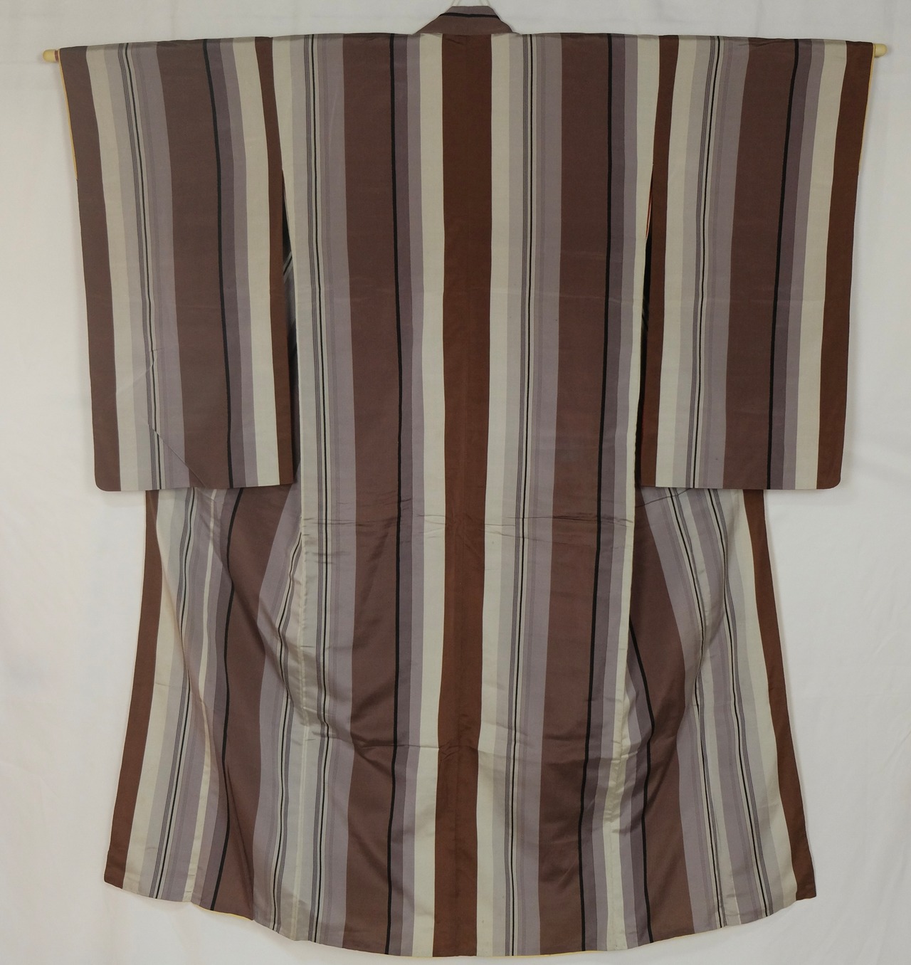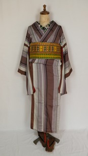 すっきりと伸びる 茶×白×灰色×紫×金糸の縞が印象的なアンティーク小紋。