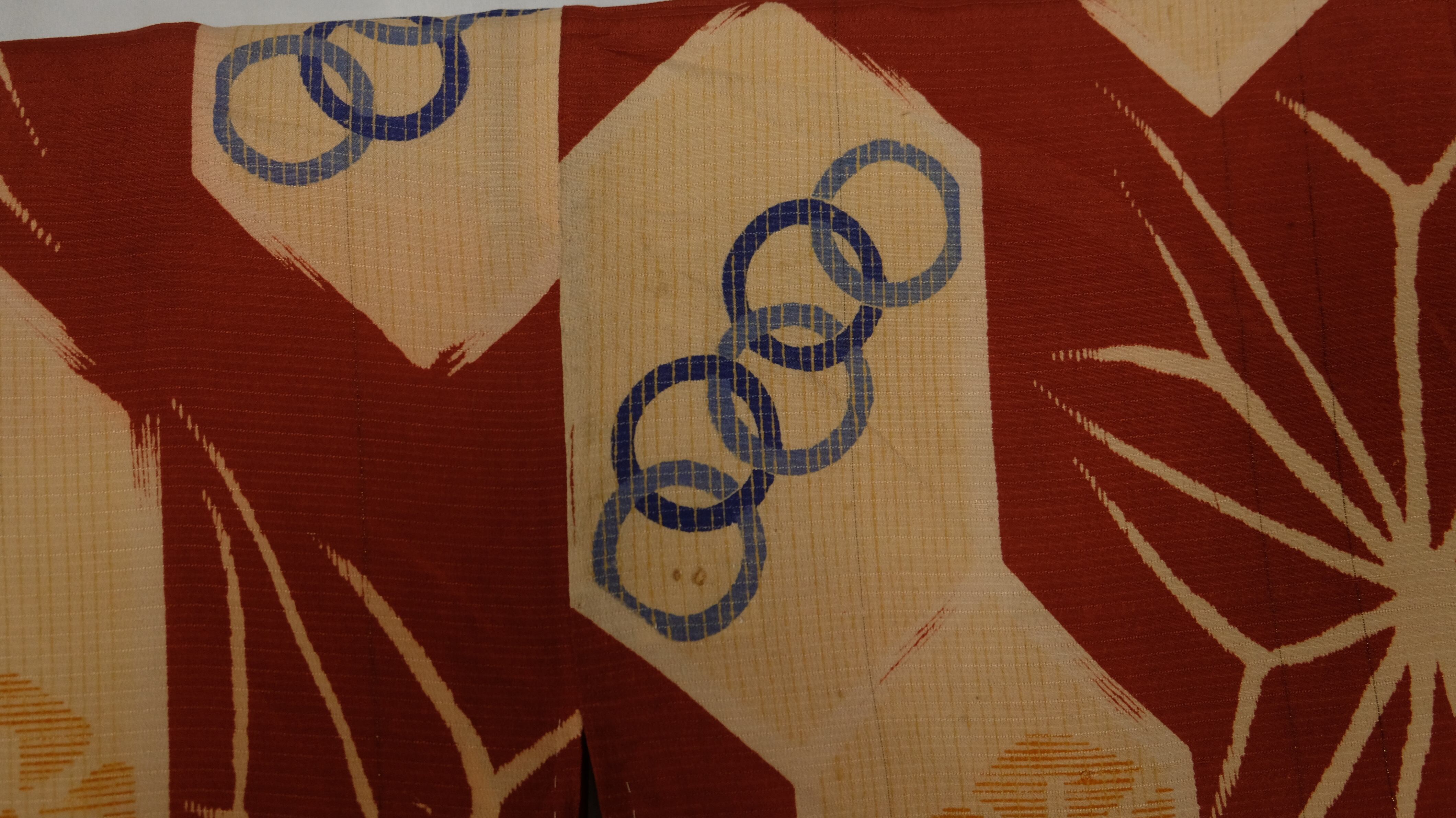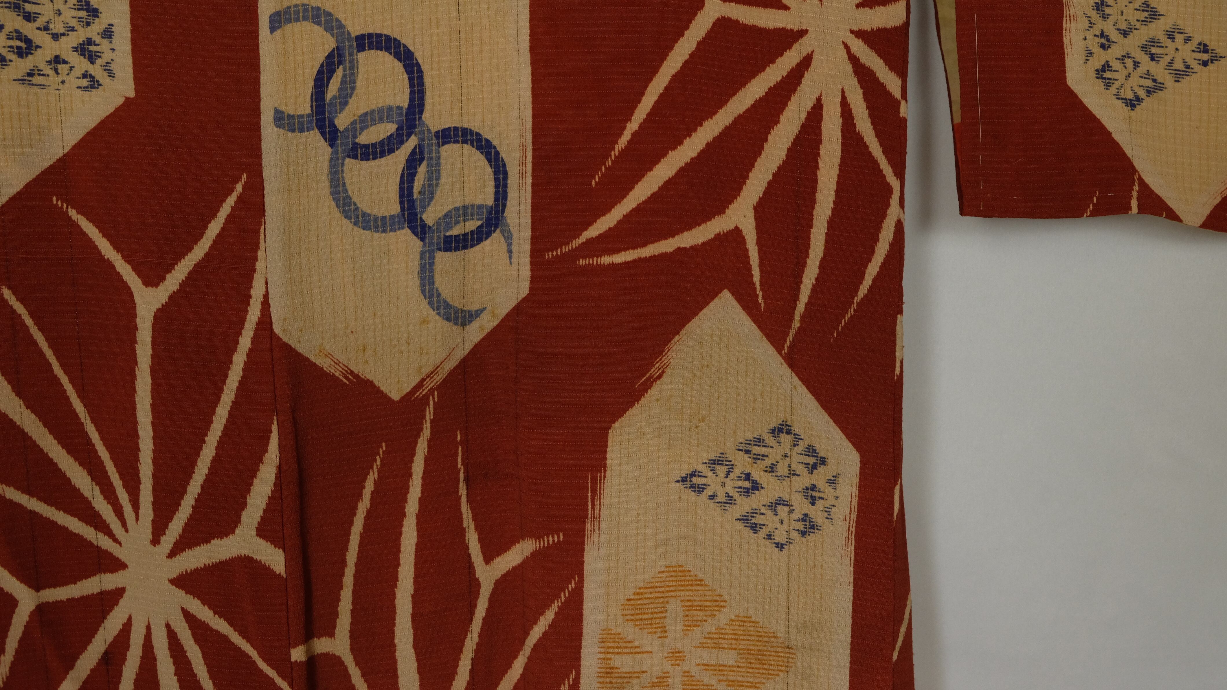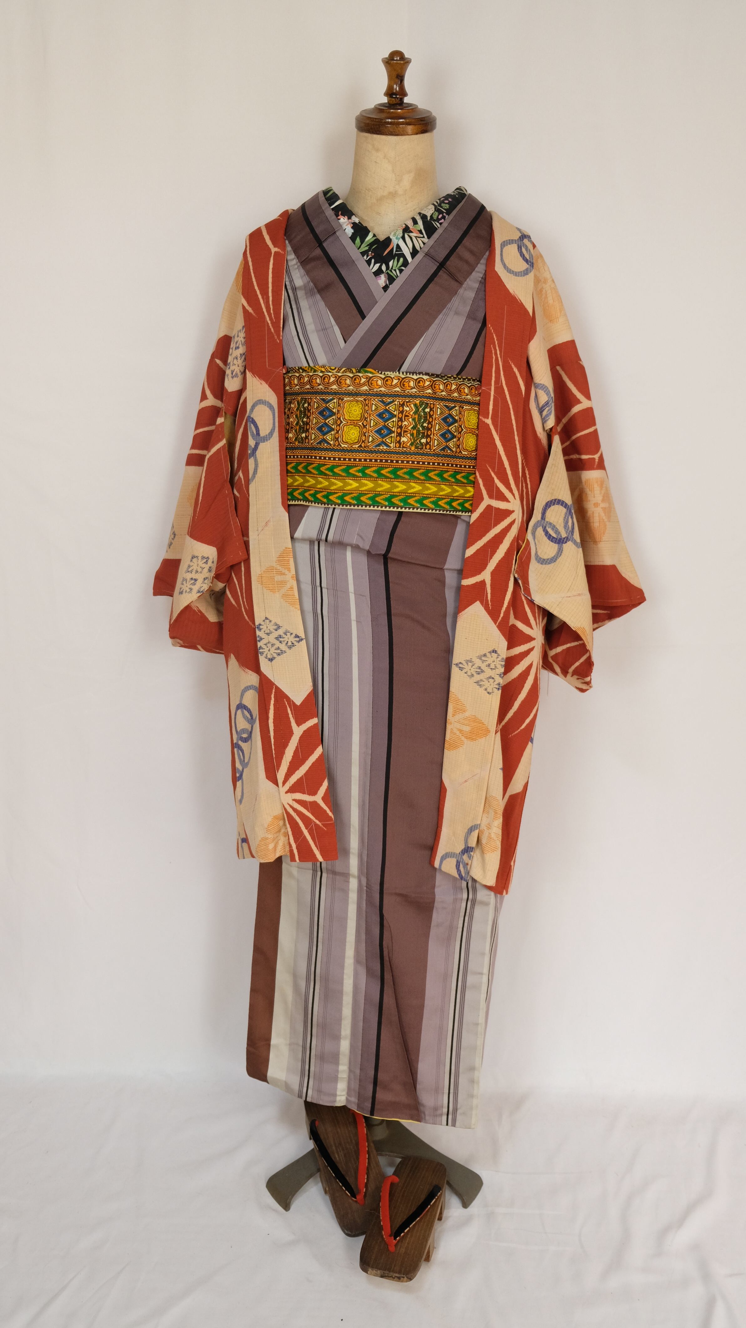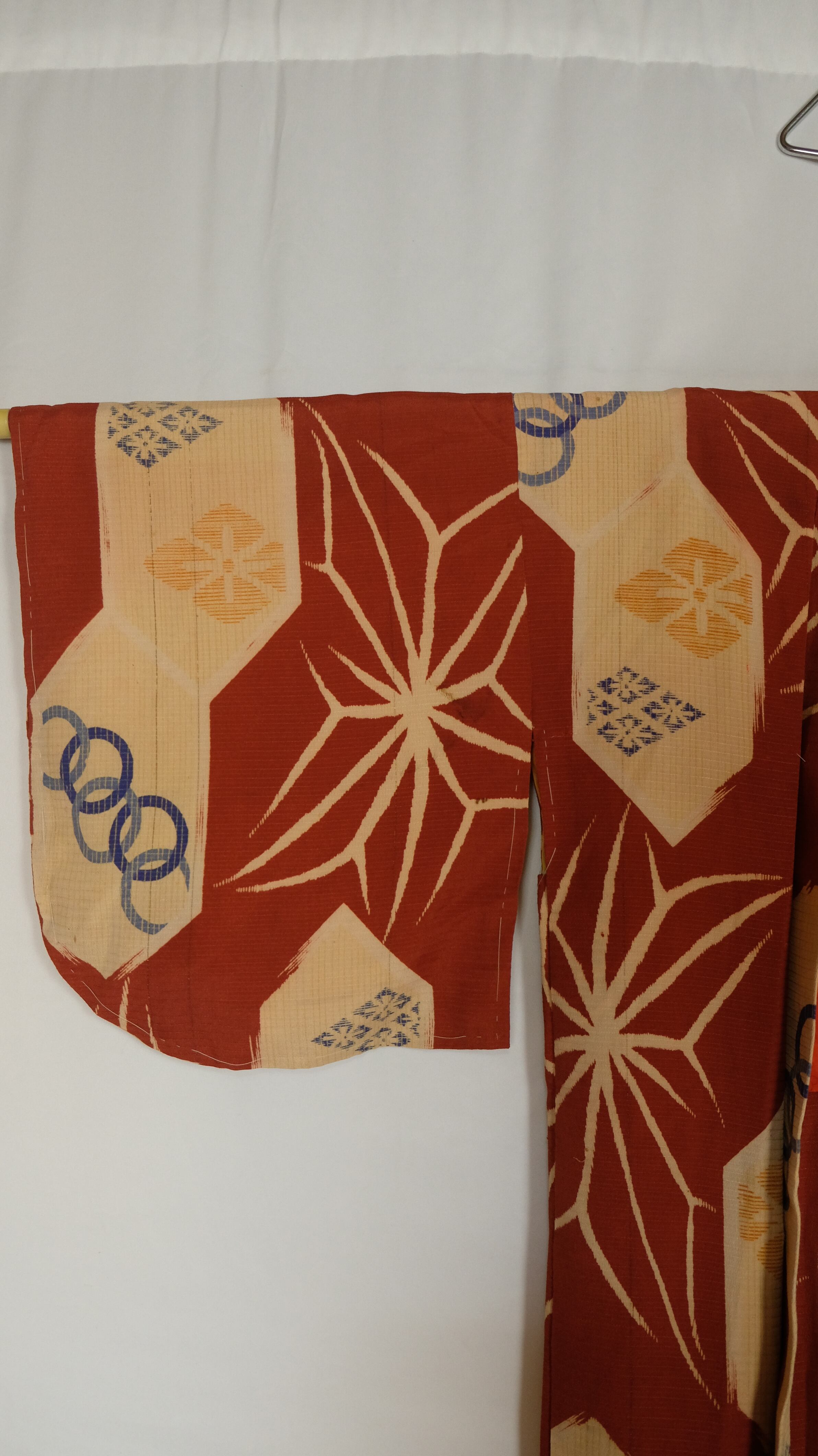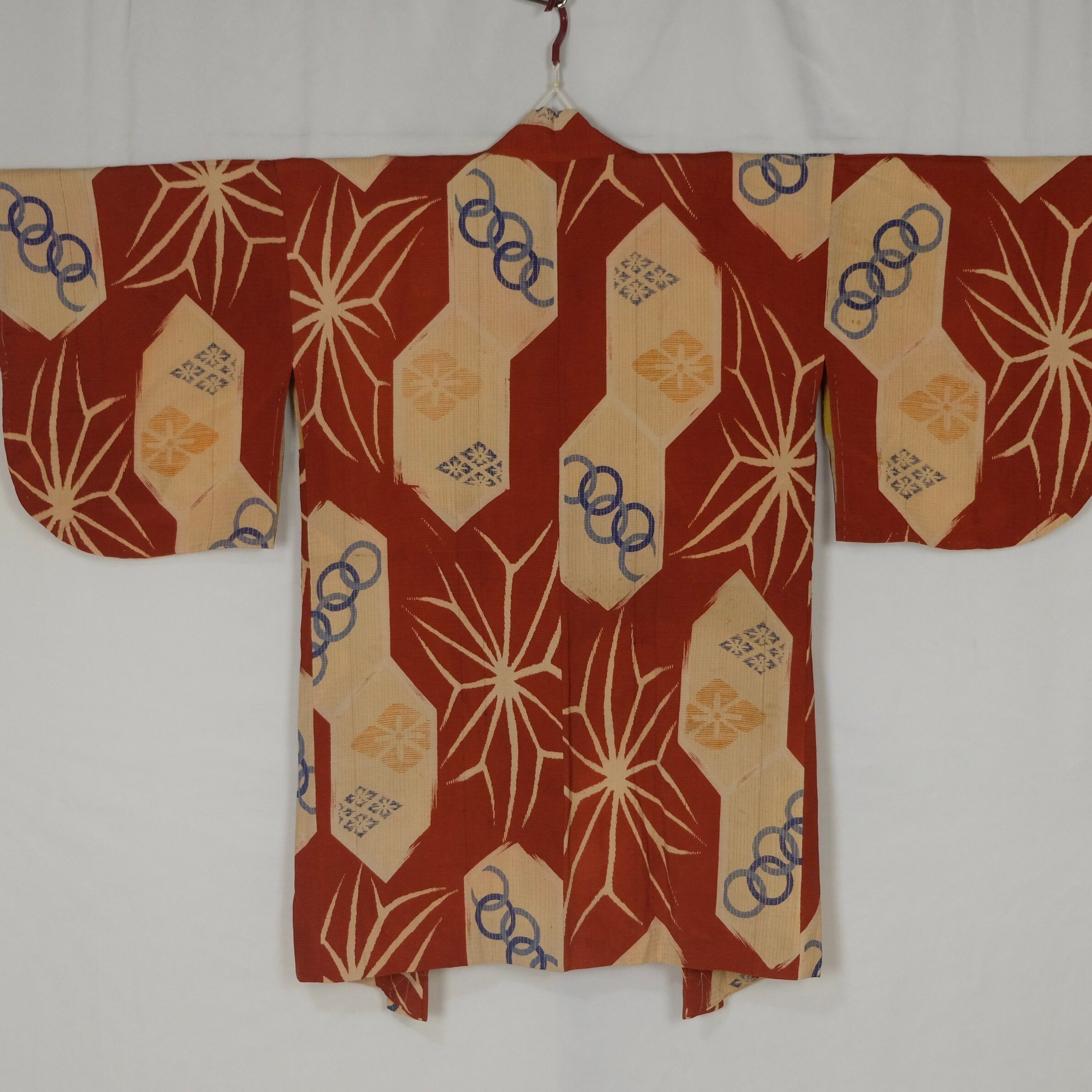 その中に 菱花模様と輪模様 が薄オレンジと青の2色で描かれたアンティーク羽織です。