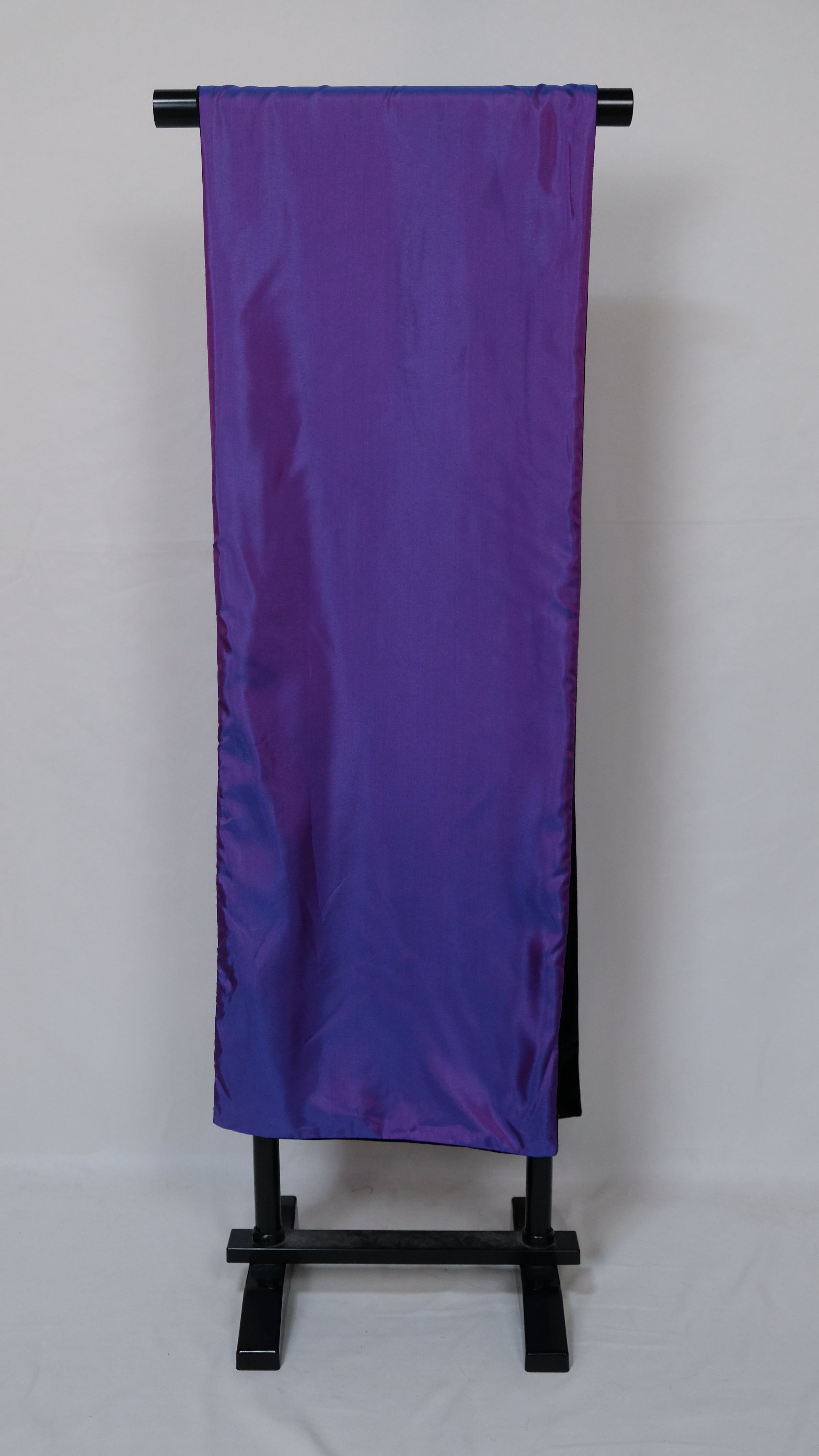 ベルベット特有の柔らかな光沢で、実物はほんのり青みを感じるブラック。裏地の落ち着いたパープルが影響しているのかもしれません。