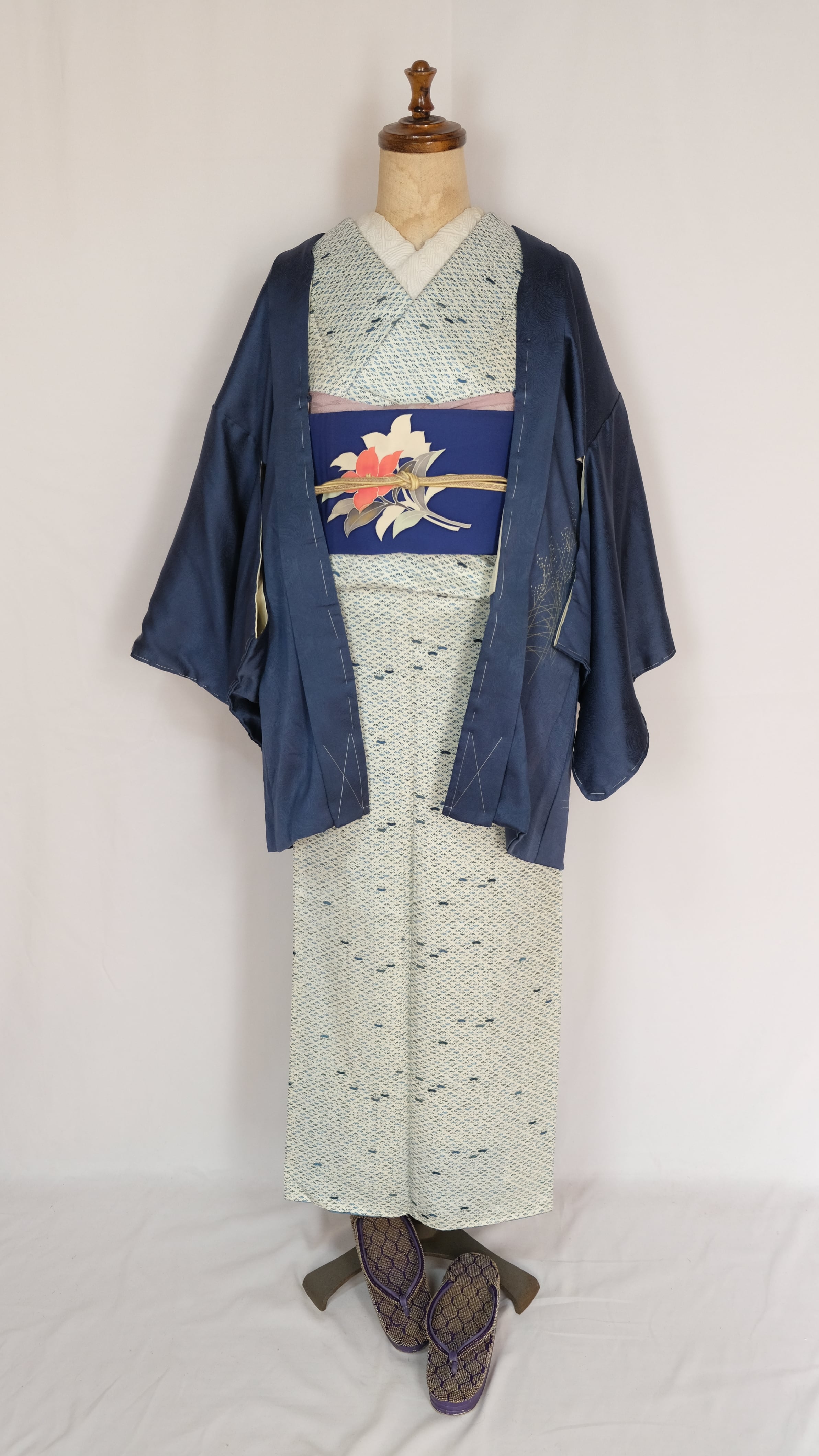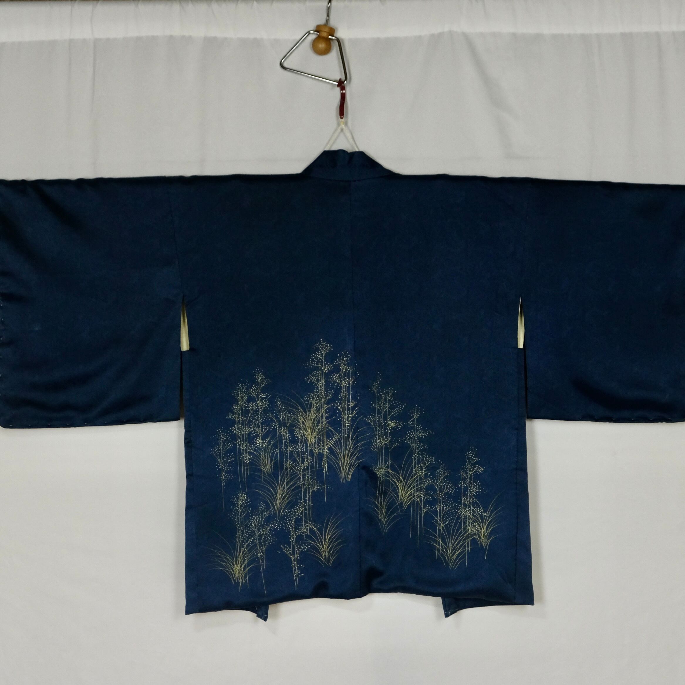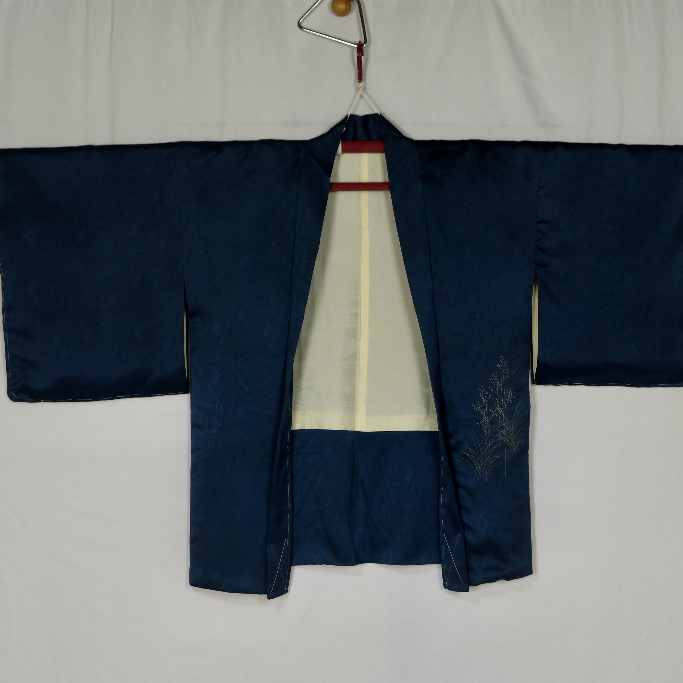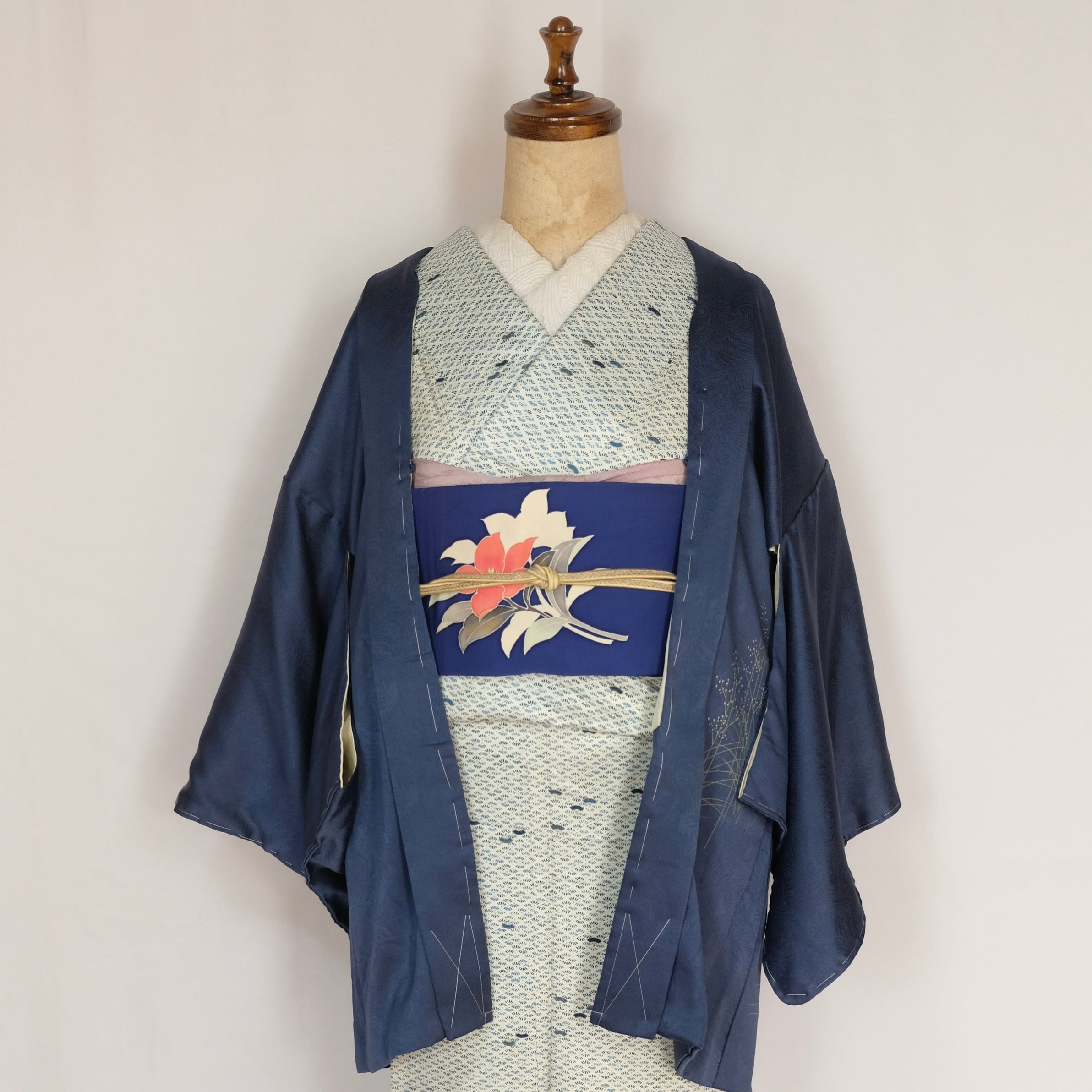 紺色の地に、羽根のような地紋が織りで入り、裾には草木のような手描き柄がすっと流れる羽織です。