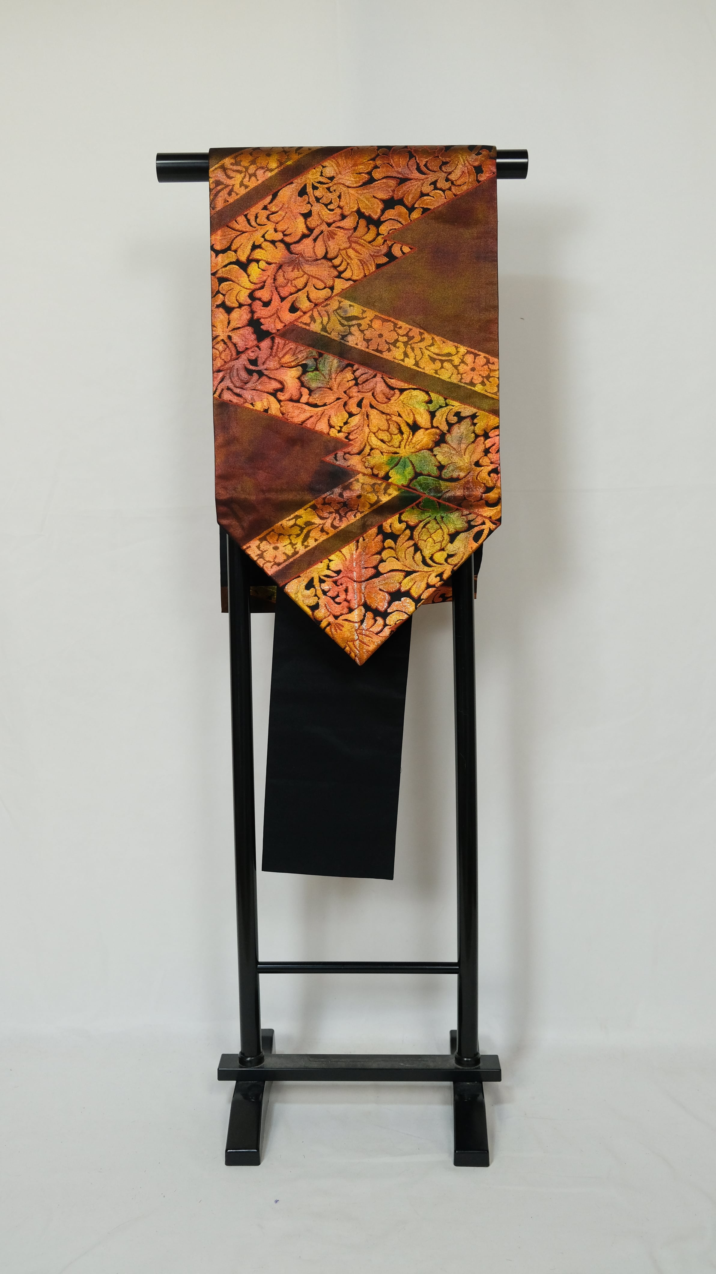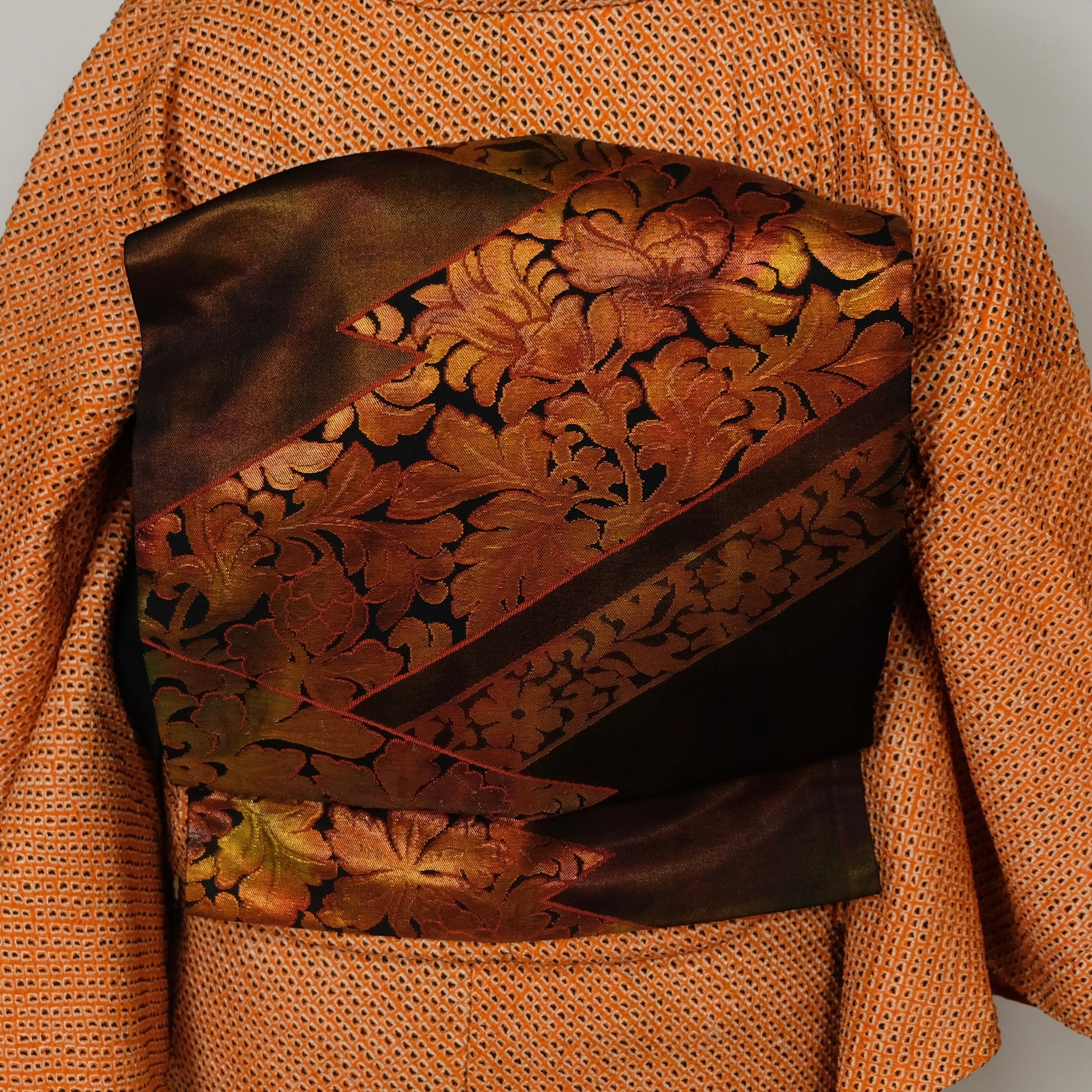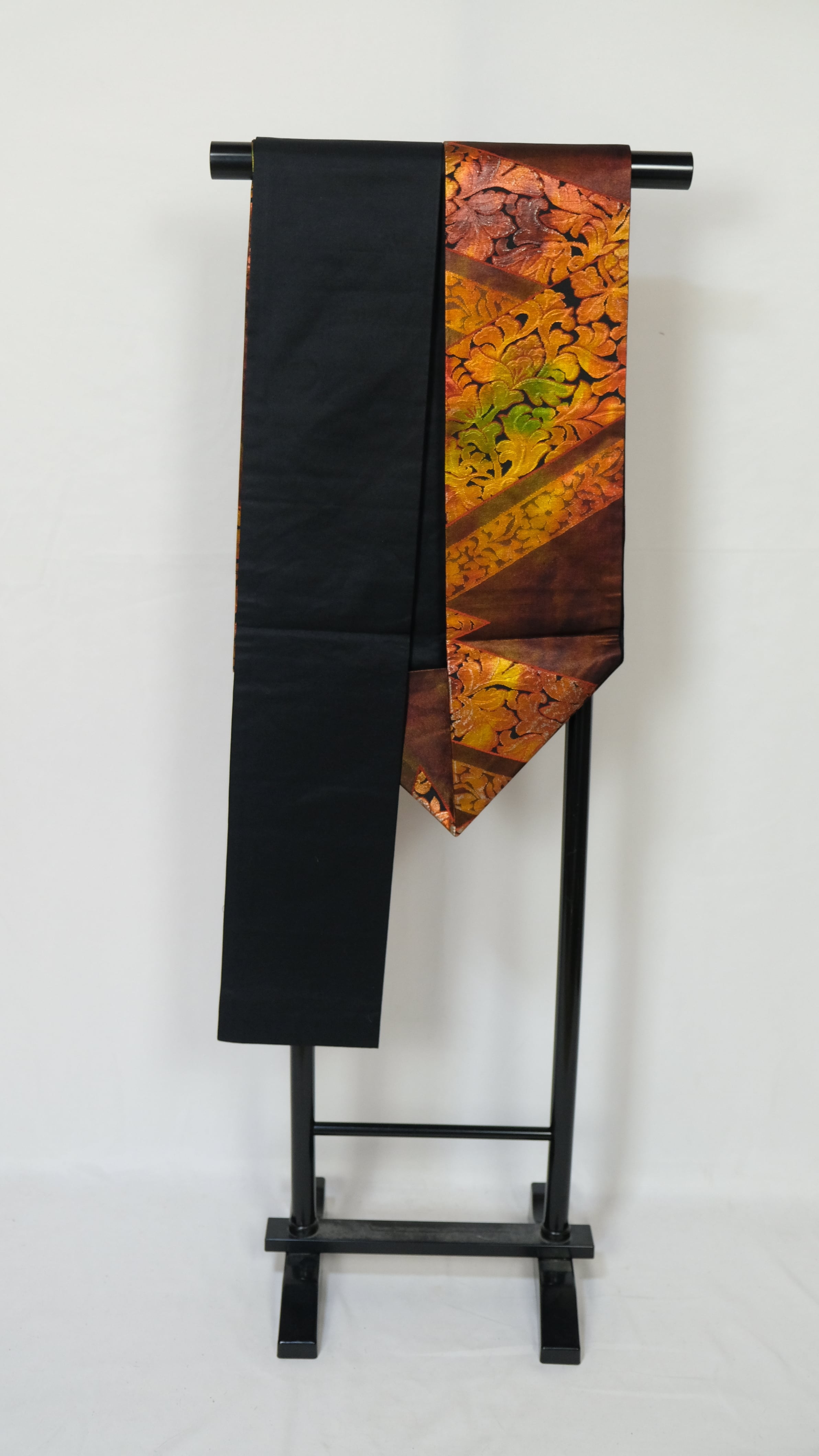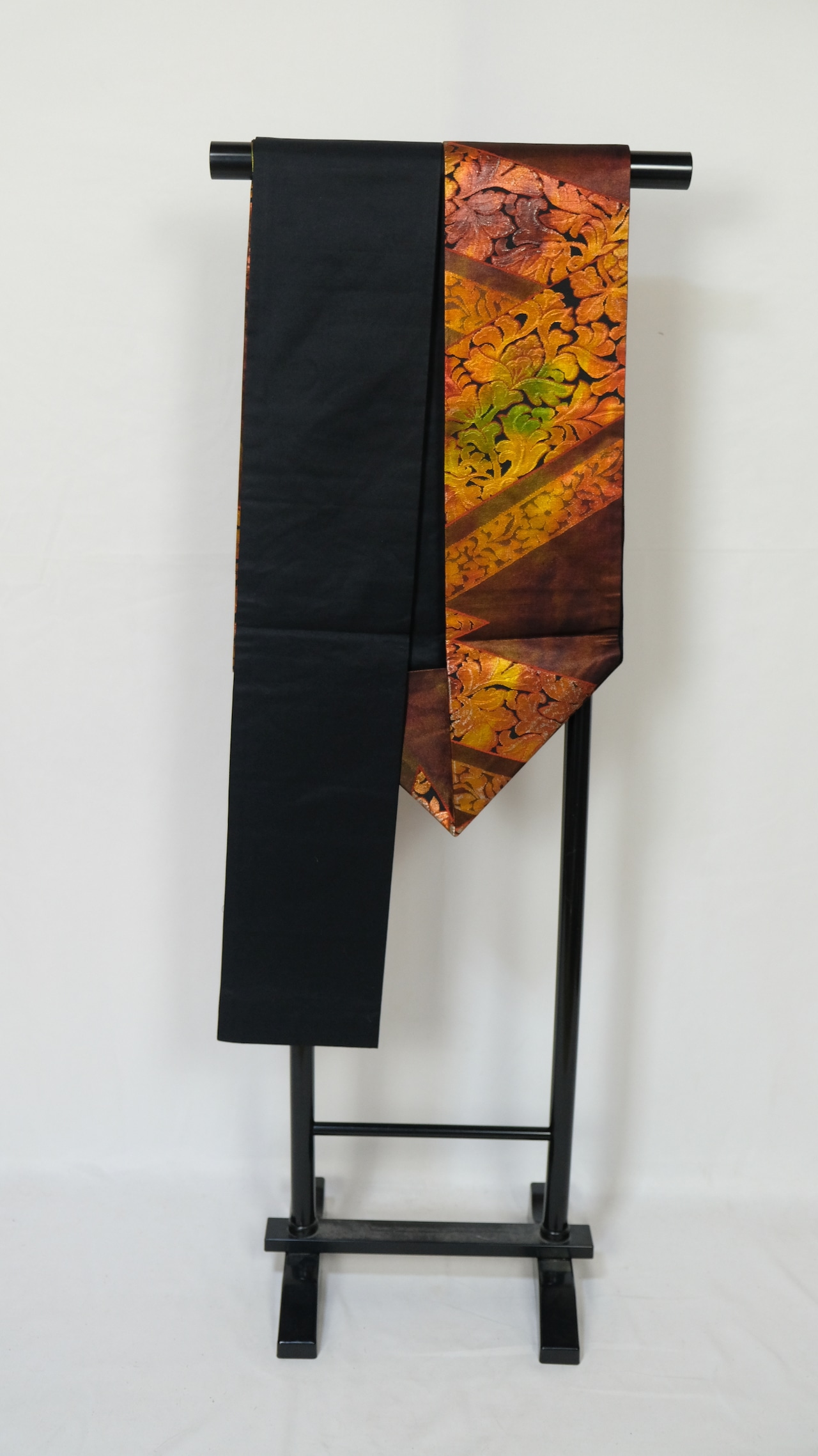 黒をベースに、レンガ色やオレンジ色で描かれた抽象的な草花模様が印象的な名古屋帯です。線で区切られた中に大胆にデザインされており、全体にほどよい箔の光沢があることで、ツヤのあるモードな雰囲気にまとまった一本。黒は帯を閉めたときに中に入り込むので、基本的には着用時は見えない部分になります。