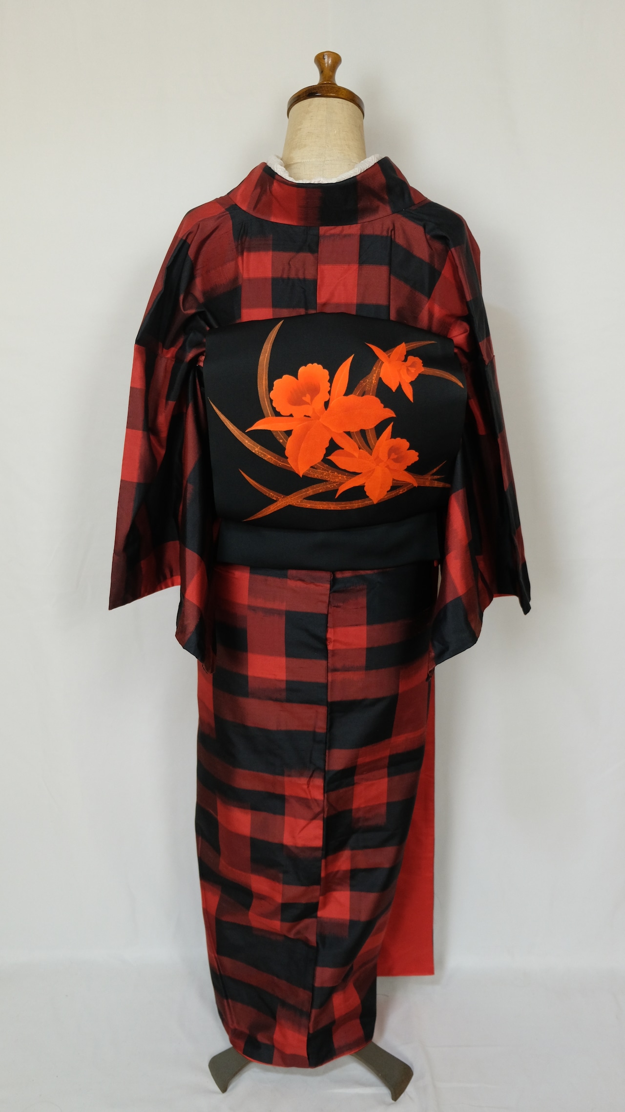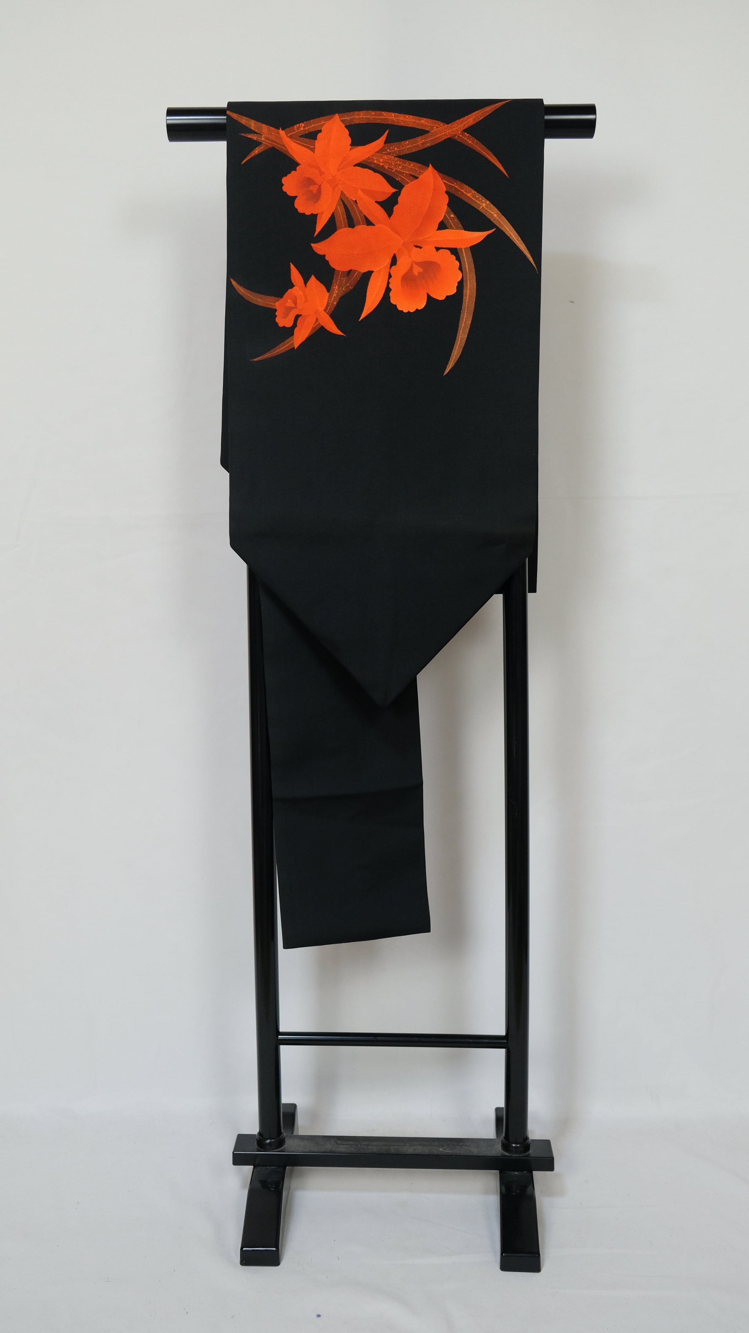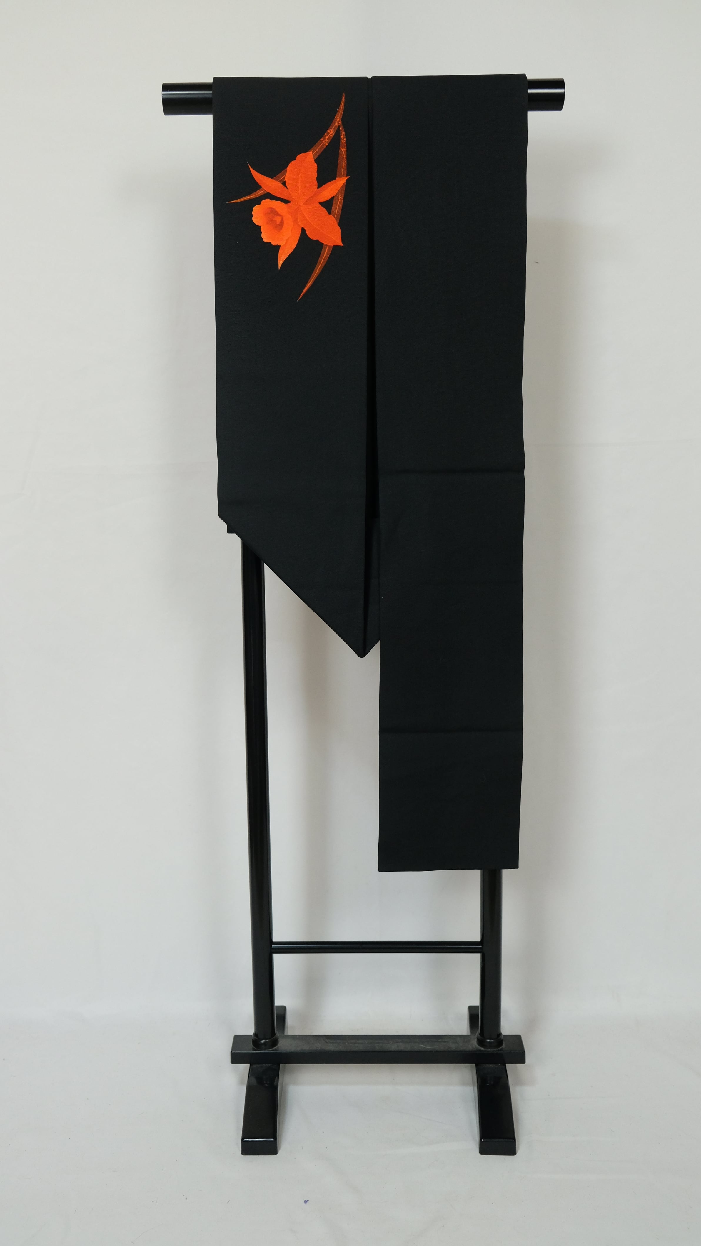 黒地に、オレンジに近い赤で花が手描きされたワンポイントの名古屋帯です。