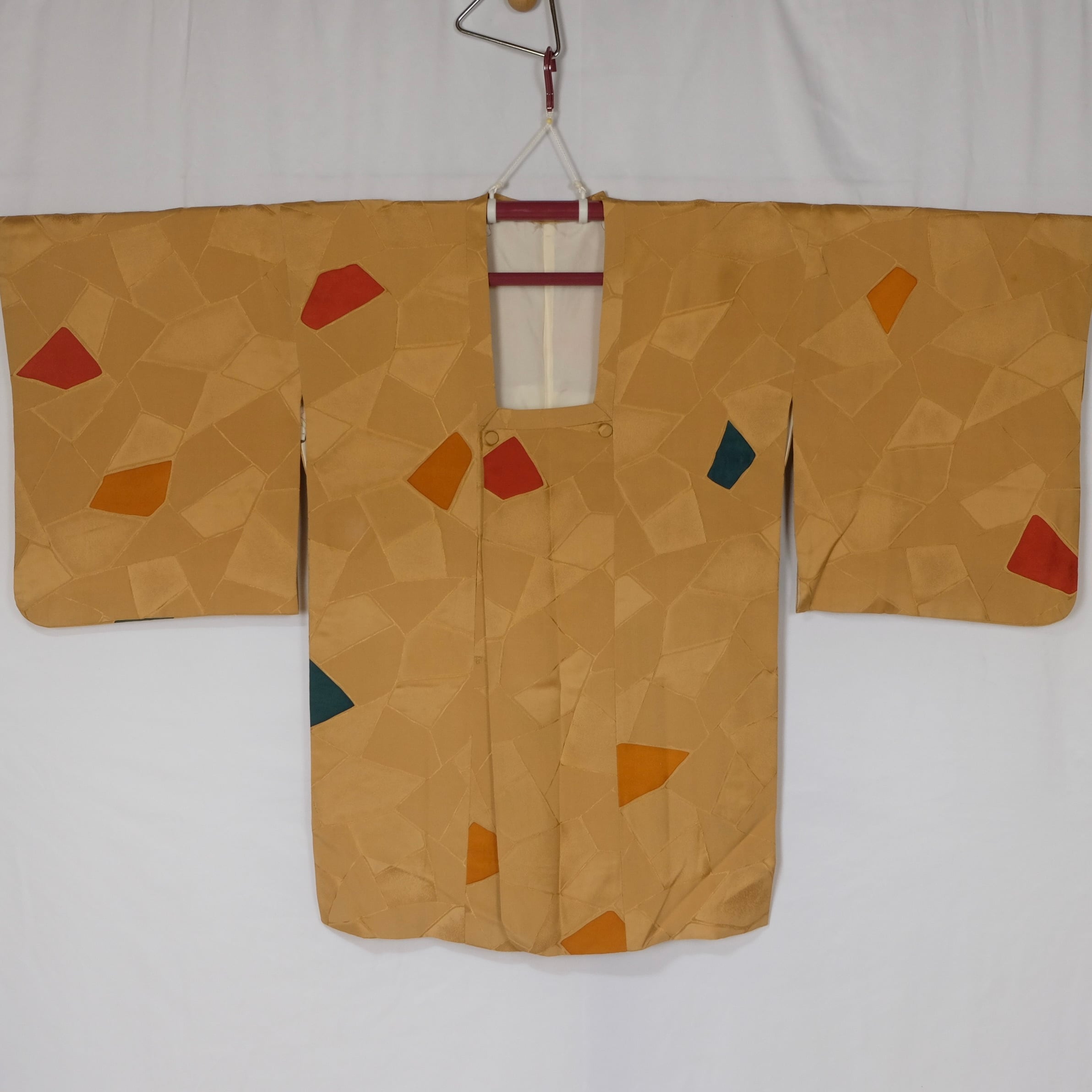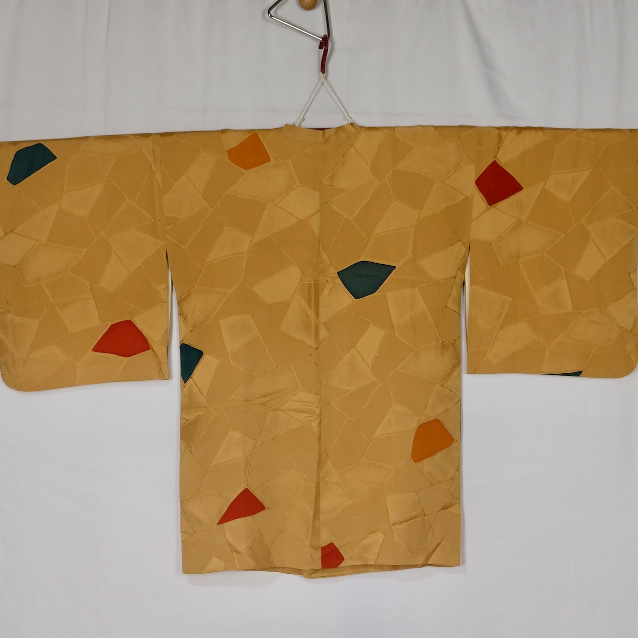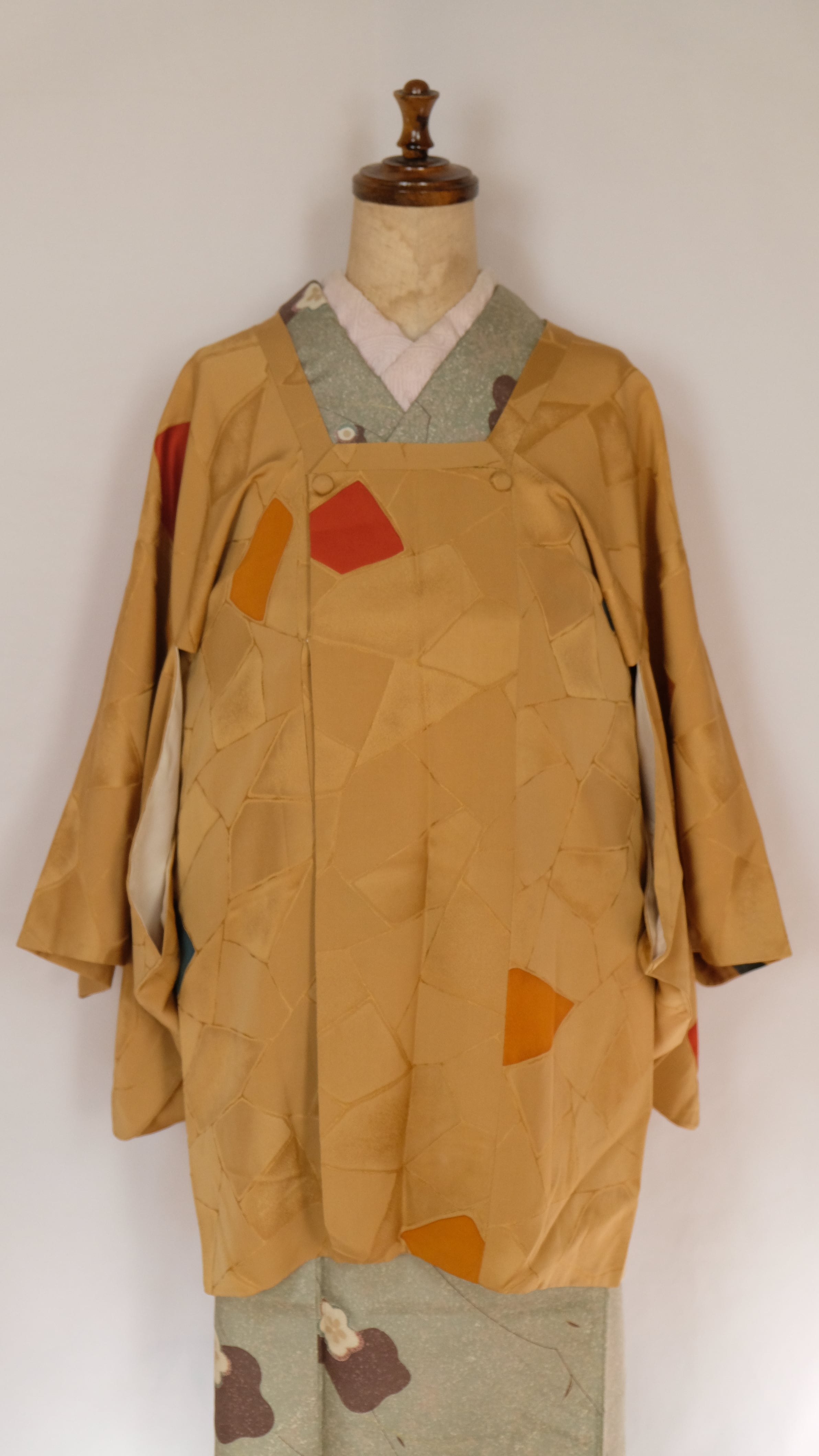 辛子色が地色に綾子でタイルの様なデザインがされた、道行です。