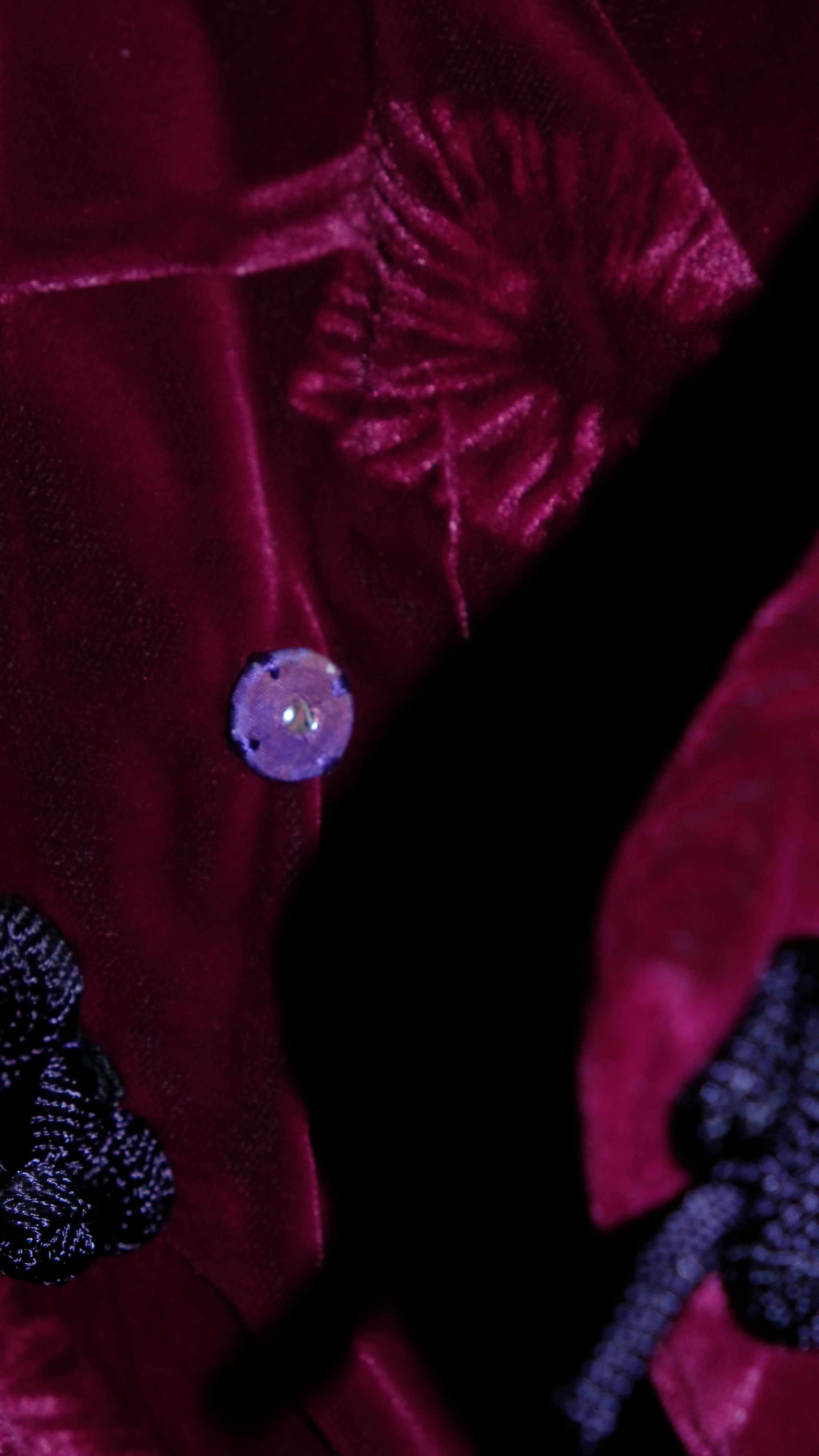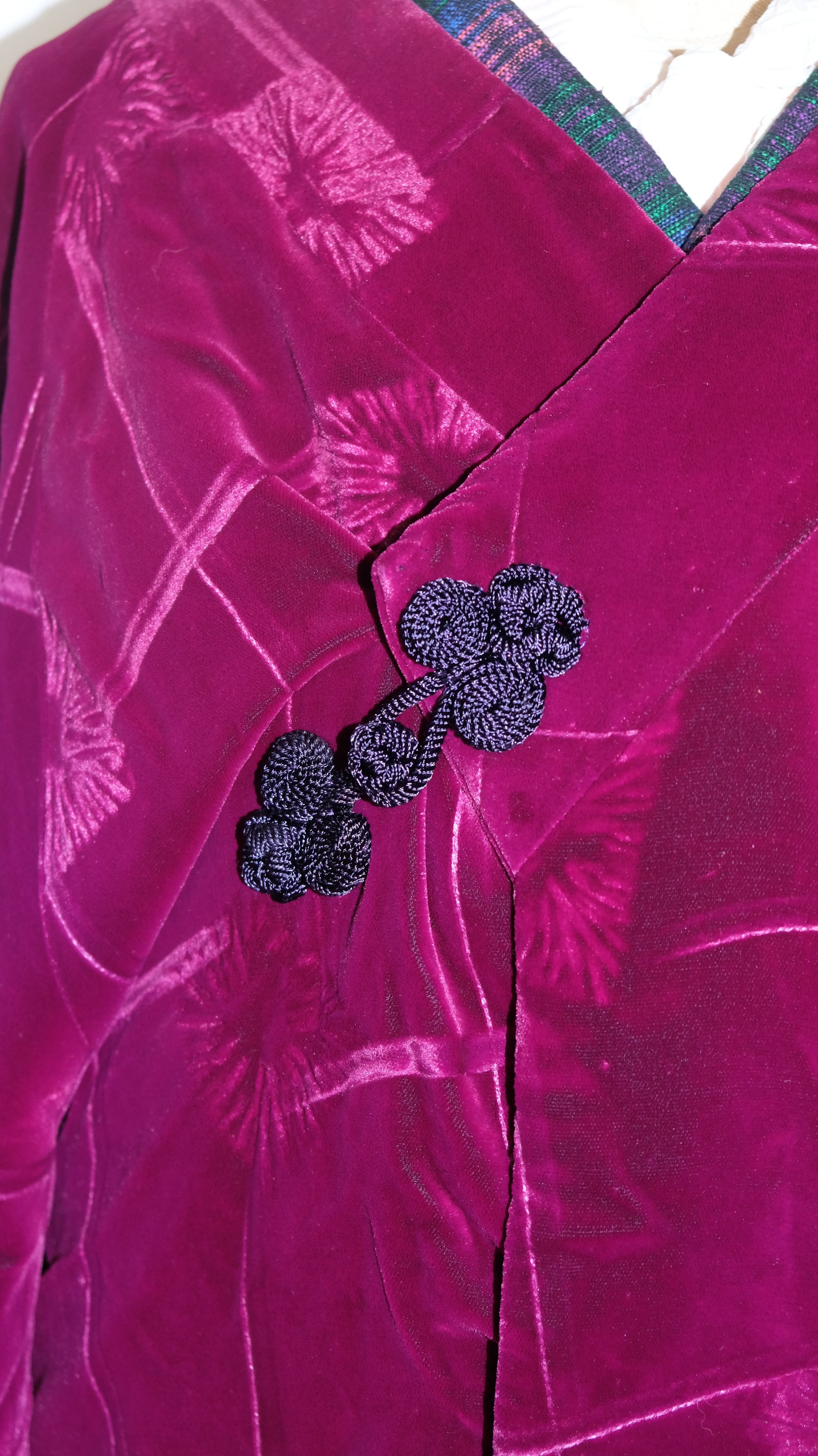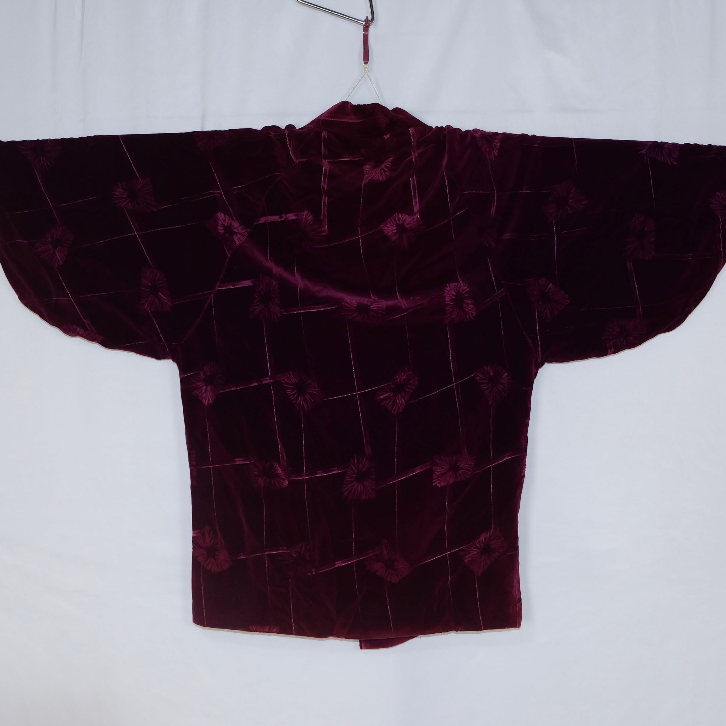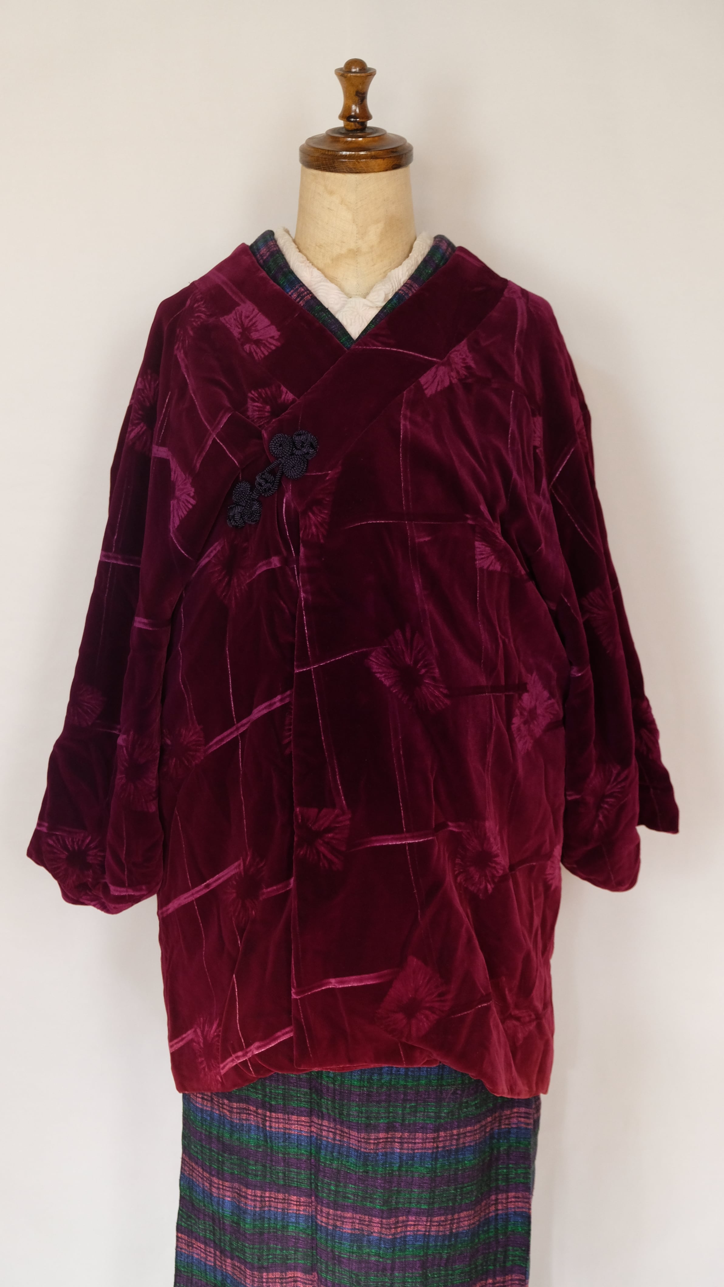 深いワインレッド色のベルベットの着物様コートです。この手のコートには珍しい、格子柄に飛び柄で花柄がデザインされています。ボタンだけでなく、紐の飾りが留め具としてもついており、また襟のデザインも個性的で、現代ではなかなかいられない、昔の着物コートならではのデザインです。