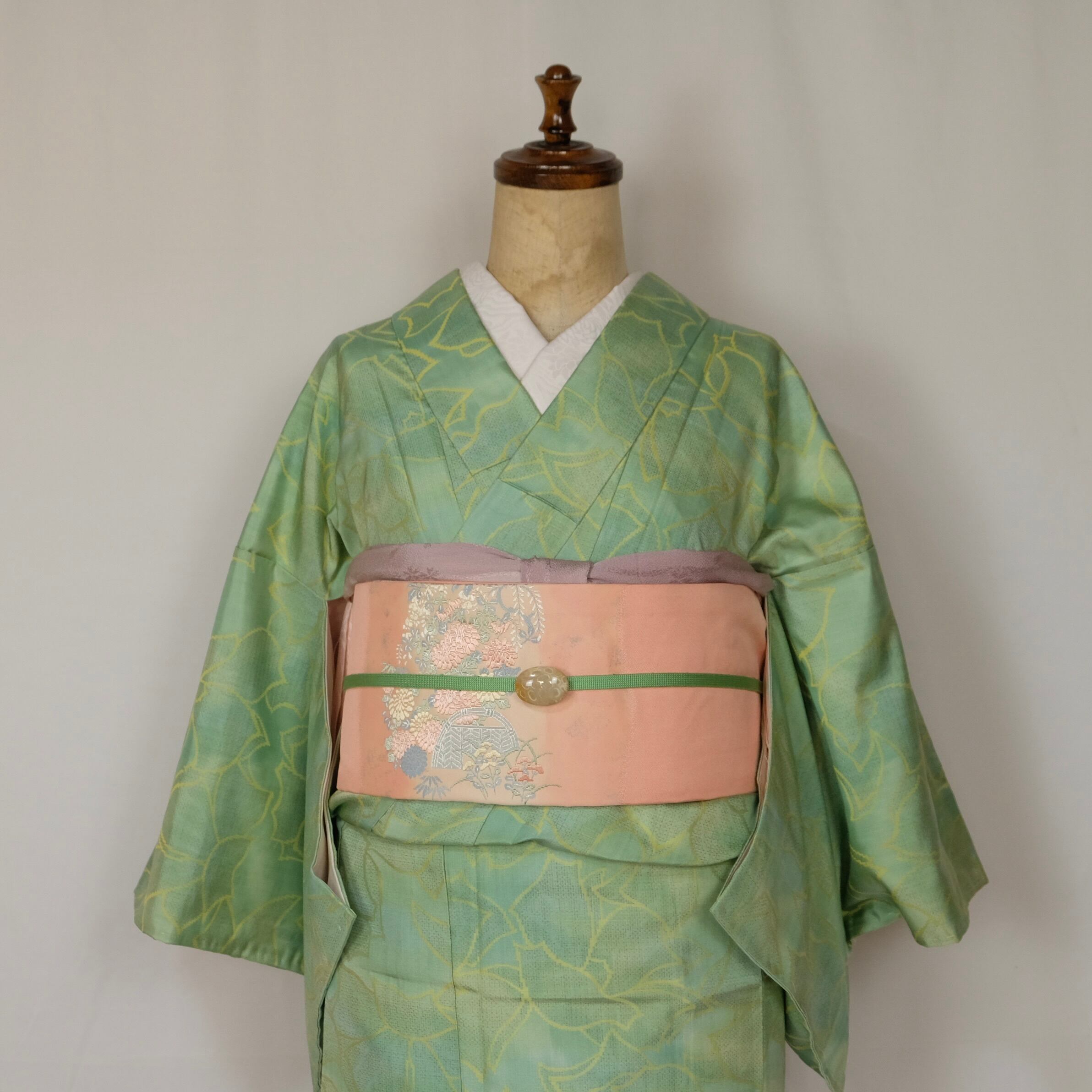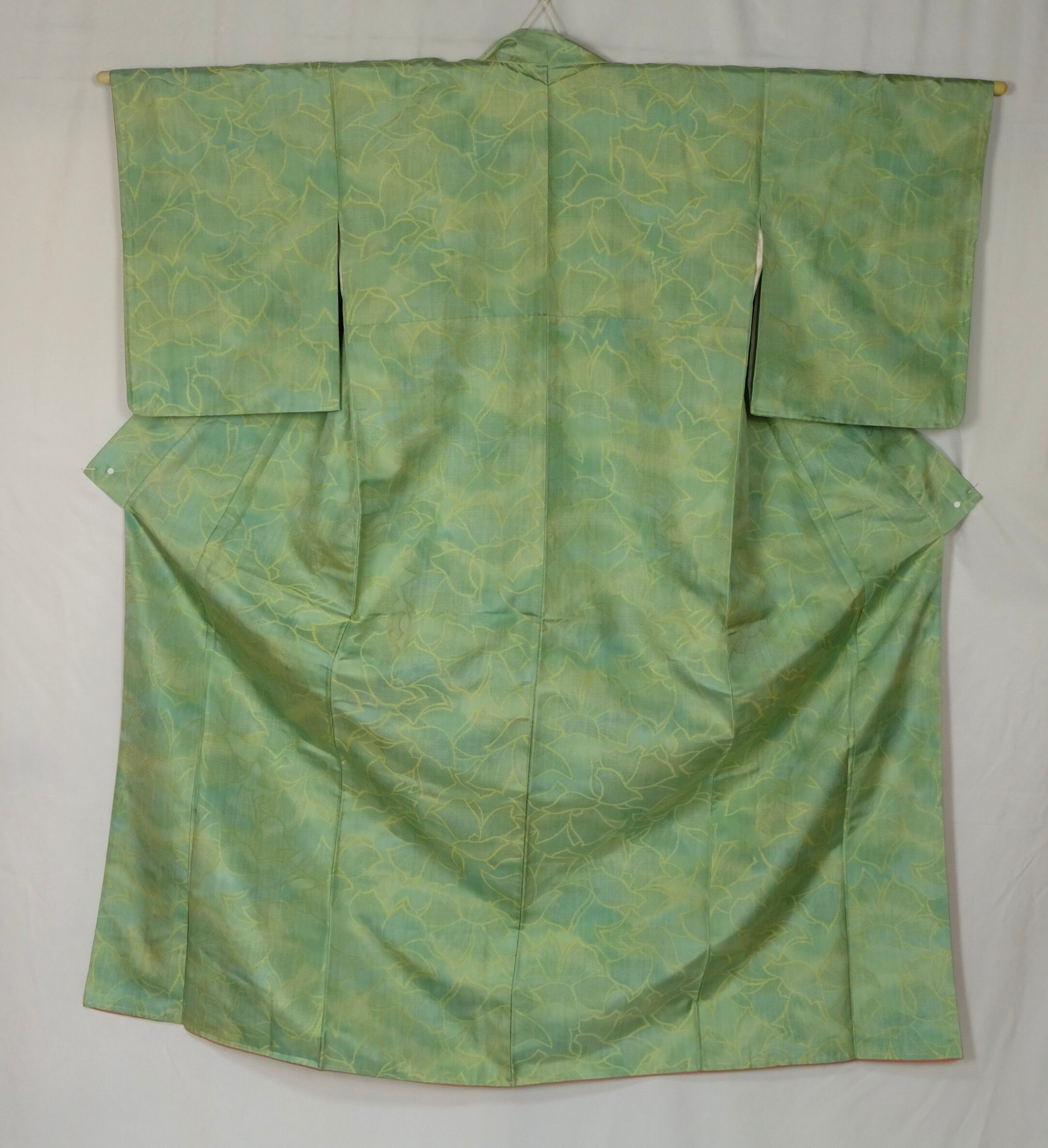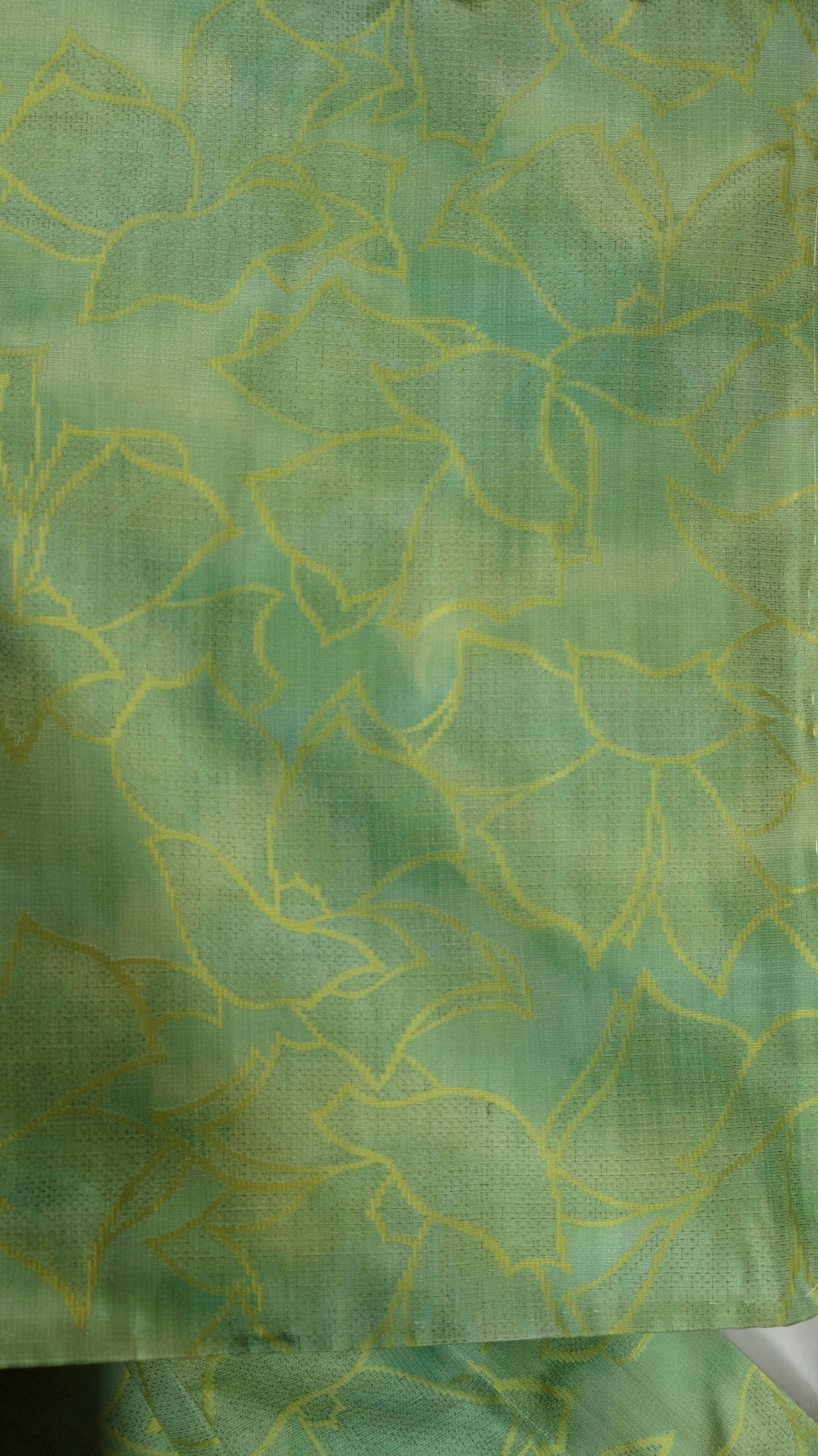 落ち着いた黄緑色に黄色で花の様な葉の様な柄が全体にデザインされた、絣の着物です。