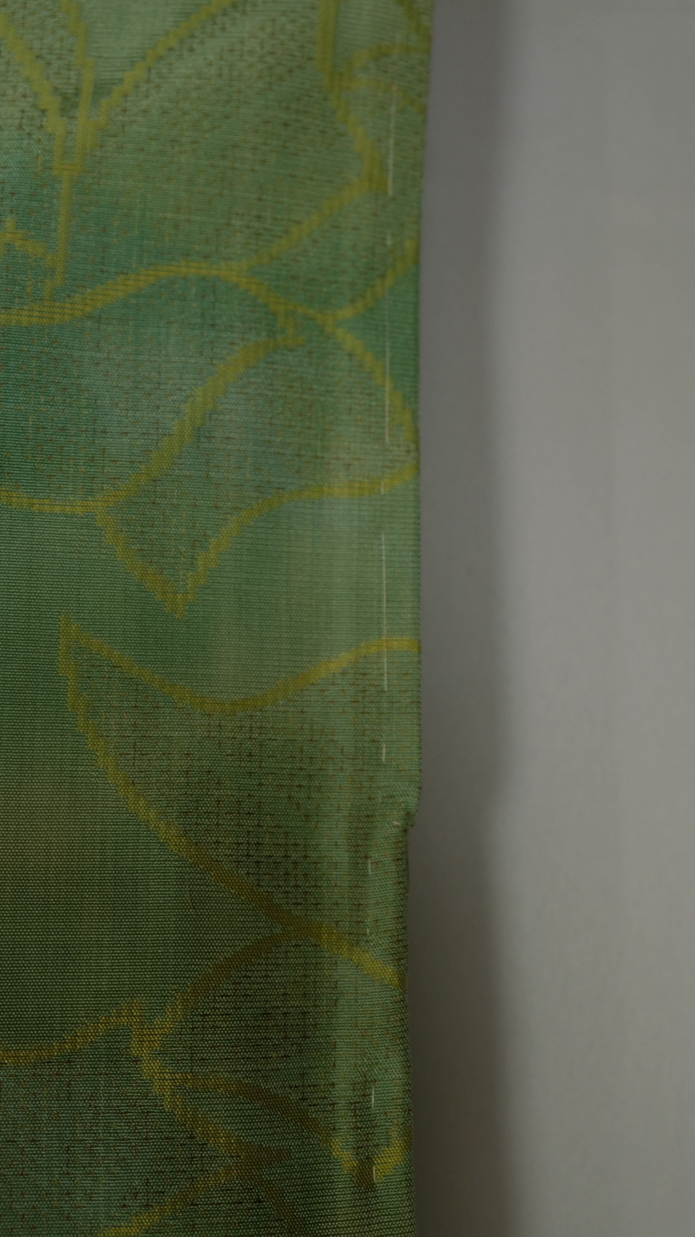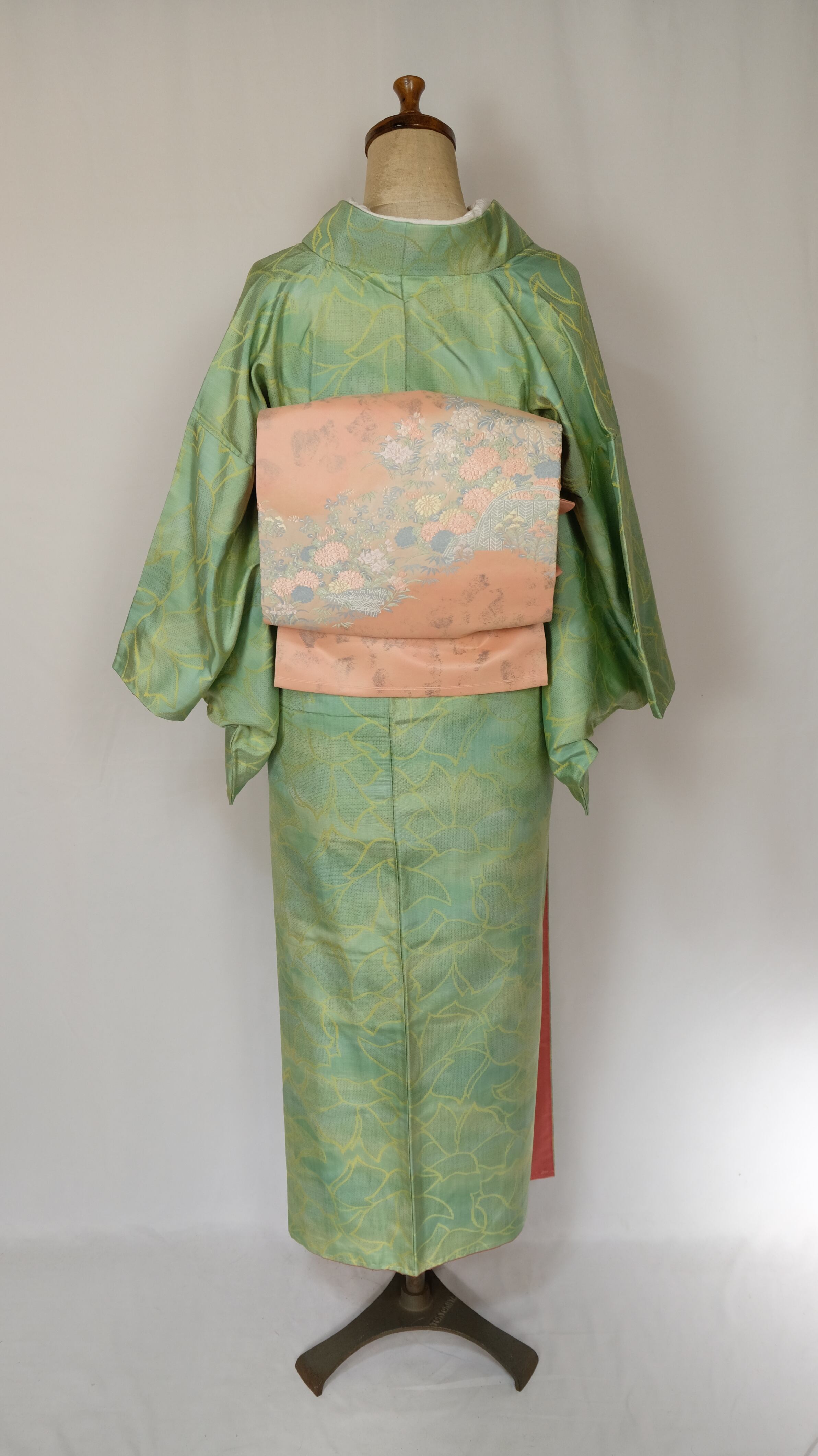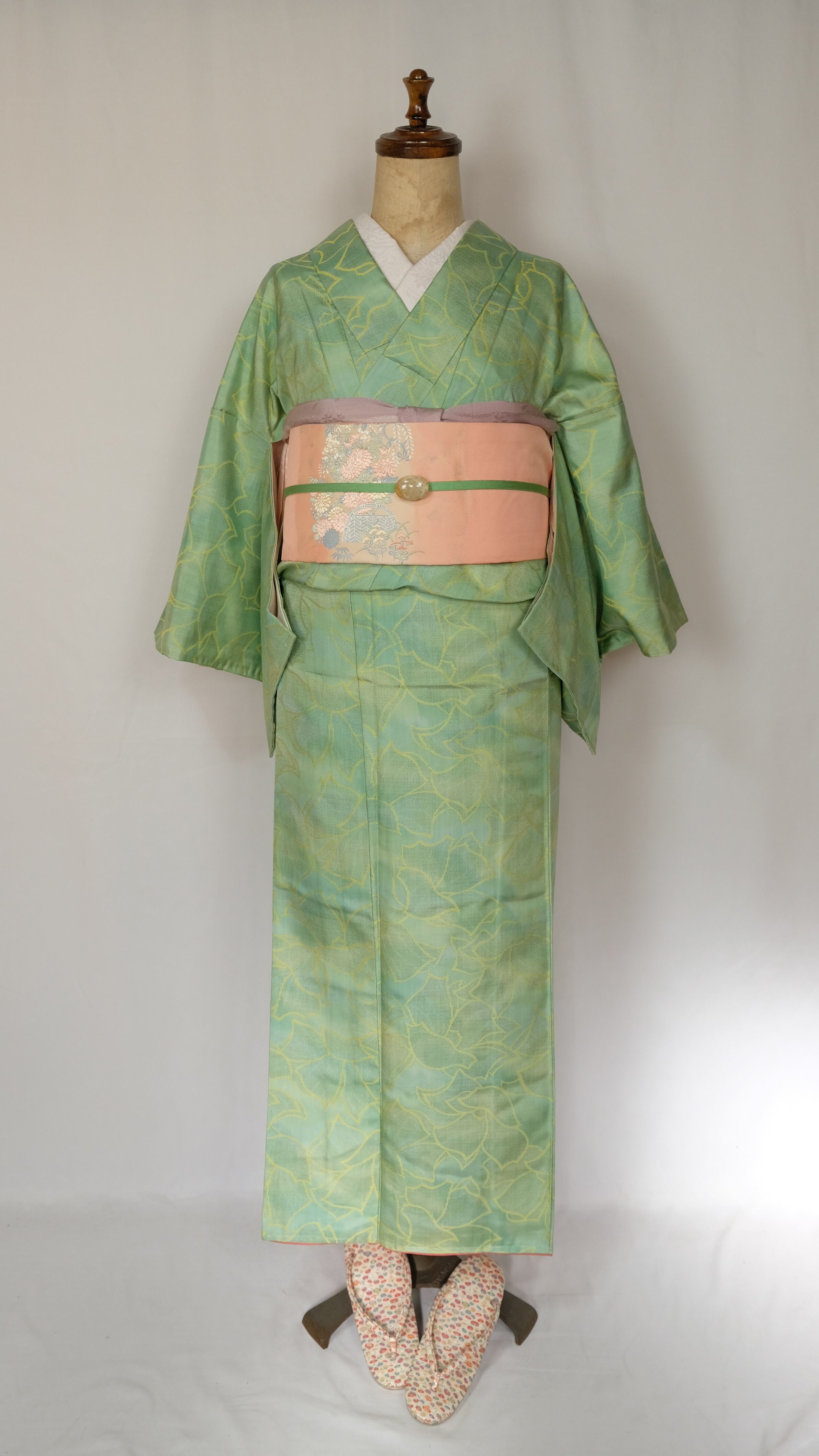 落ち着いた黄緑色に黄色で花の様な葉の様な柄が全体にデザインされた、絣の着物です。