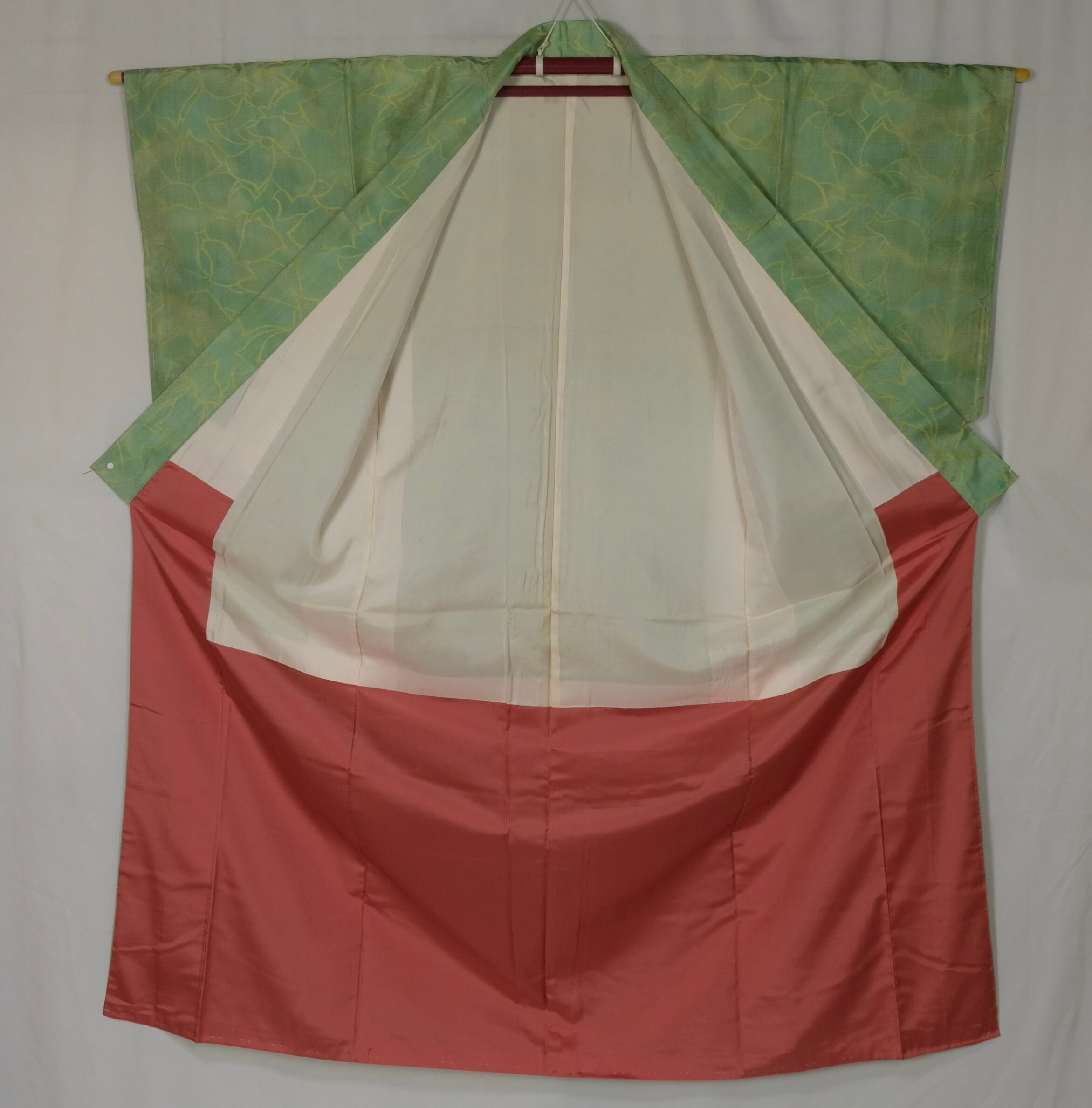 バチ襟仕立てで、ピンク色の八掛が可愛らしい印象を出しています。若干写真だと八掛の赤みが強いかもしれません。