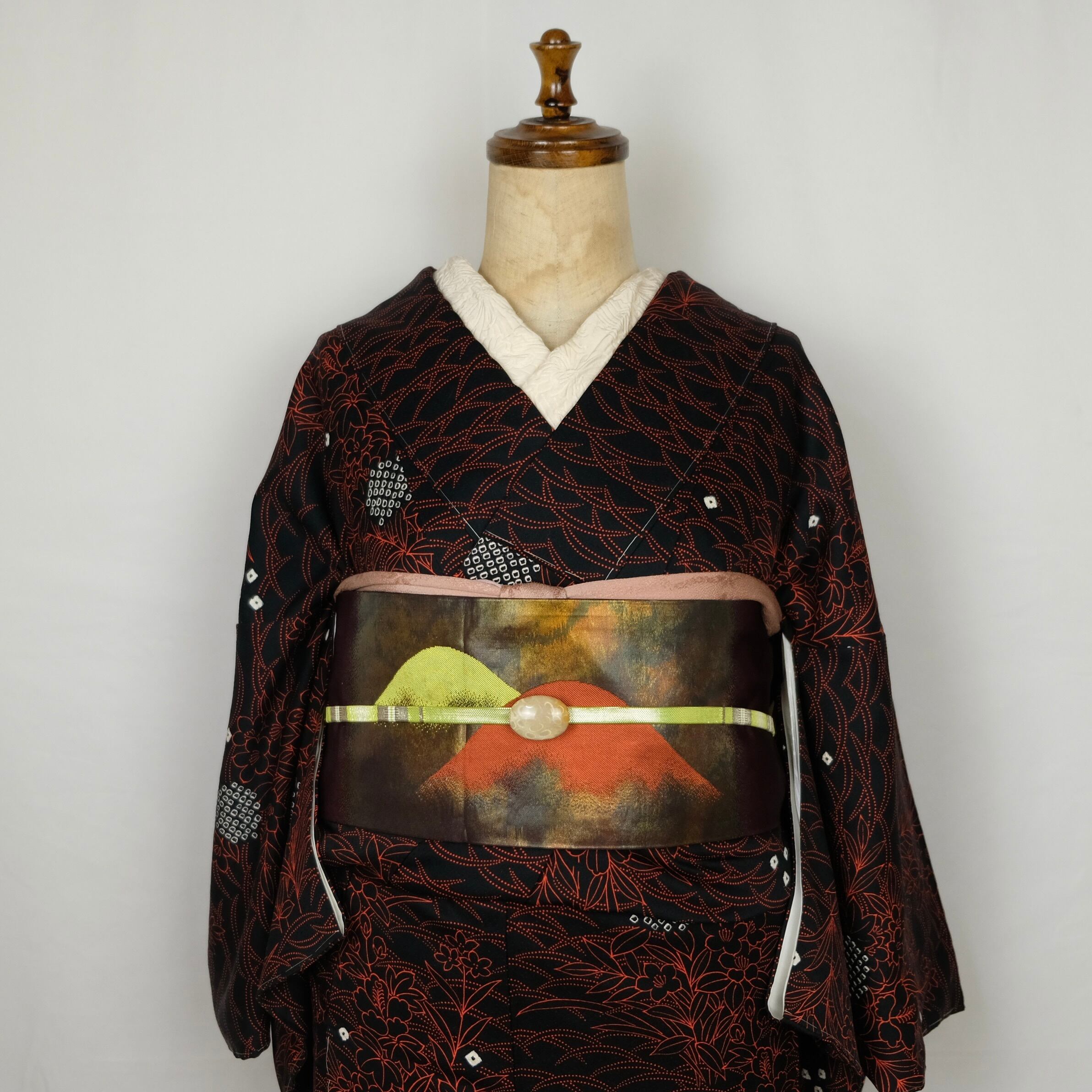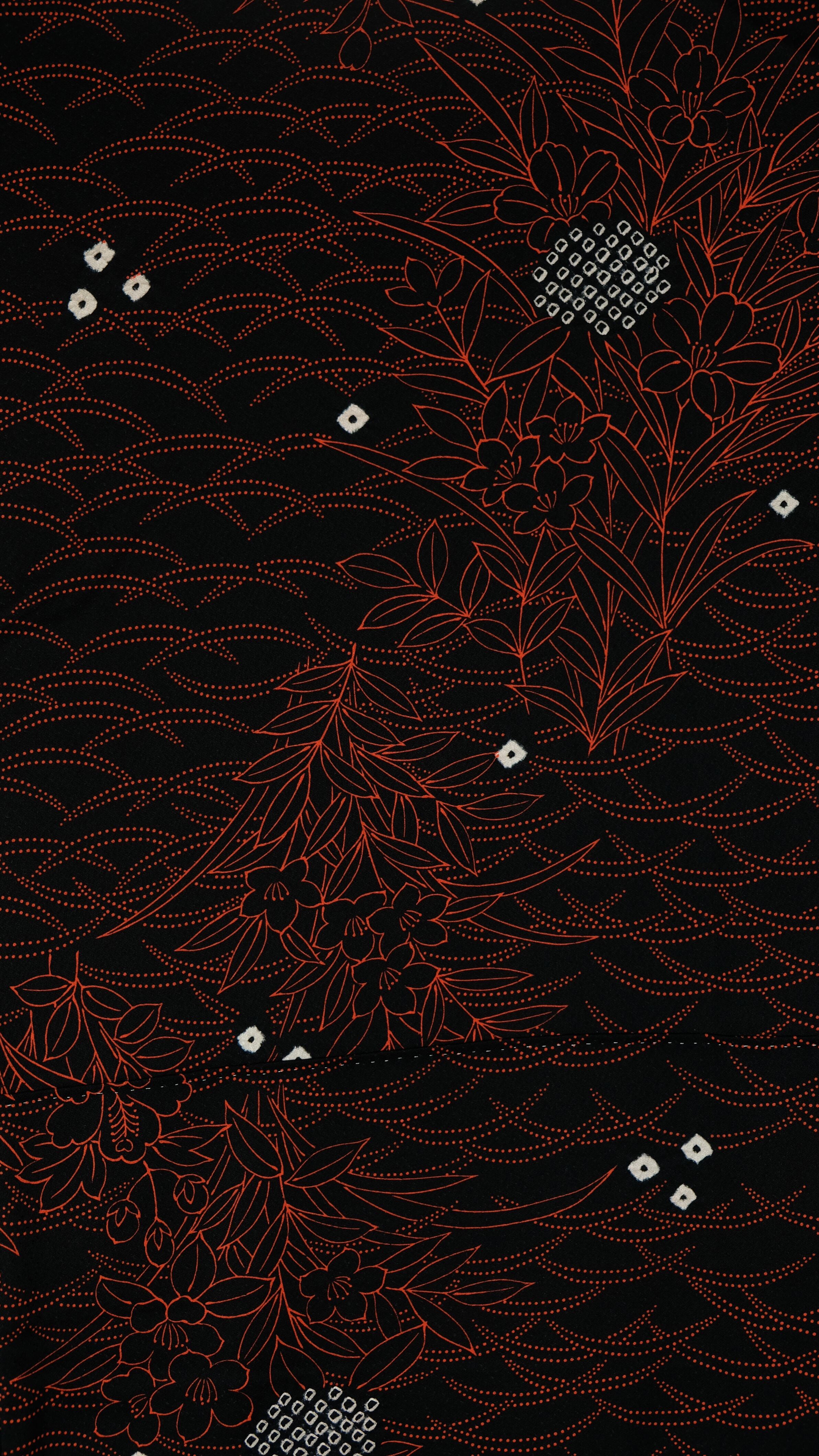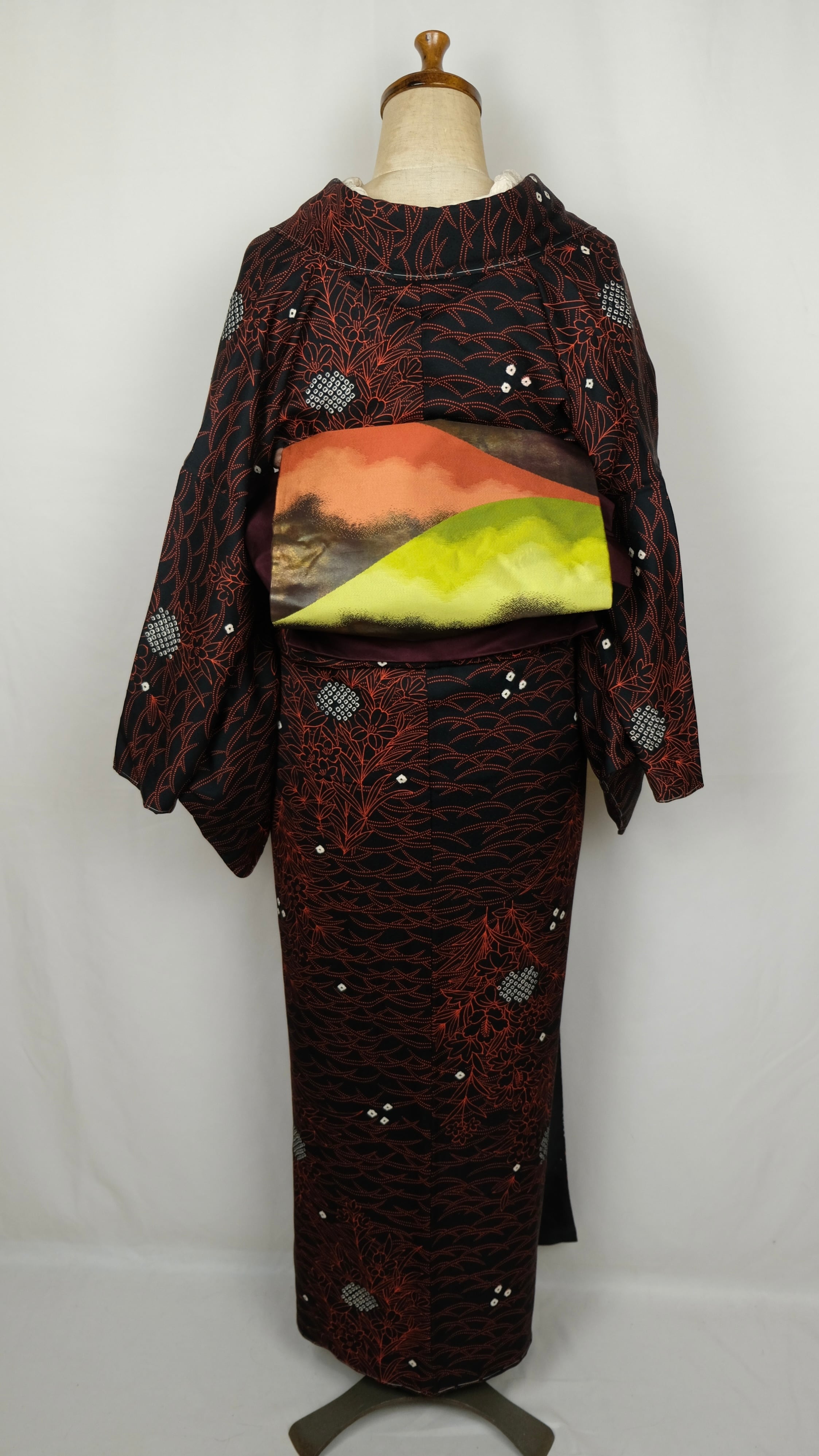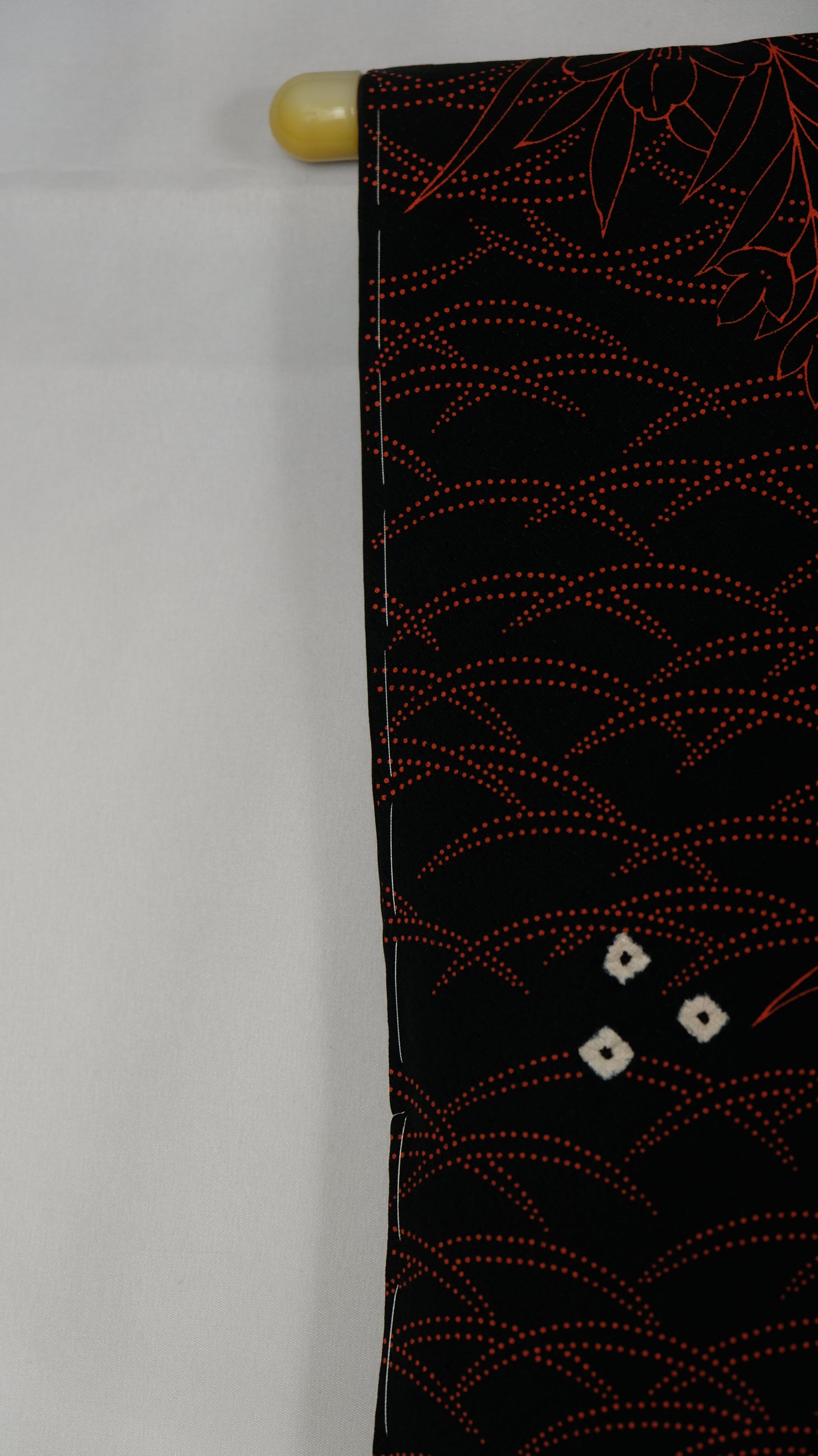 全体を引き締める黒地に、赤で笹の葉と桔梗が デザインされた印象的な小紋です。
