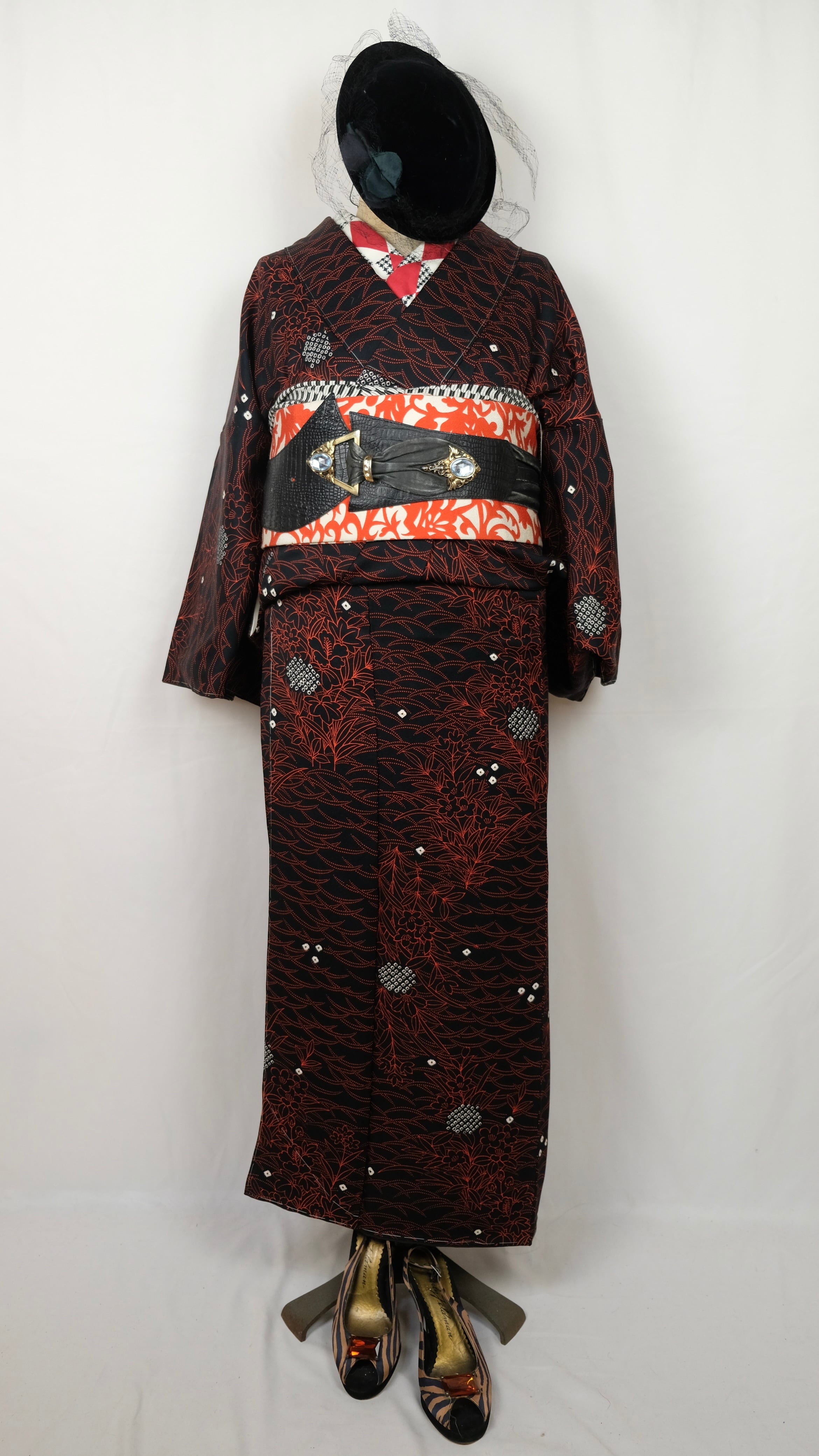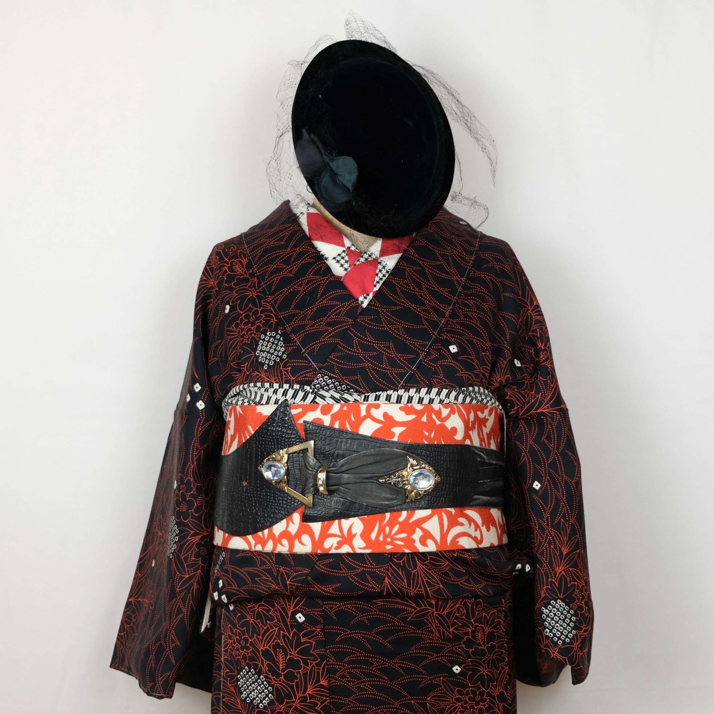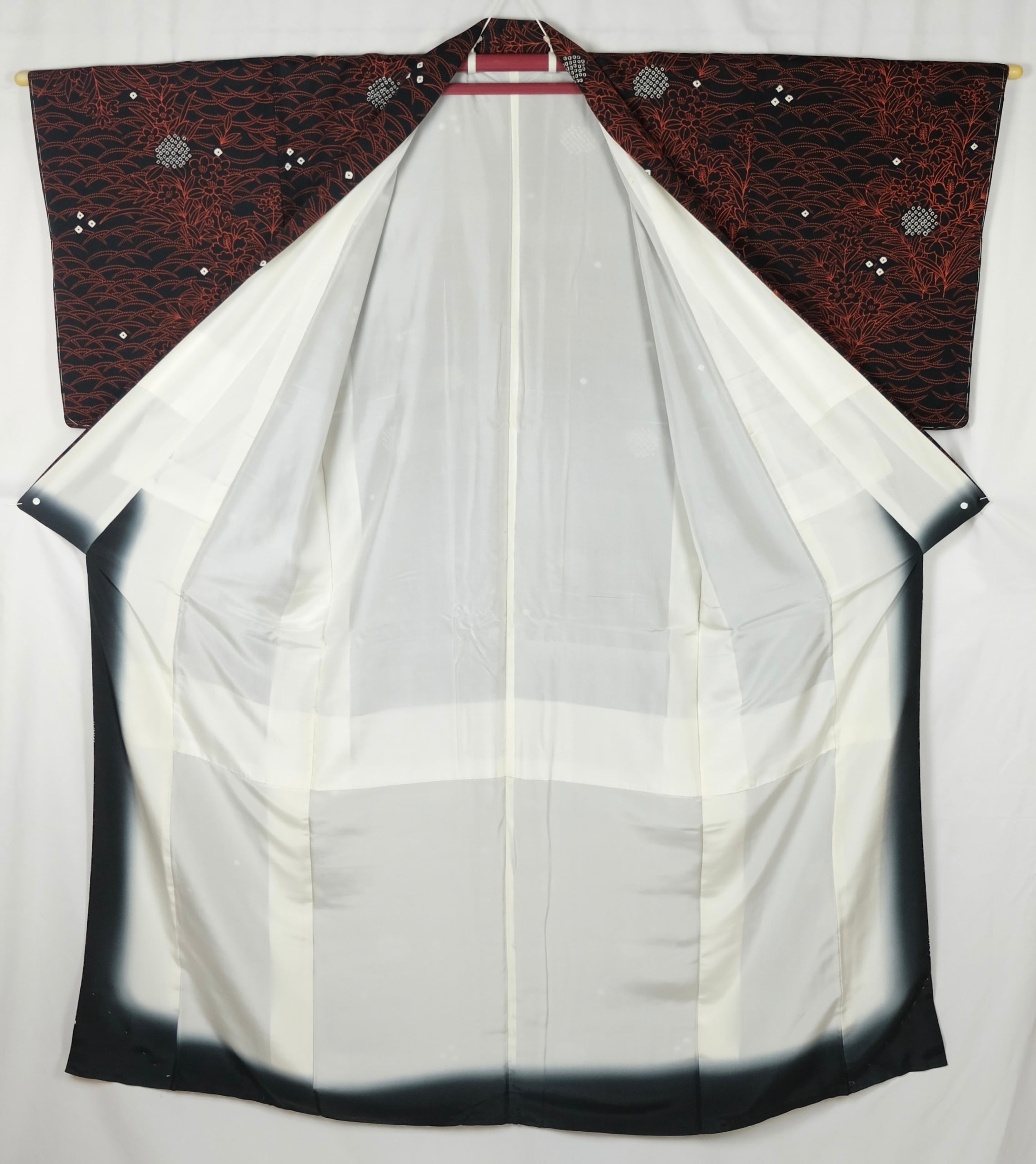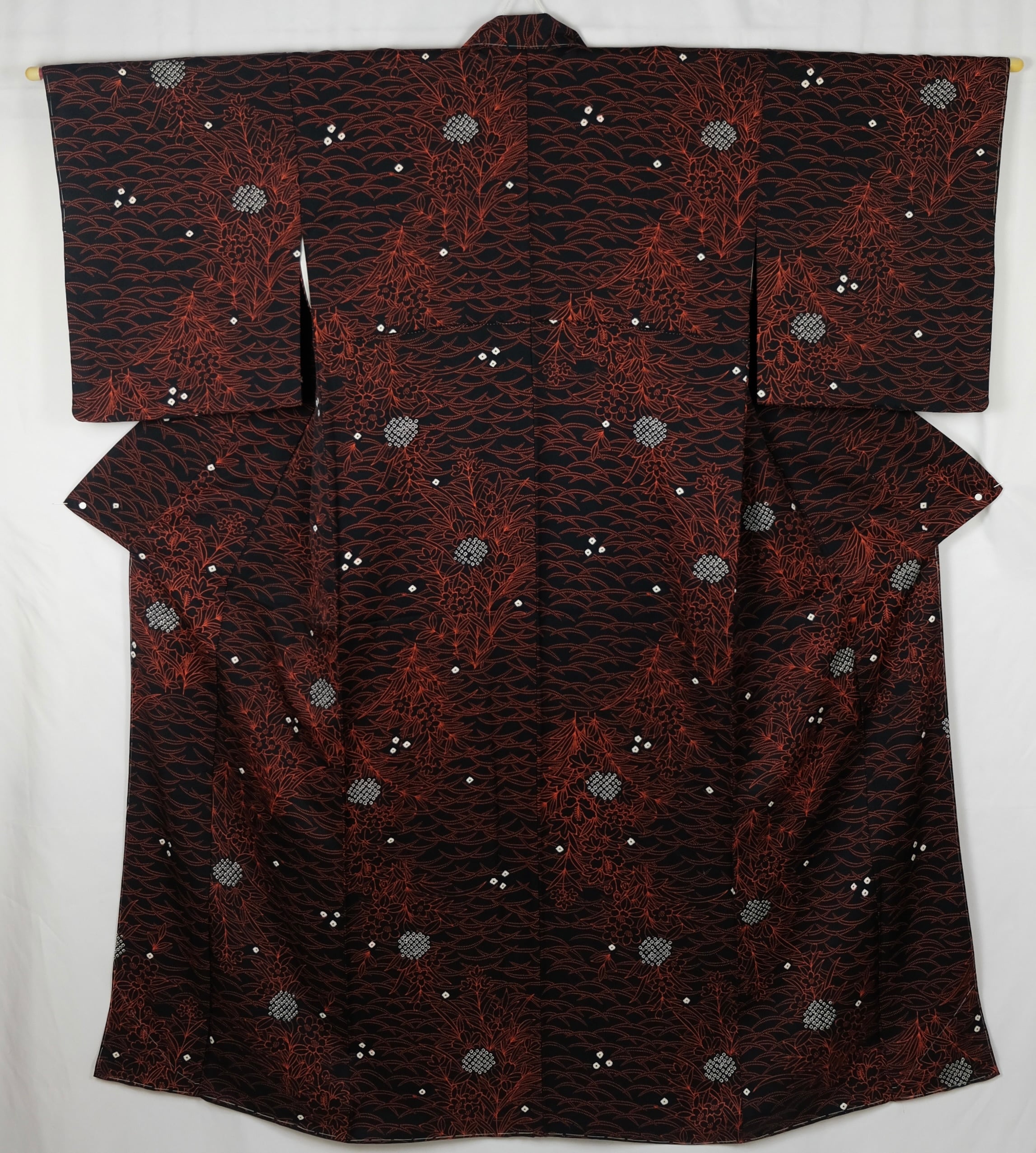全体を引き締める黒地に、赤で笹の葉と桔梗が デザインされた印象的な小紋です。