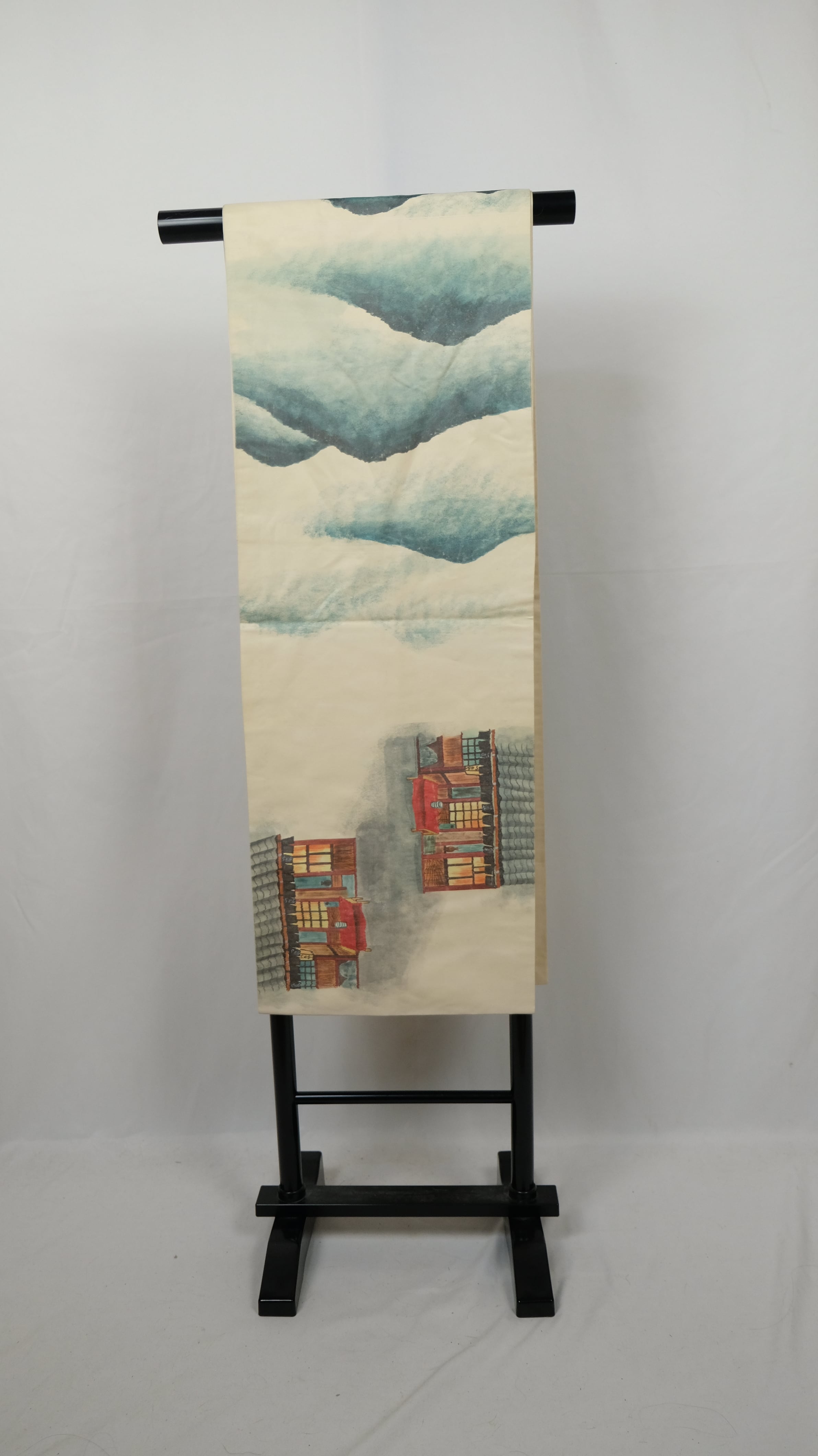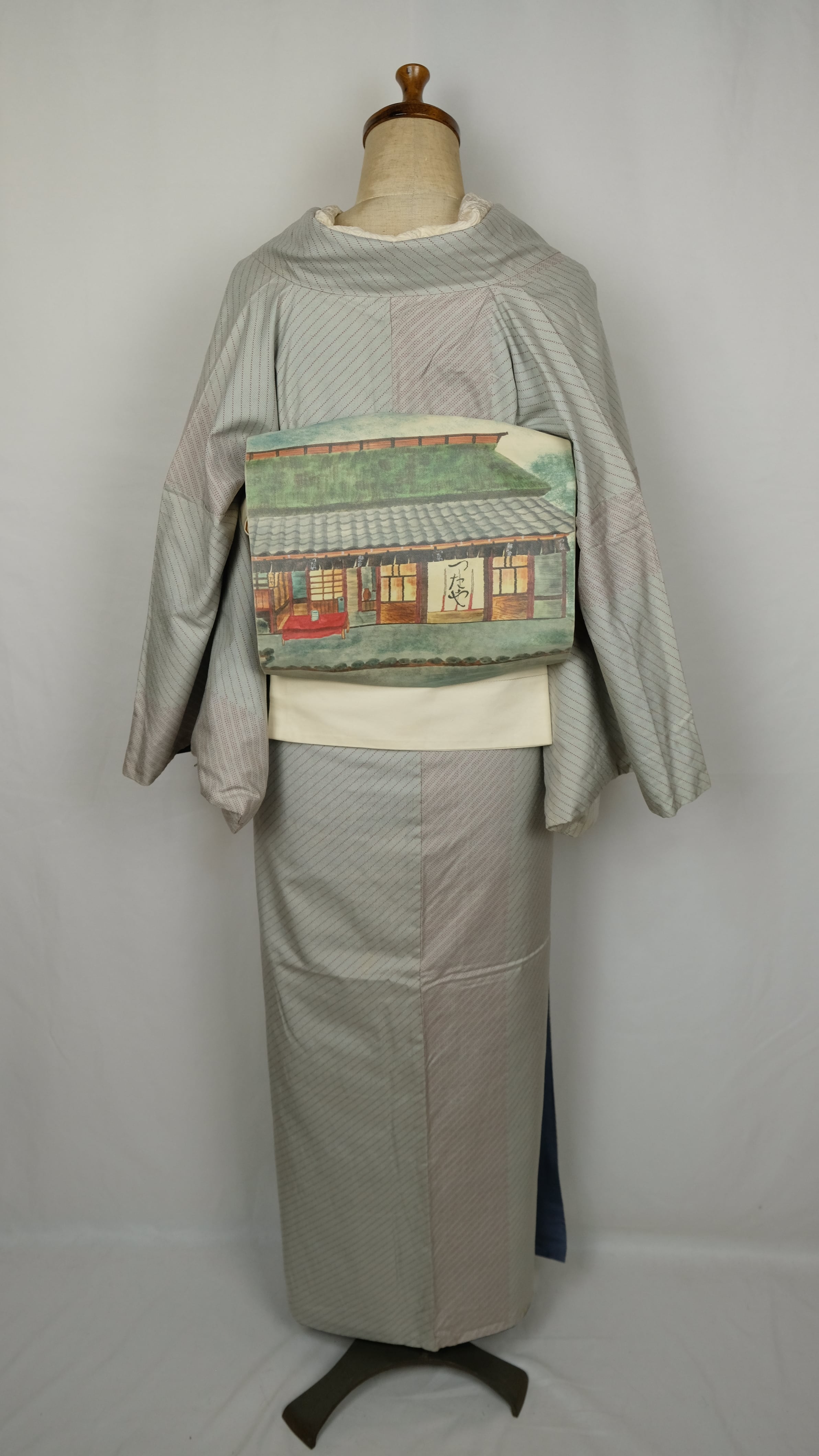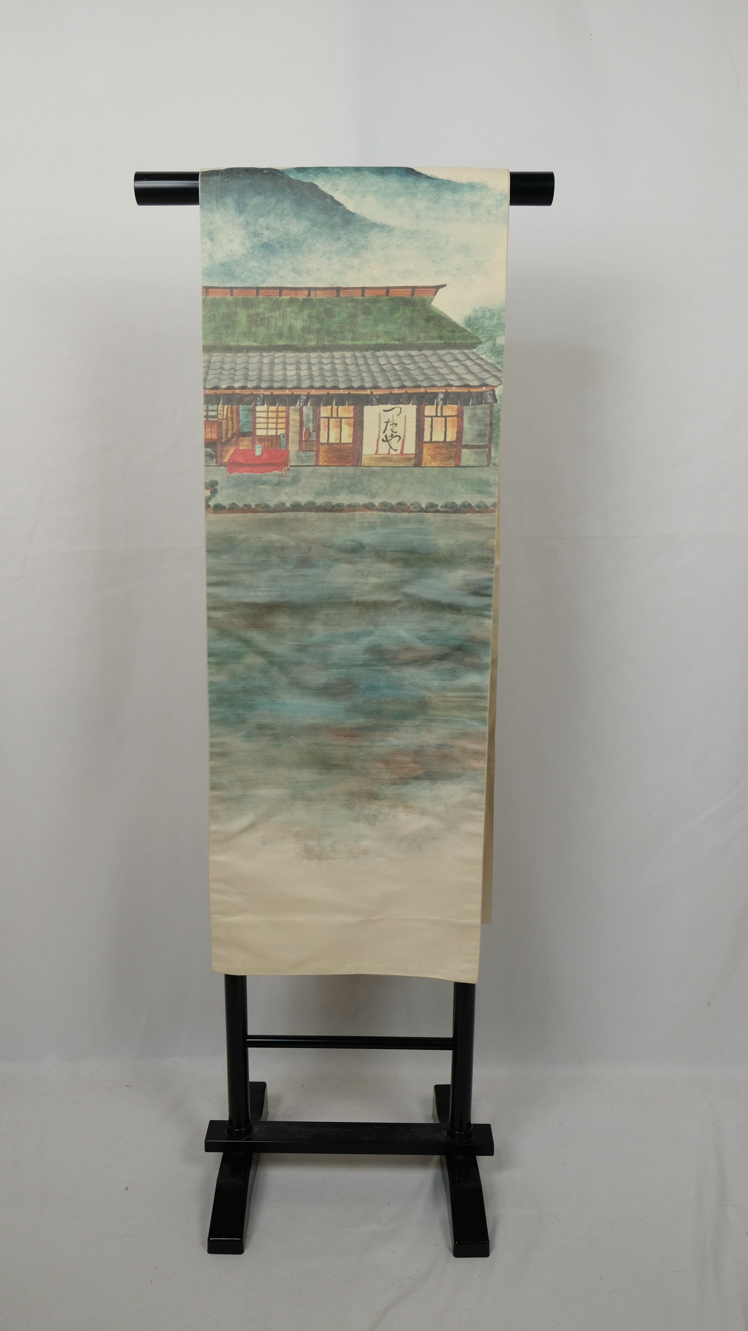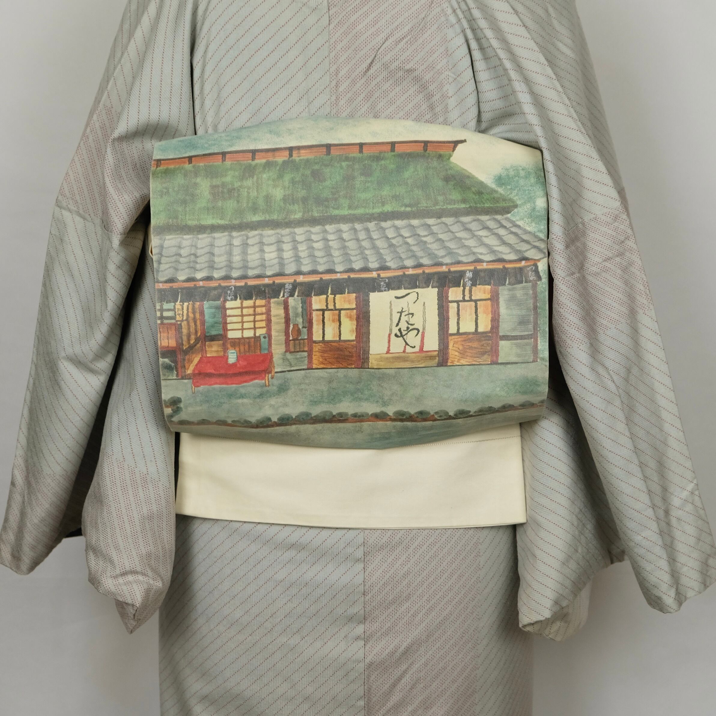白地をベースに、カラーで「鮎の宿つたや」と思われる建物が全面に描かれた開き名古屋帯です。現在も京都に残るお店と明らかにわかる図柄で、調べてみると実際の外観ともよく似ており、物語性を感じさせるユニークなデザイン。