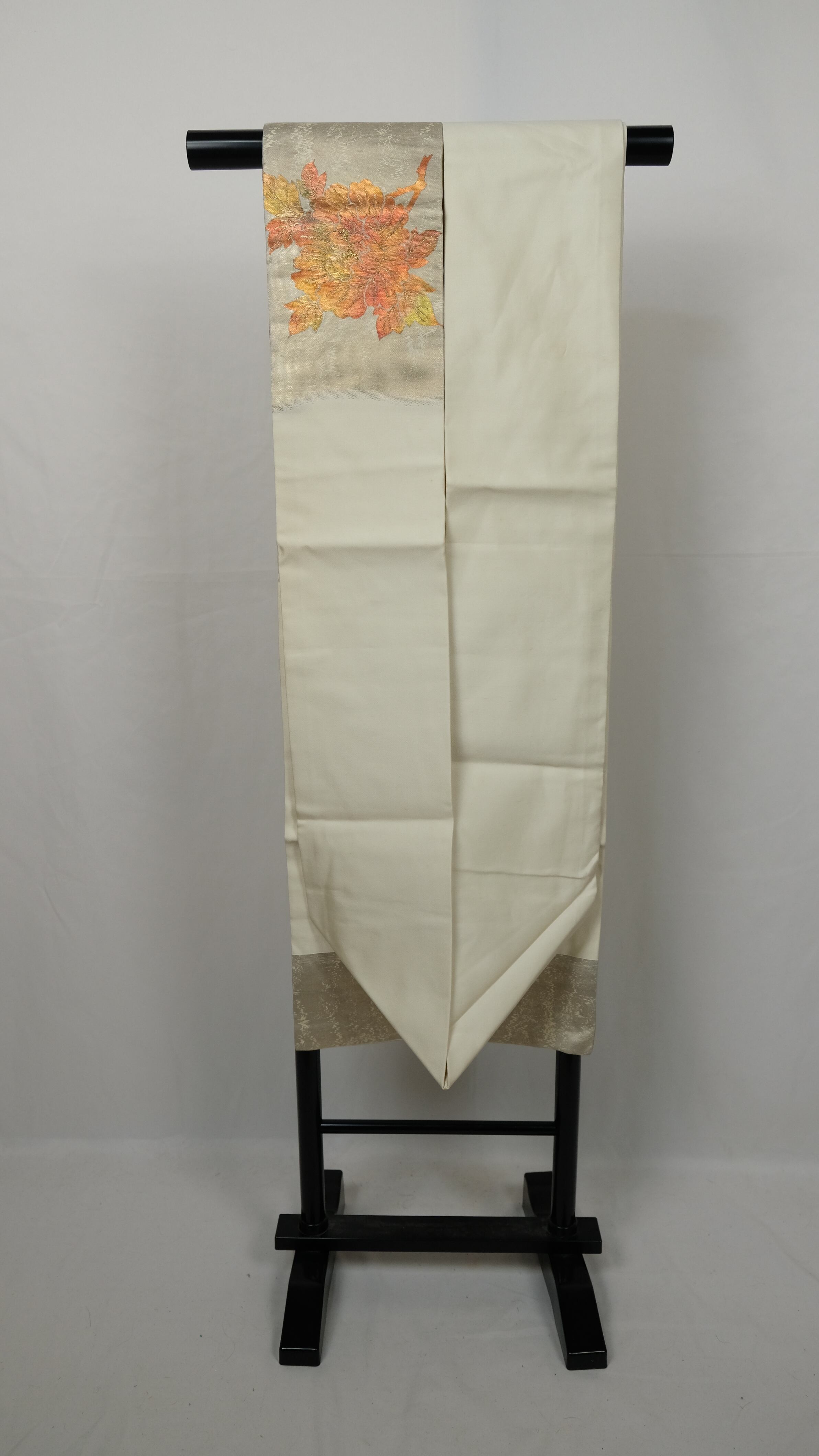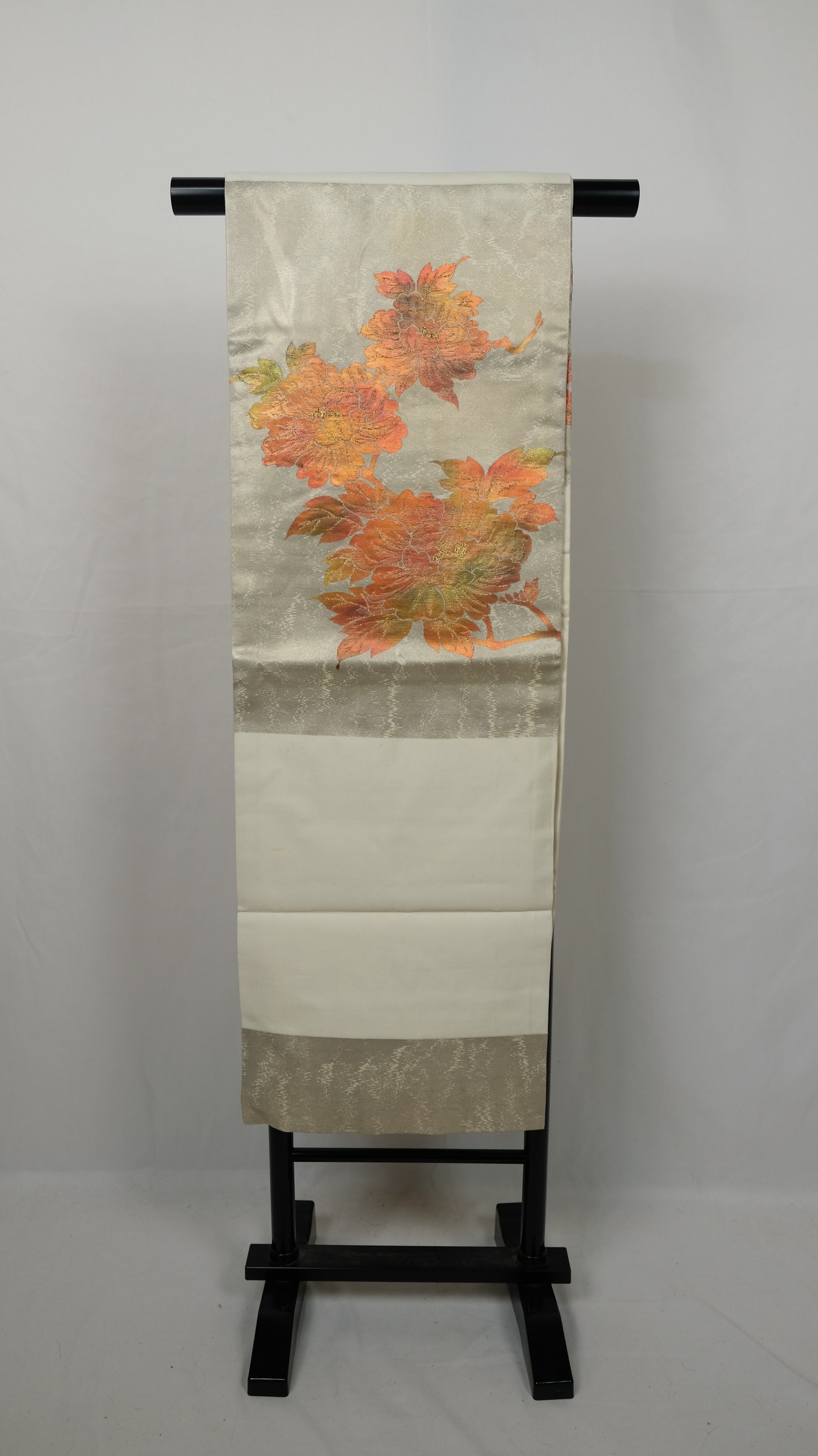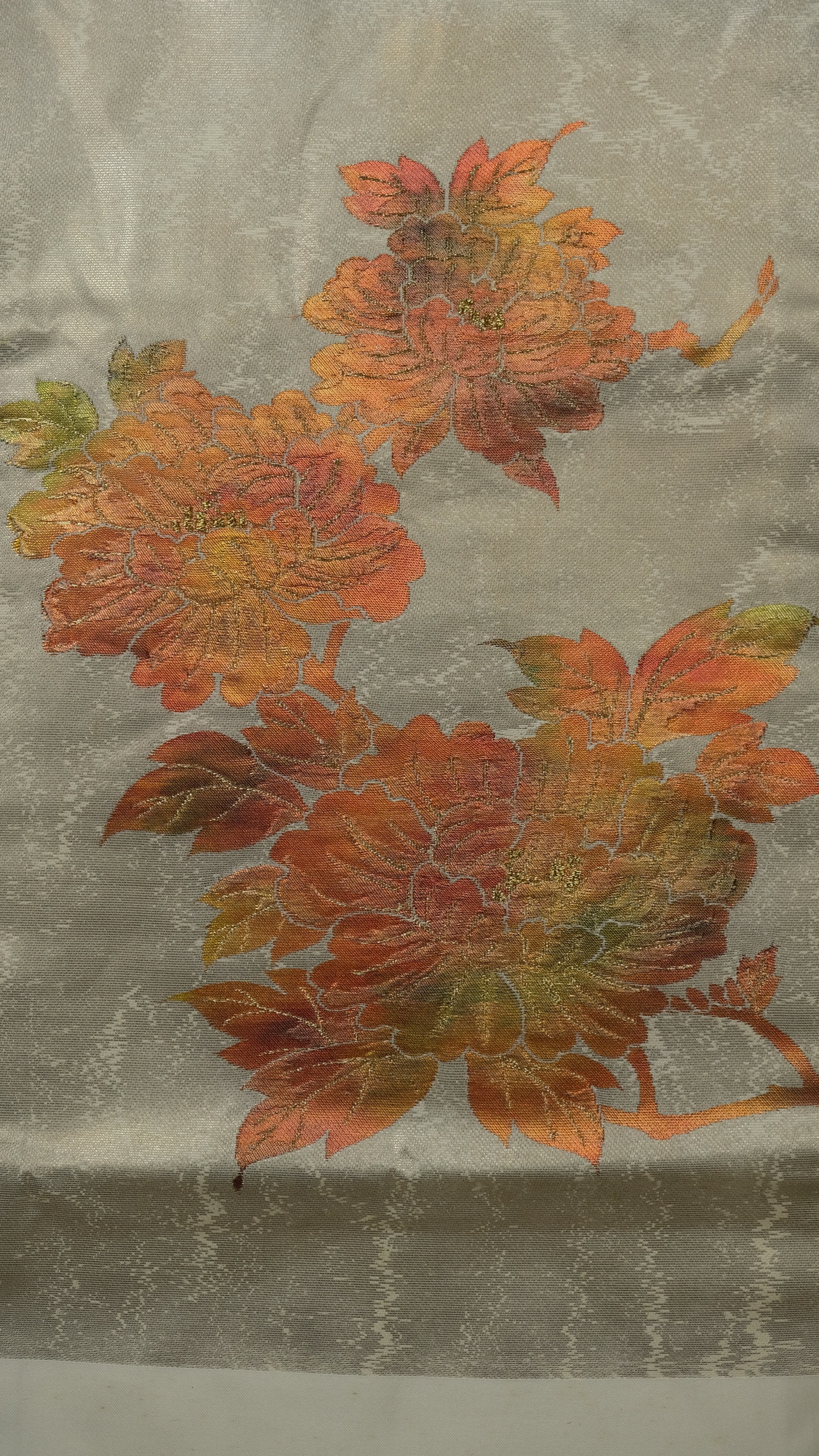 オレンジ味を帯びたきらめきのある糸で牡丹が描かれており、光沢感がありながらも実際に締めると派手すぎず、落ち着いた品の良さが感じられる仕上がり。