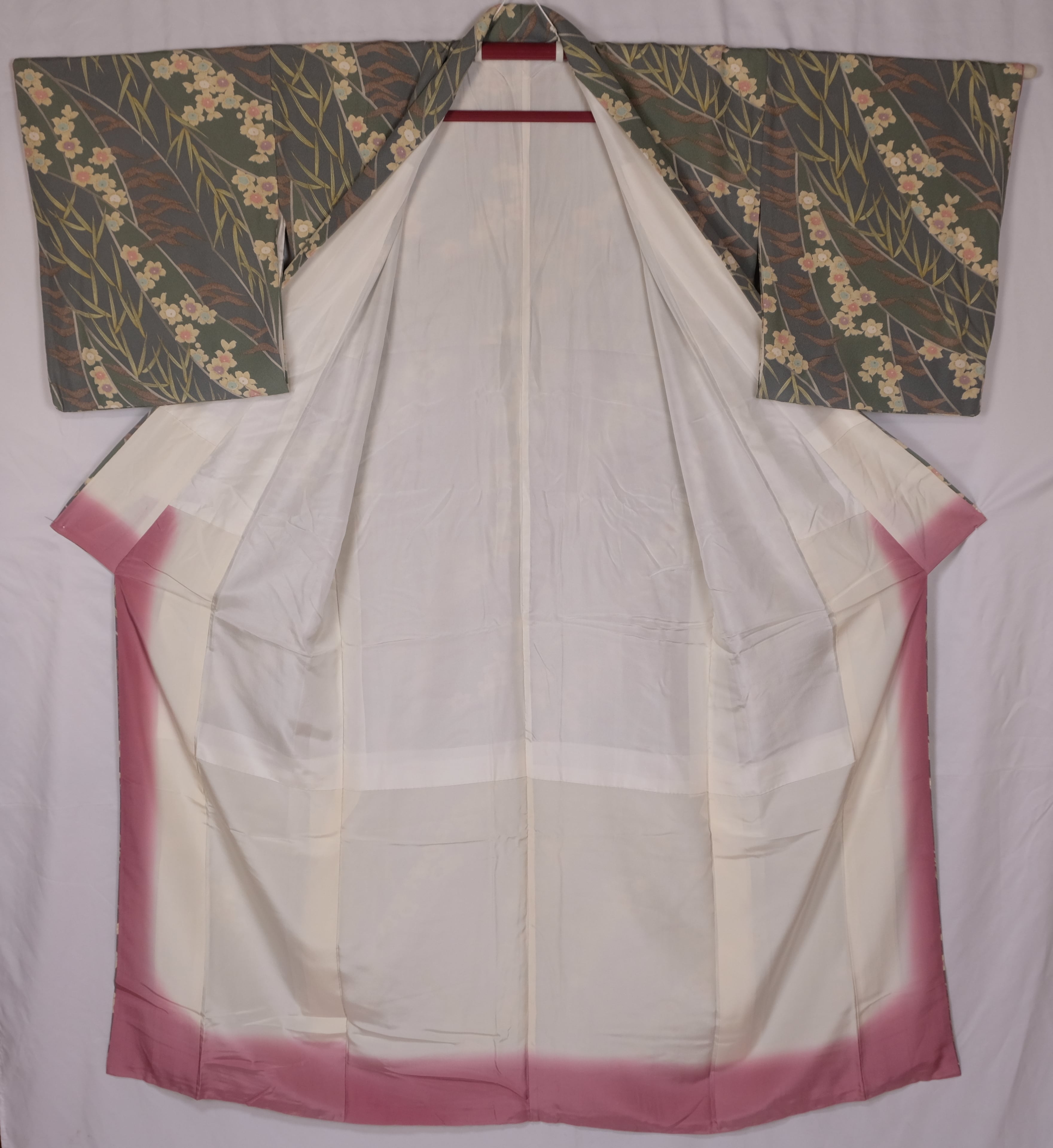 落ち着いたグレー地に、桜や笹などの植物が細やかに描かれた小紋着物。